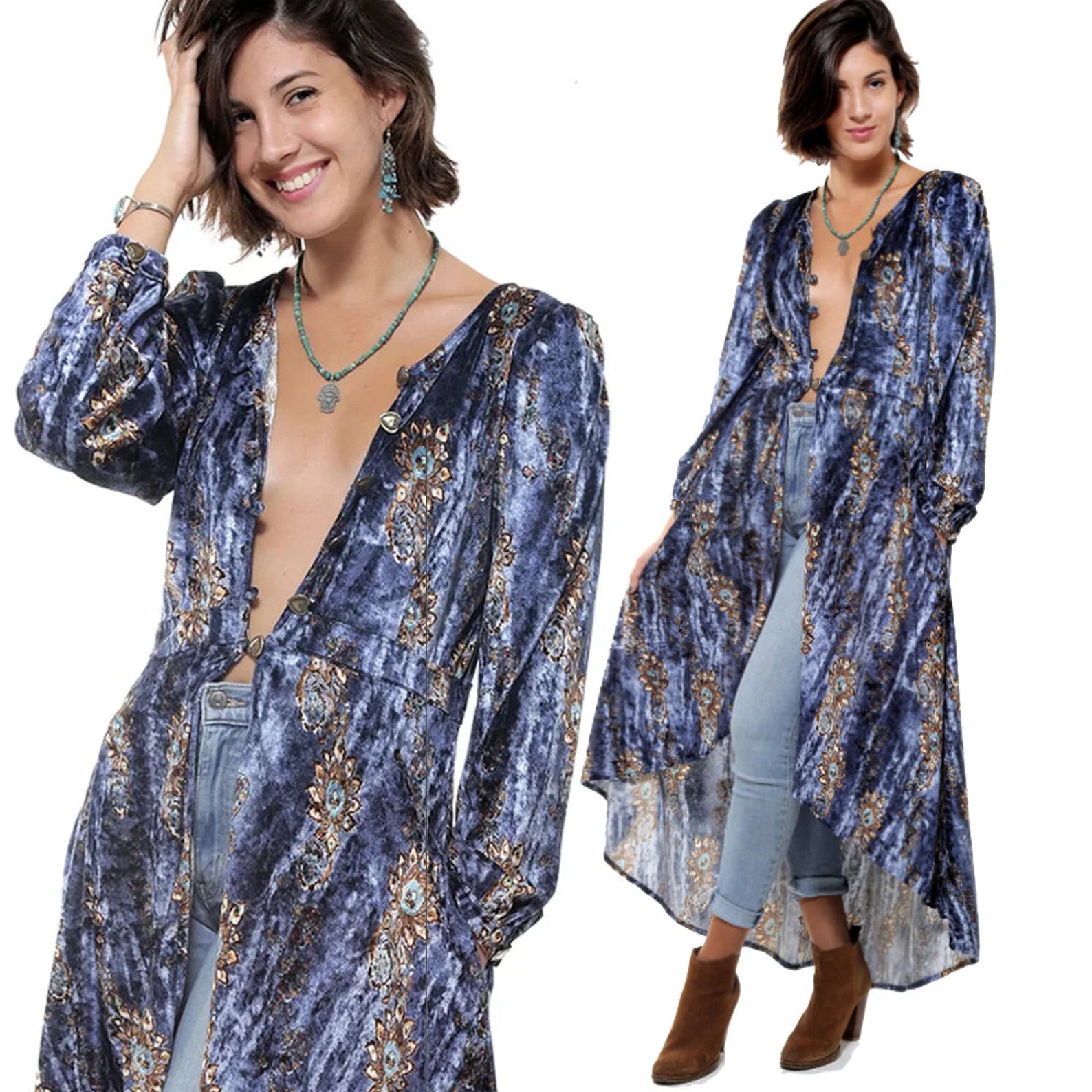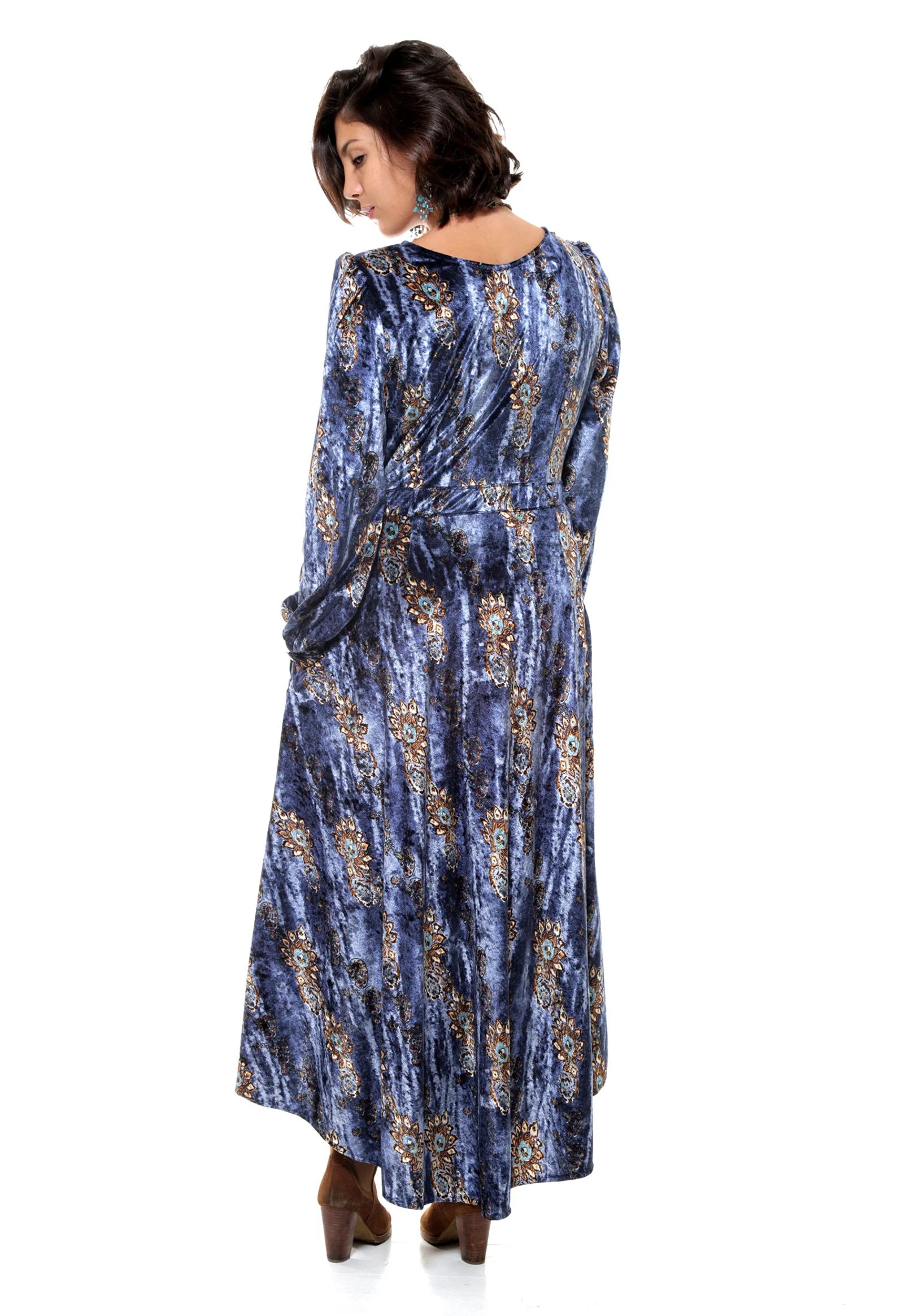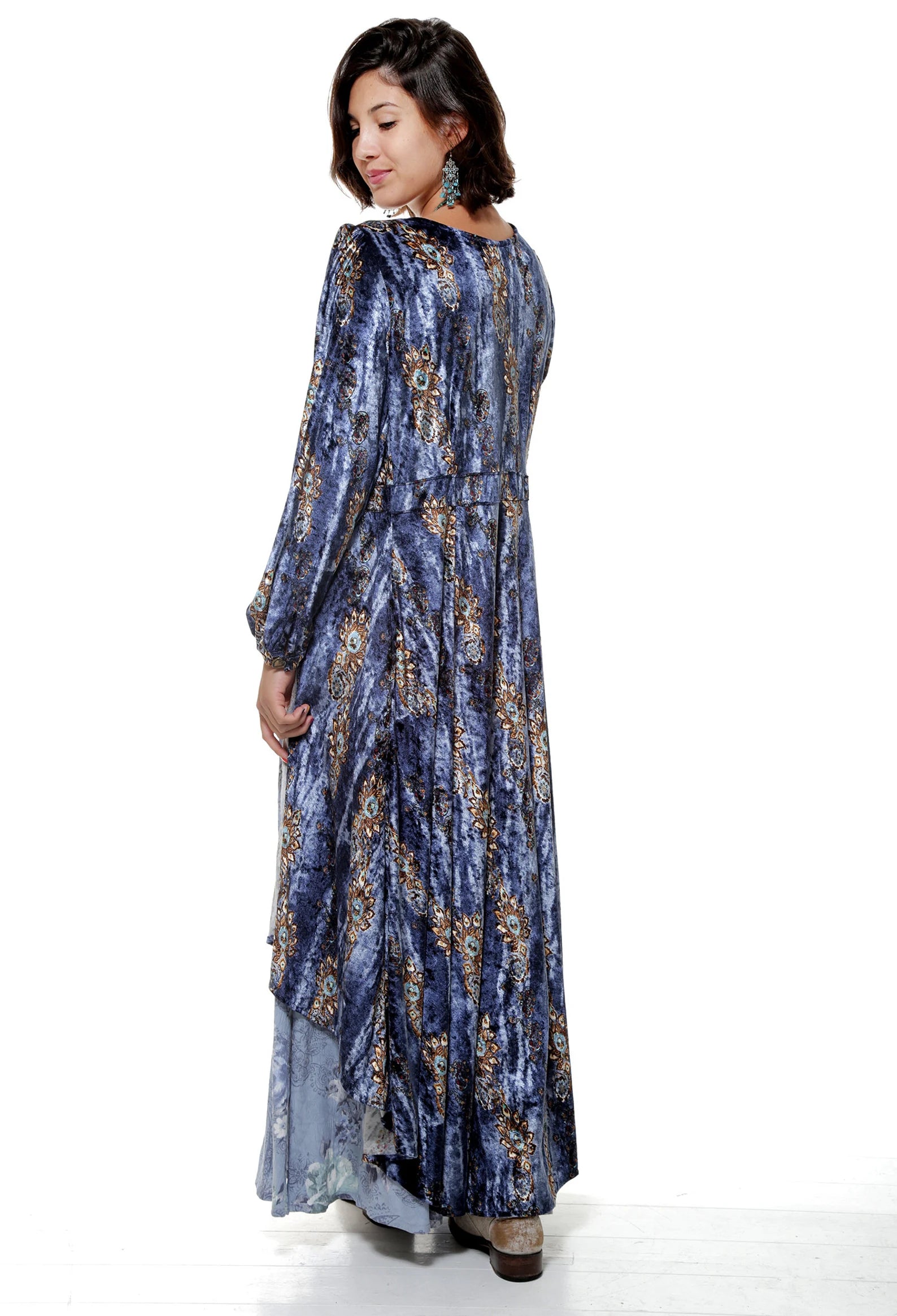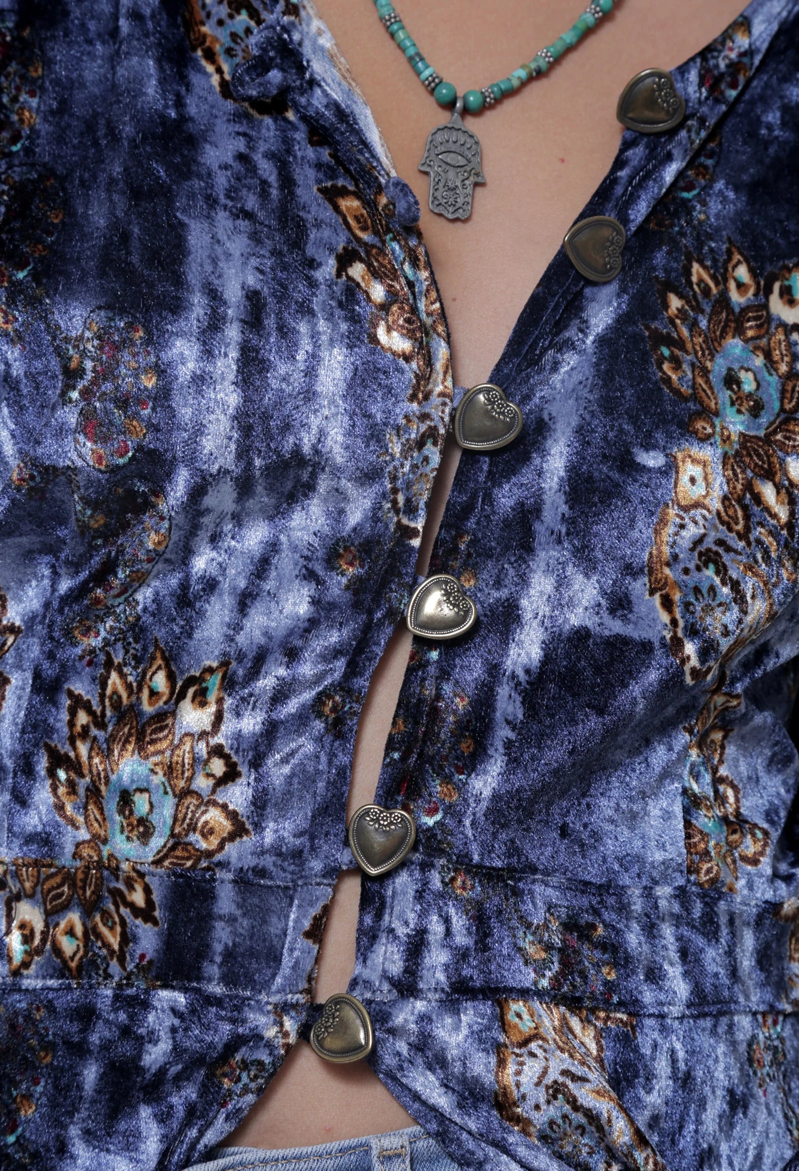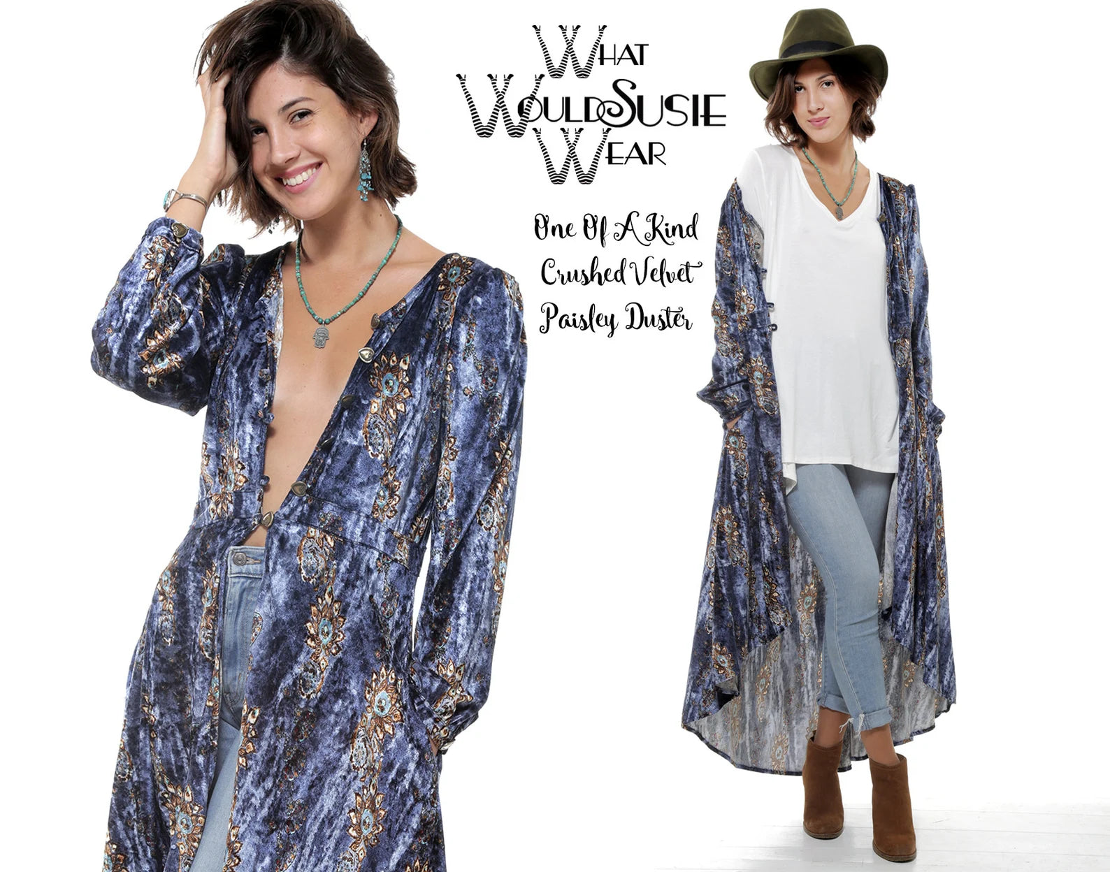 ONE OF A KIND! WhatWouldSusieWear Blue Paisley Crushed Velvet Duster Jacket is a One Of A Kind. Super soft fabric. Subtle Metal Heart Buttons close the front of the jacket and the Poet Sleeves. Great movement.Looks great over a dress or pair of jeans, super flowey and so much fun to wear! Super cool! This Item is Not Returnable, as this is a One OF a Kind piece. Please check measurements to make sure it works for you.