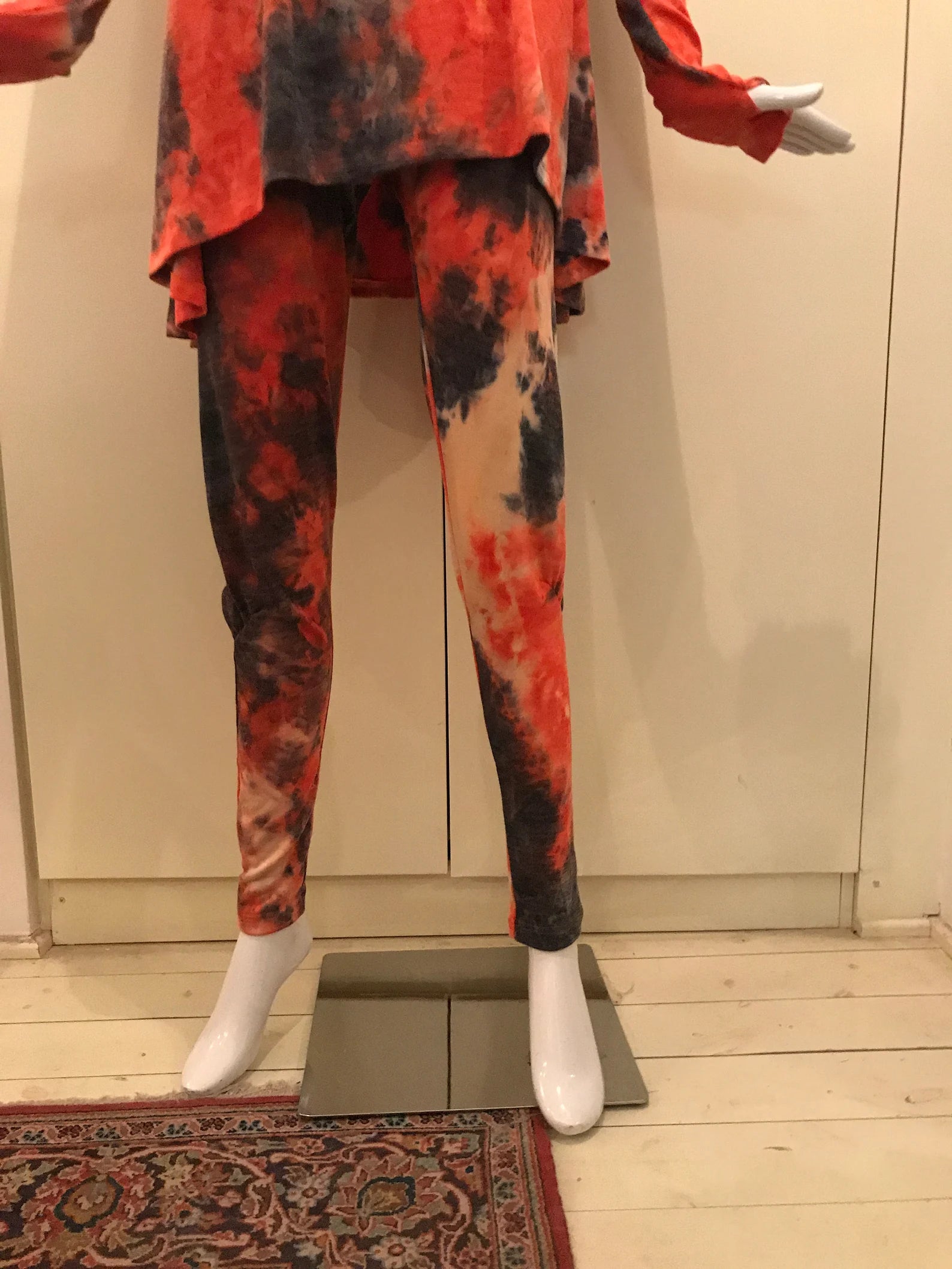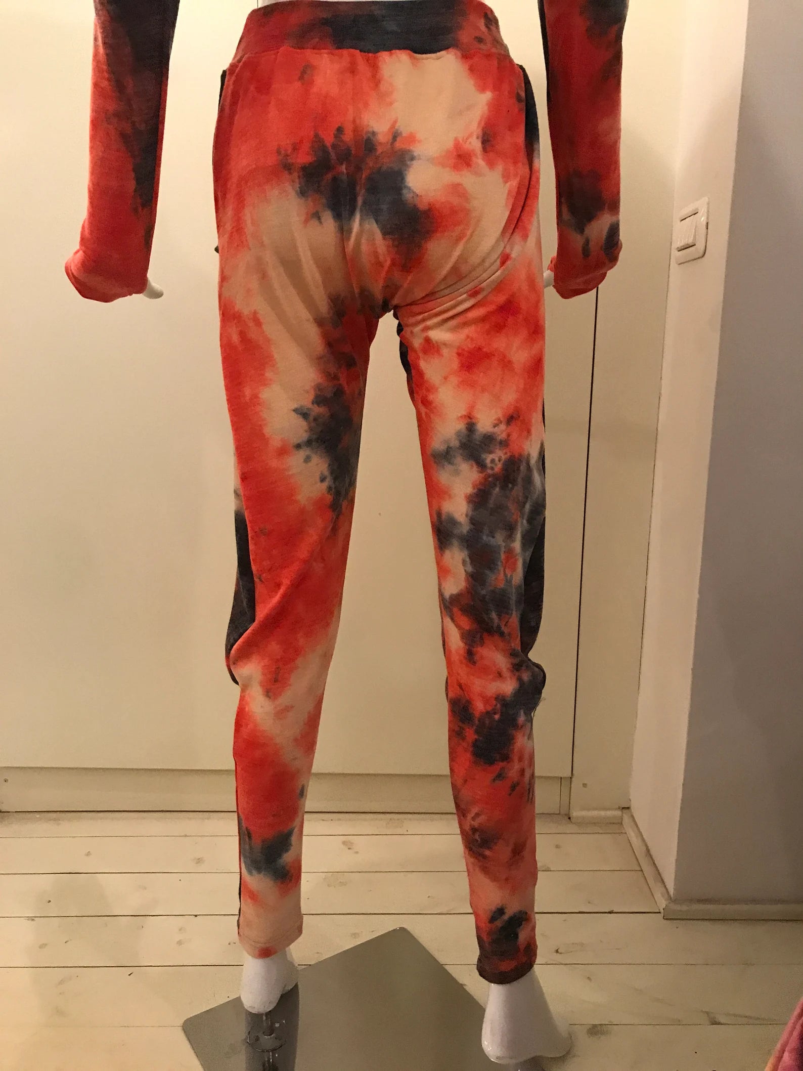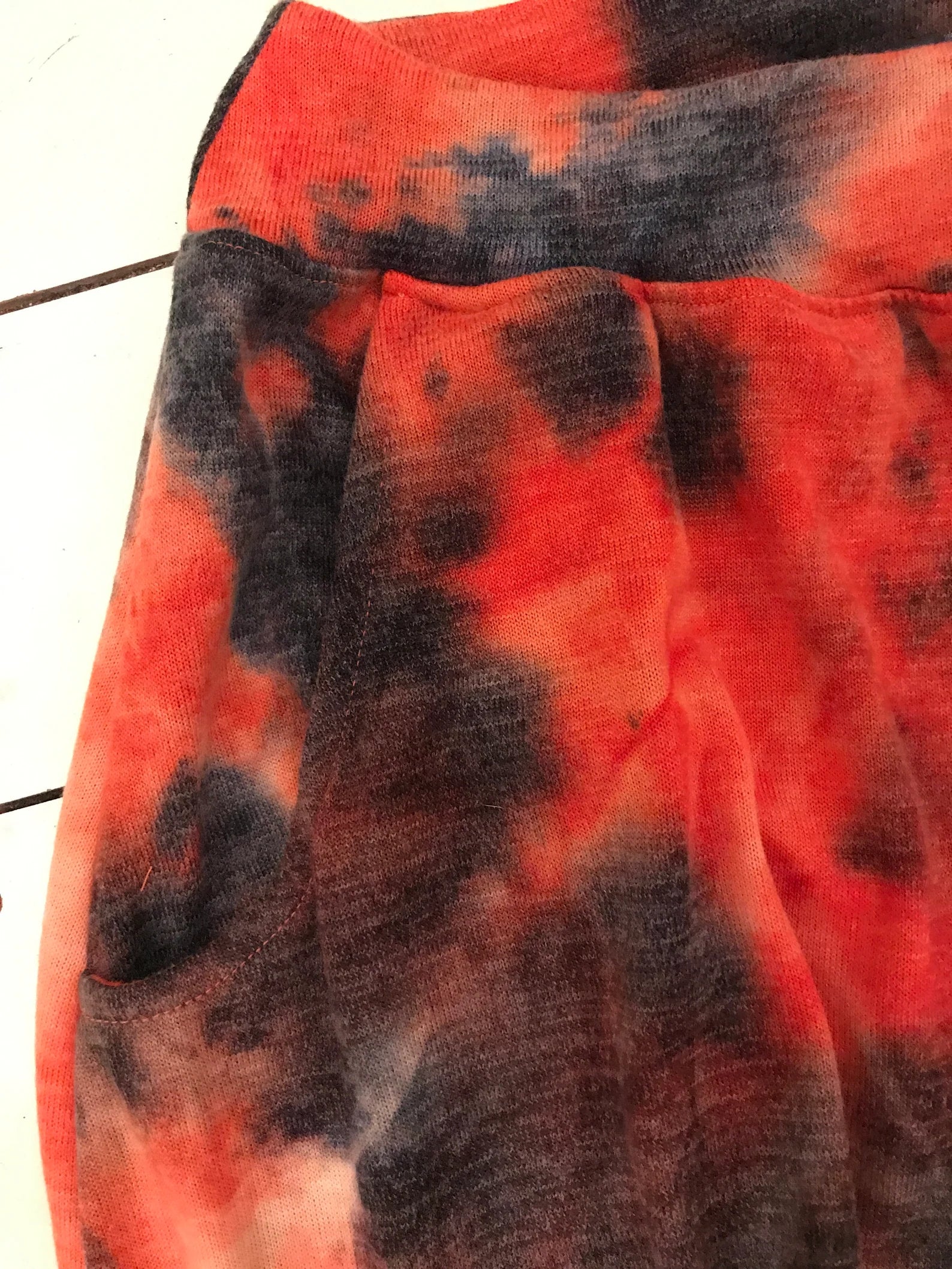 New! Orange and Black Tie Dye Drop Crotch Pants/Leggings with dropped crotch, elastic waist and pockets. Super fabulously comfortable pajama like, cashmerey feeling pants to wear out, but comfortable enough to wear to bed, or wear to yoga class! A little extra detail around the knee, that cascades into a tighter fitting calf to foot. Made long to easily fit into your boots, or scrunch up. So deliciously soft you wont want to take them off! Fabulous colors, and look perfect with our matching Frenchies, or a black Frenchie top.