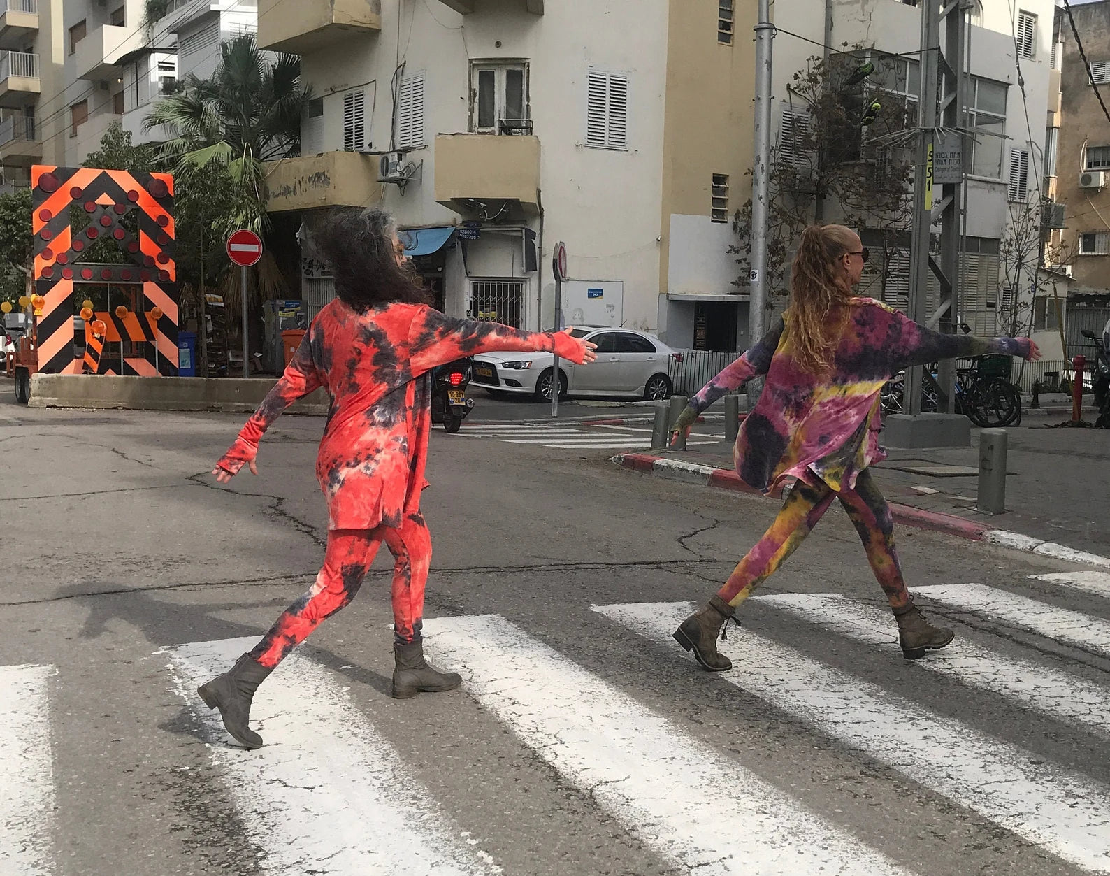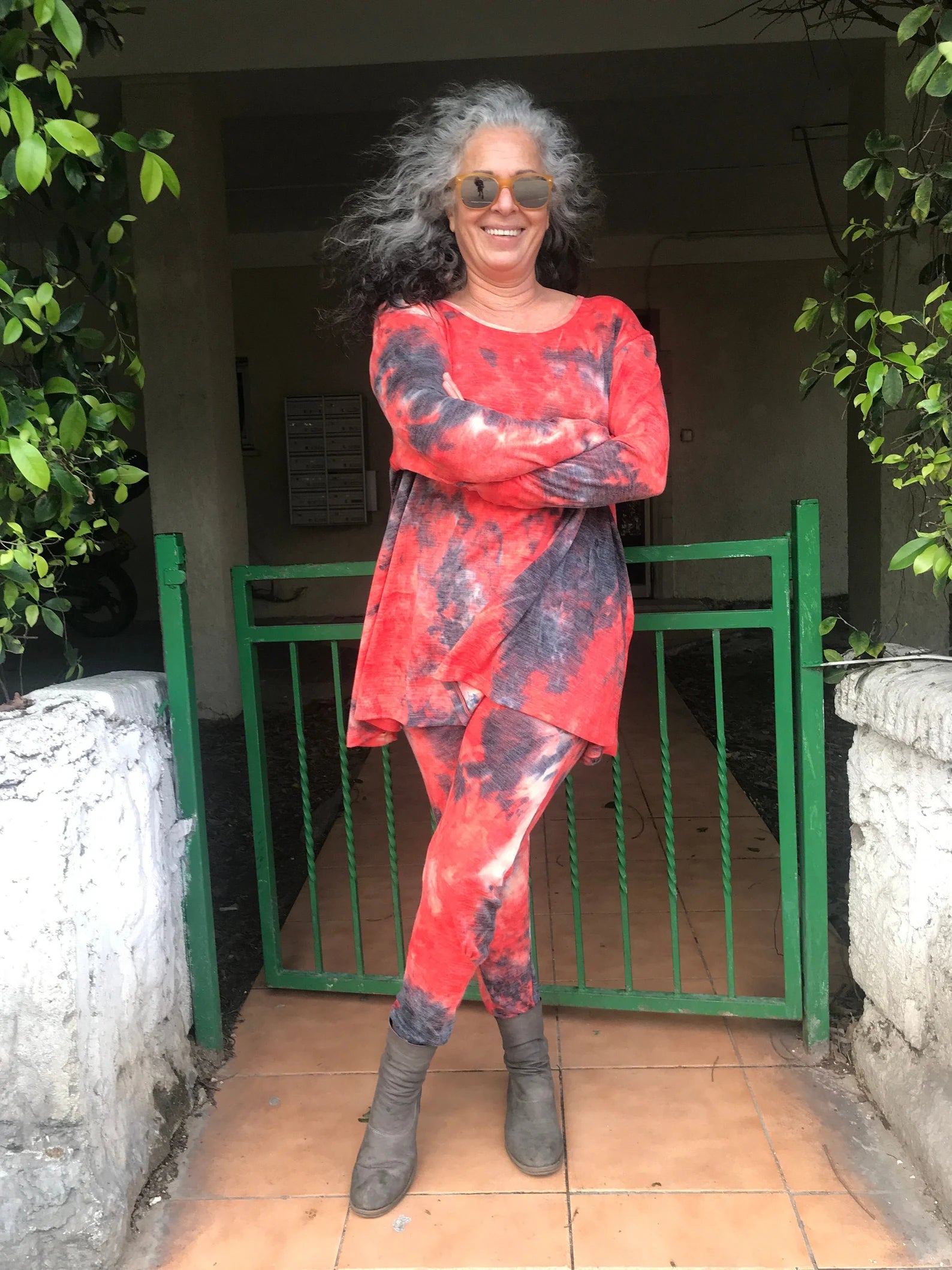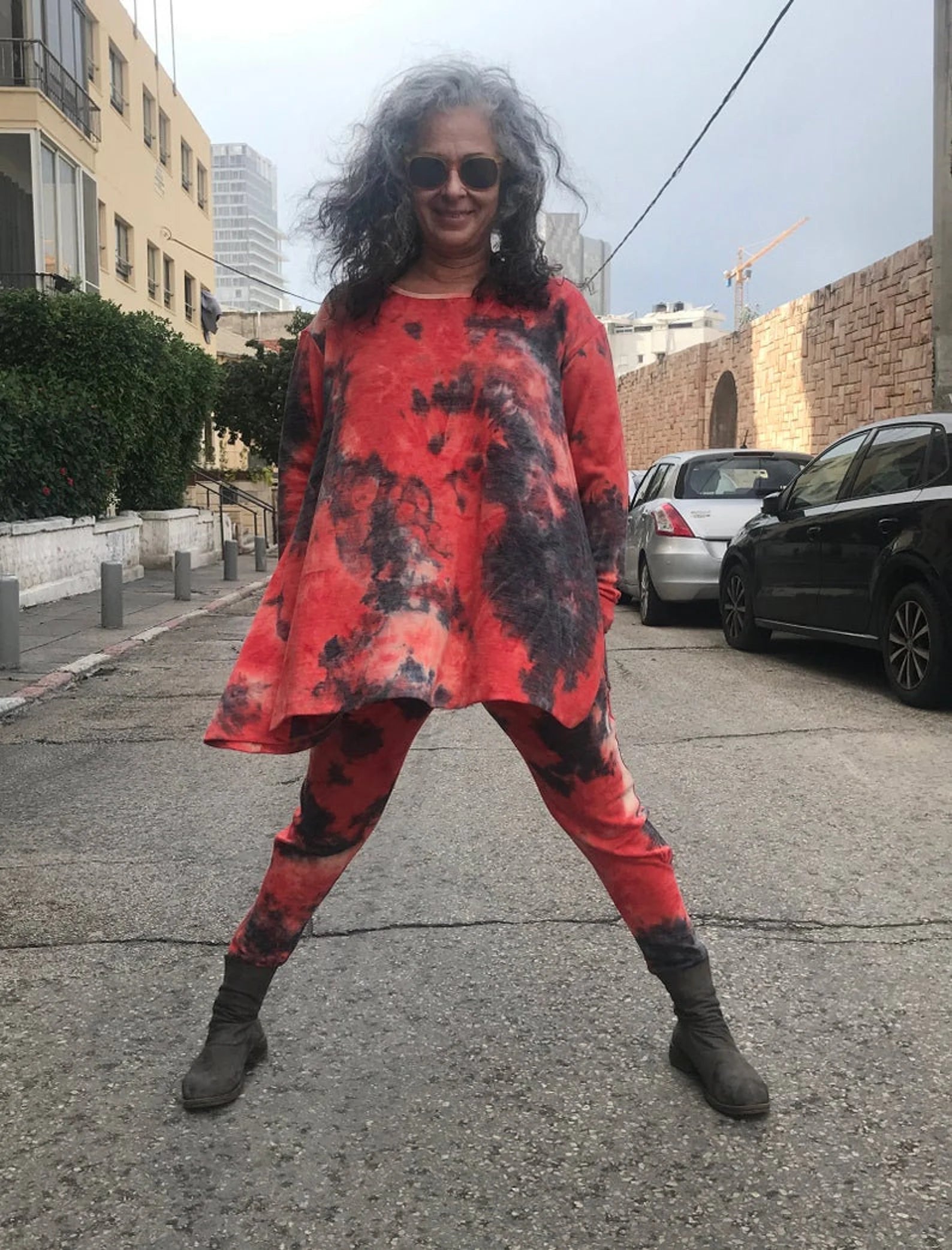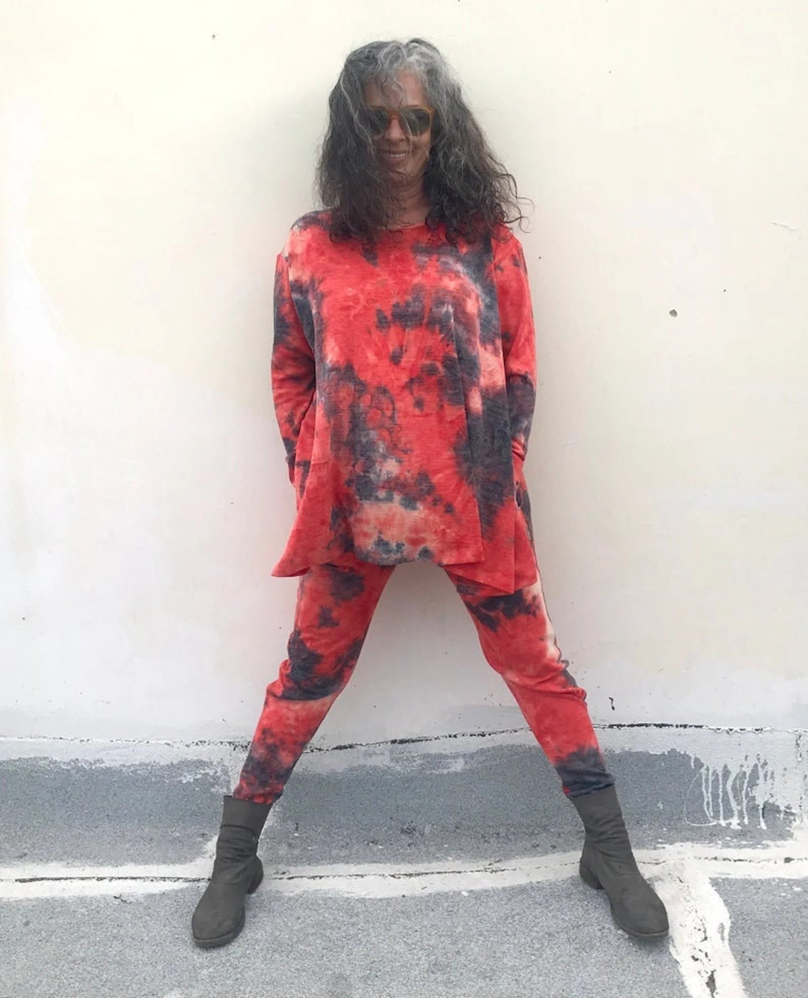 New! Orange and Black Tie Dye Drop Crotch Pants/Leggings with dropped crotch, elastic waist and pockets. Super fabulously comfortable pajama like, cashmerey feeling pants to wear out, but comfortable enough to wear to bed, or wear to yoga class! A little extra detail around the knee, that cascades into a tighter fitting calf to foot. Made long to easily fit into your boots, or scrunch up. So deliciously soft you wont want to take them off! Fabulous colors, and look perfect with our matching Frenchies, or a black Frenchie top.