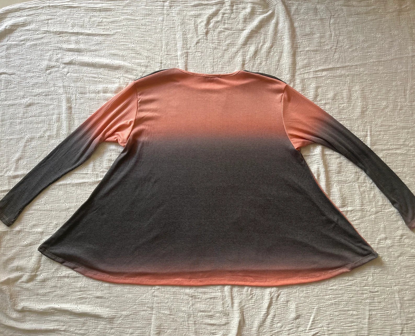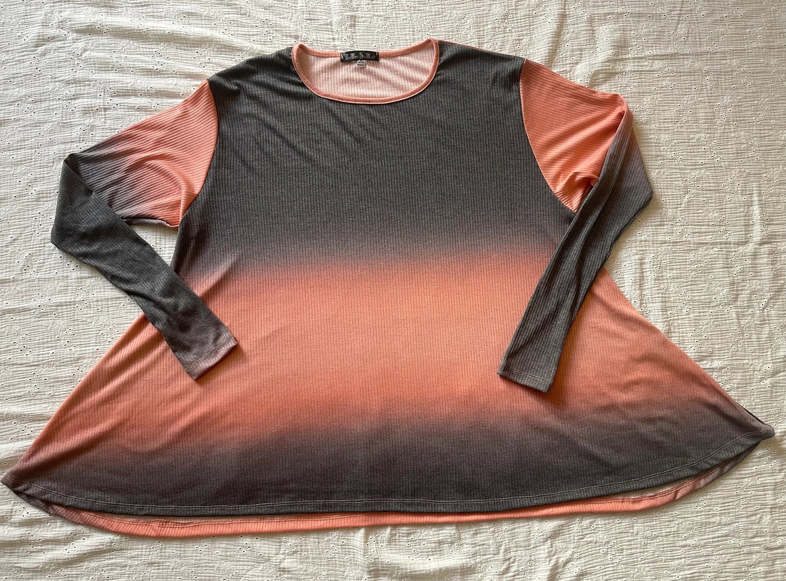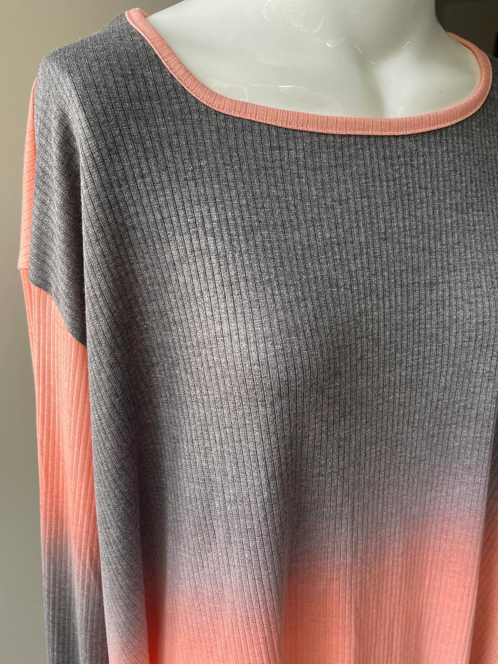 Melony Orange and Greyish Black Ombre Ribbed Frenchie Flare Long SLeeve Top with Thumbholes. Lovely Brushed Rayon Spandex fabric. Super soft and cozy. Only ad enough material to make three, and just two left!