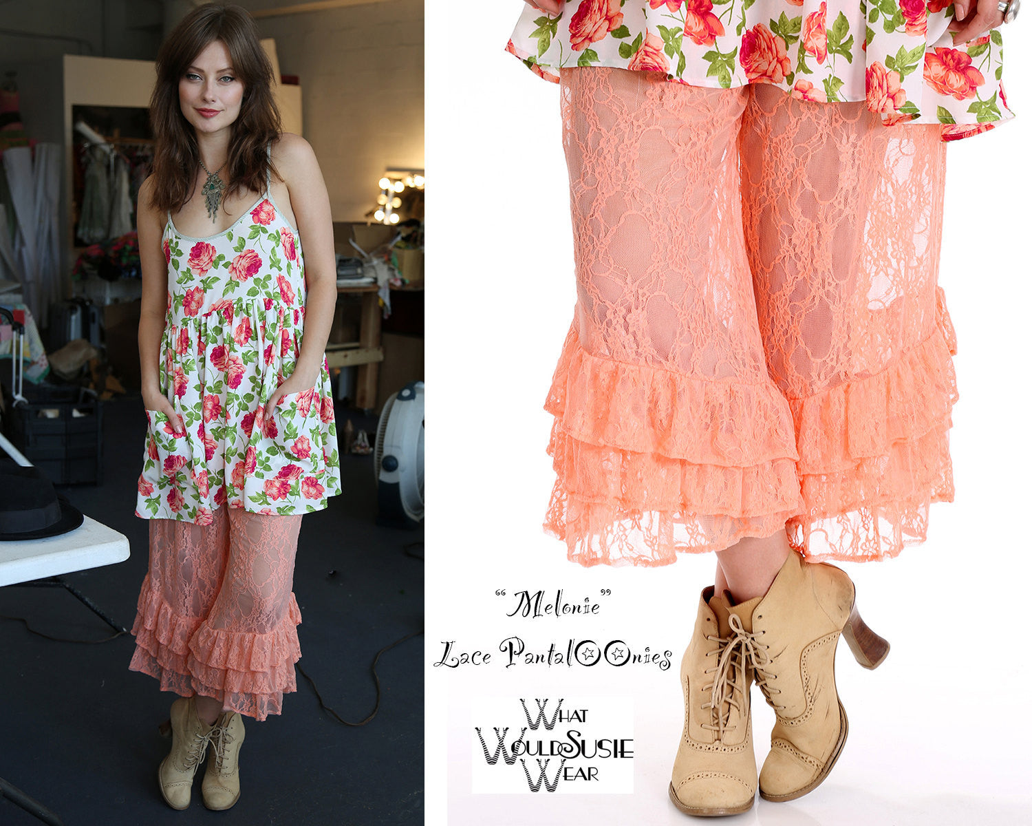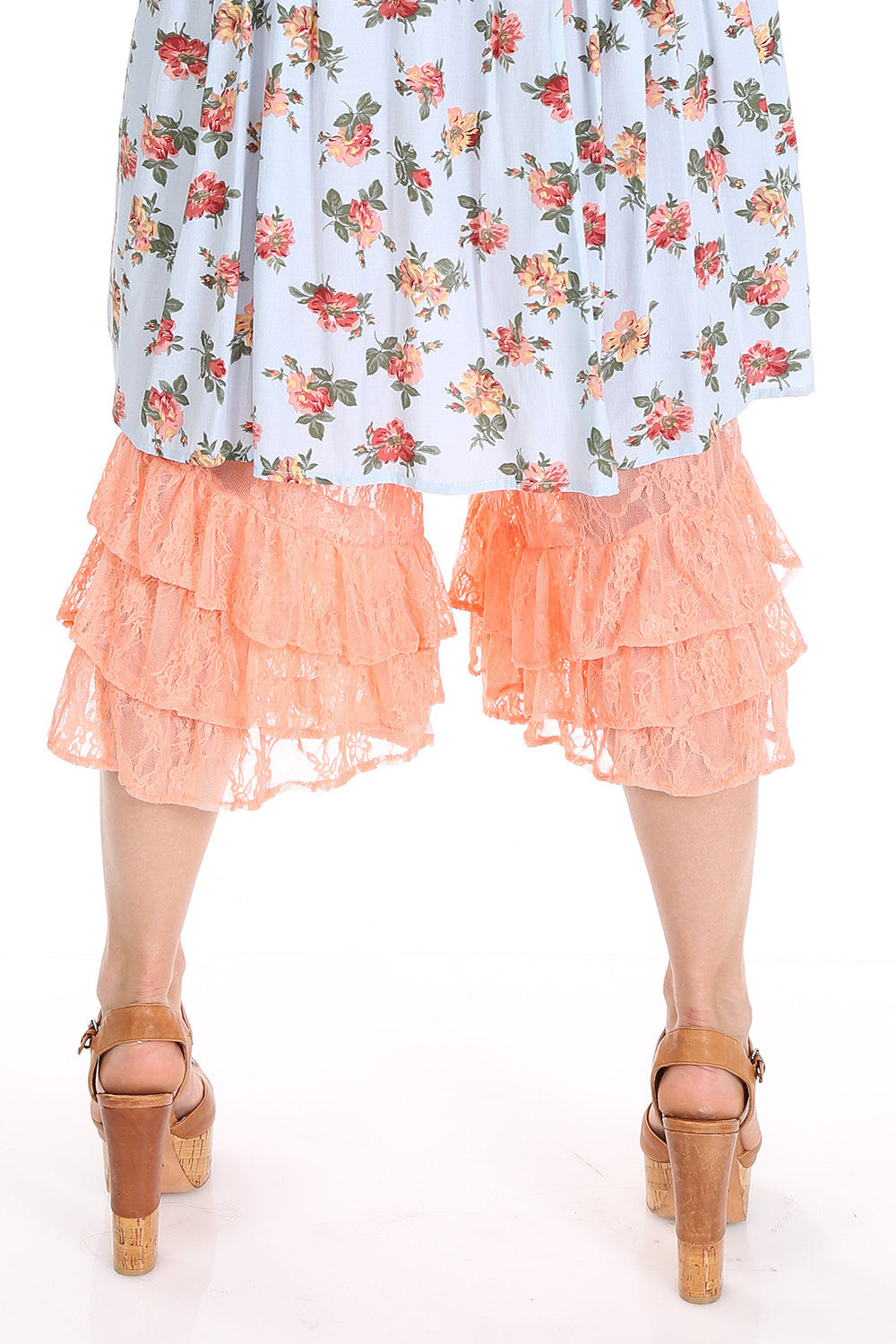Peach Lace PantalOONIE Bloomers. Lightweight, cool, chic and easy to wear. Great for Vacations, Resort Wear, and everyday wear. Shown here with our Rosa Mica Dress. Wear our Lacey PantalOOnies under a longer dress where you just see the ruffles peeking through. Made of Nylon Spandex and are soft and have an elasticized waist elasticized waist, come in two sizes, Petite-Medium and Large to Extra Large. The leg of the PantalOOnie's are the same in each size, just the elastic waist that is larger in XL.