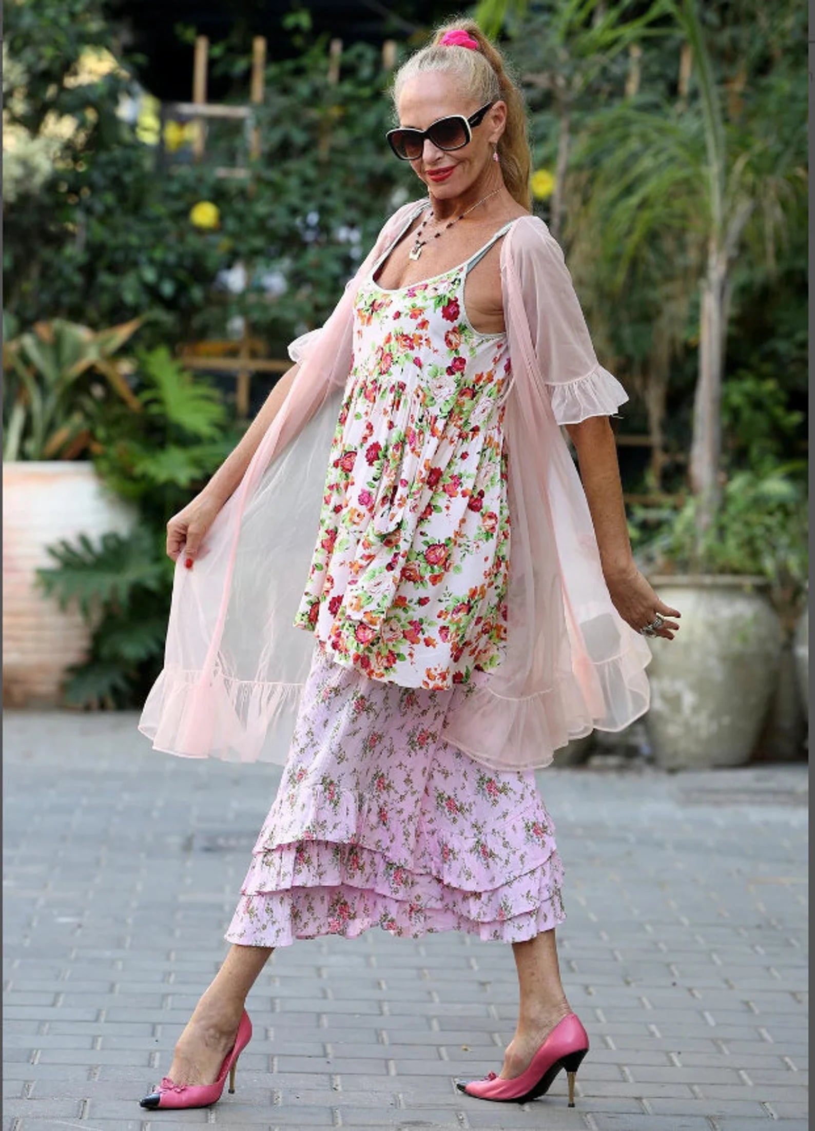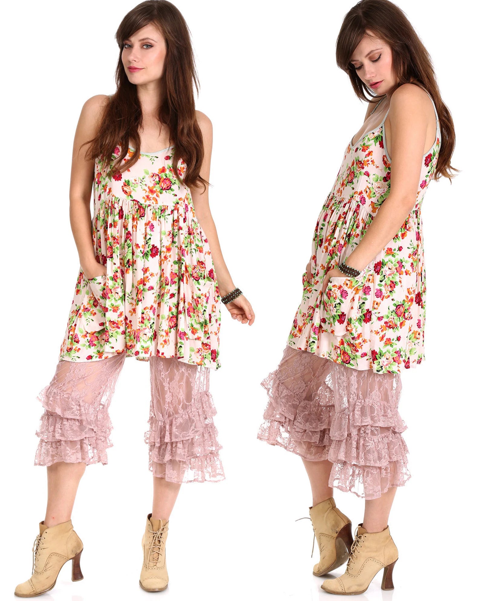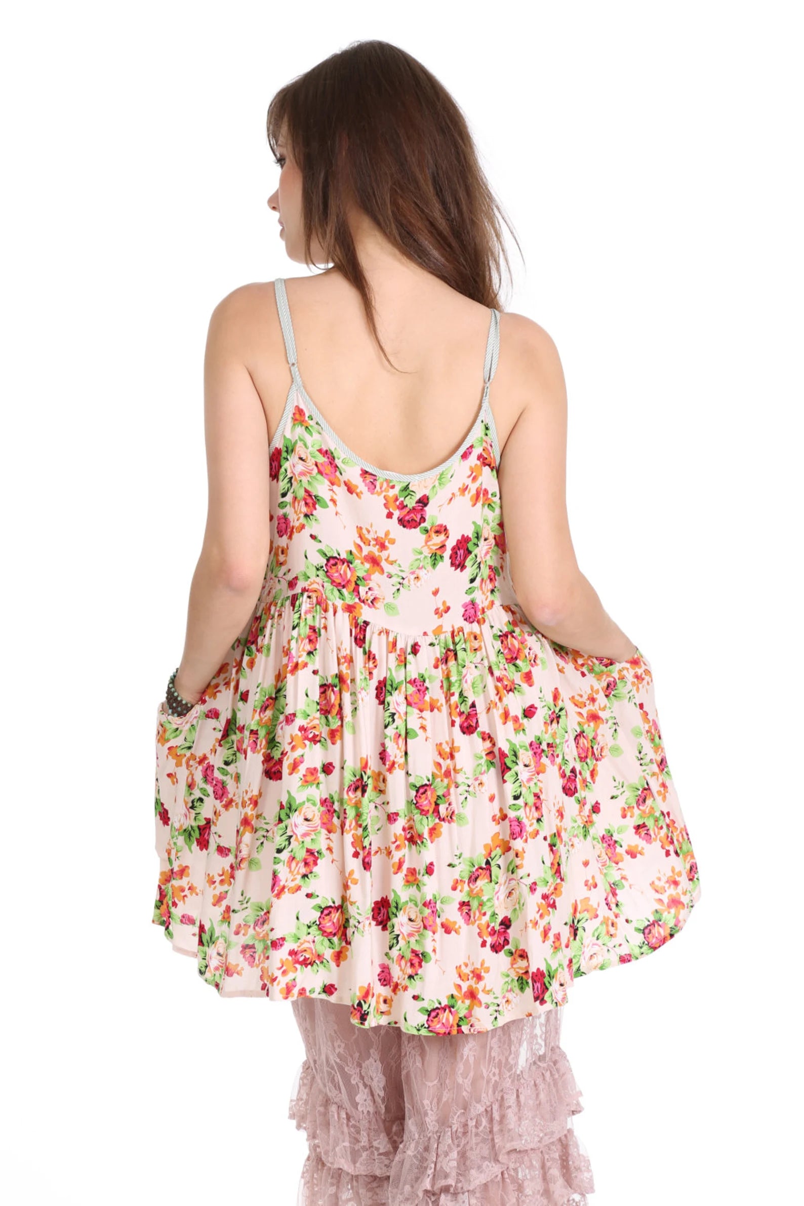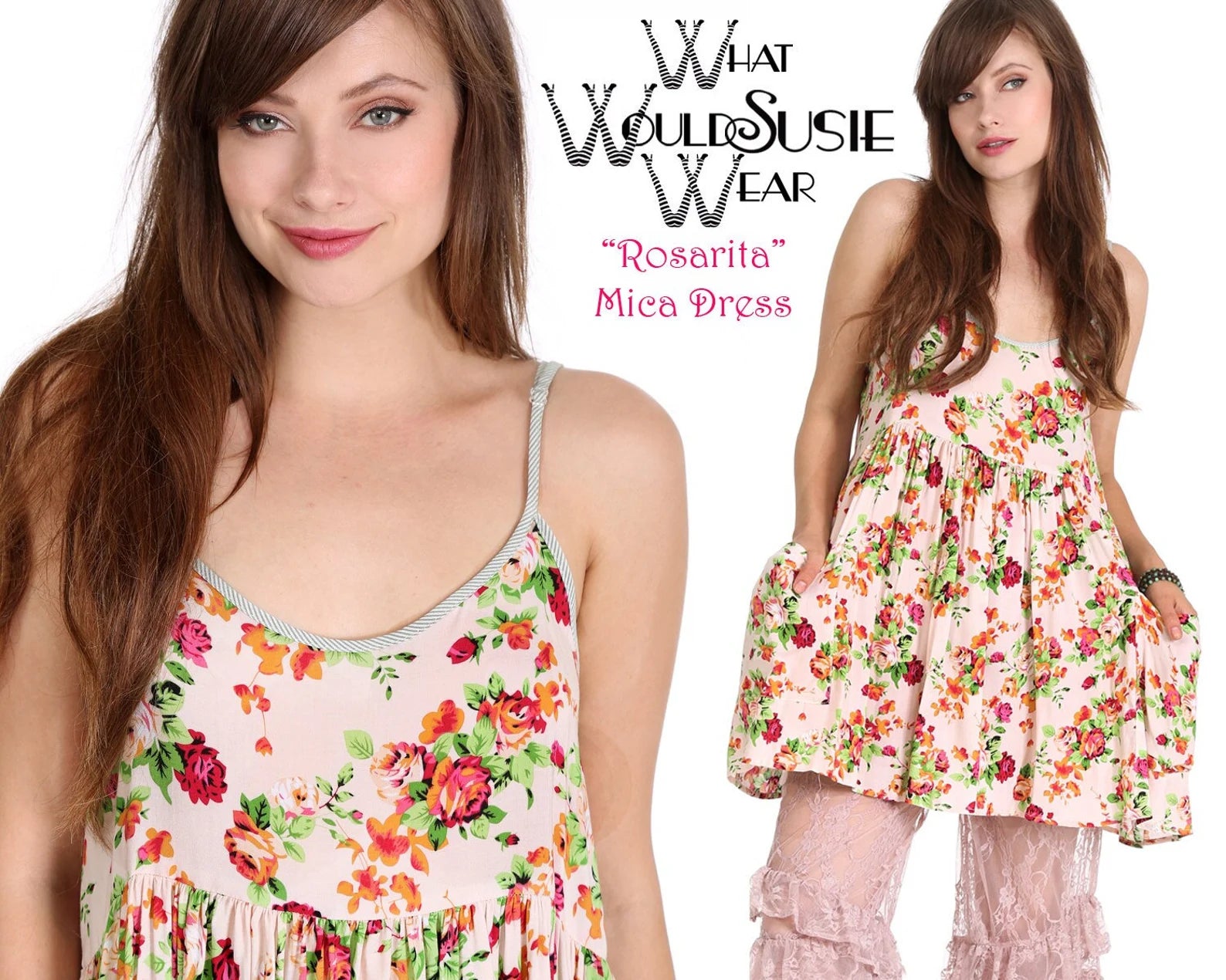 WhatWouldSusieWear Pink Floral Rosarita Mica Dress with Bouquets of Roses in Fuchsia & Orangey Roses with Minty Green Leaves, with contrasting Green and white striped bias, and of course with Pockets and adjustable straps! Great alone or with a pair of Pants, Shorts, or Our Black Lace or Striped or Floral PantalOOnies! Perfect to wear to the beach over your bathing sit, then just grab a pair of heels or boots and you are ready to go out for the night! Made in super soft, light and cozy Rayon Challis! Just a perfect easy breezy dress that you will wear again and again! Great for Pregnancy also!