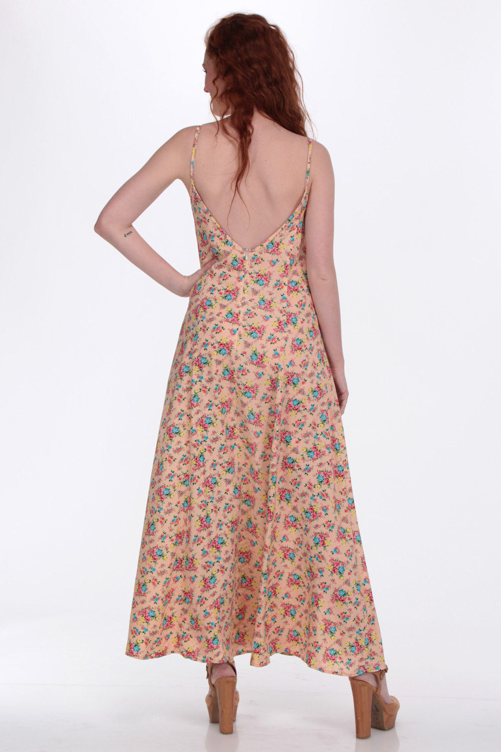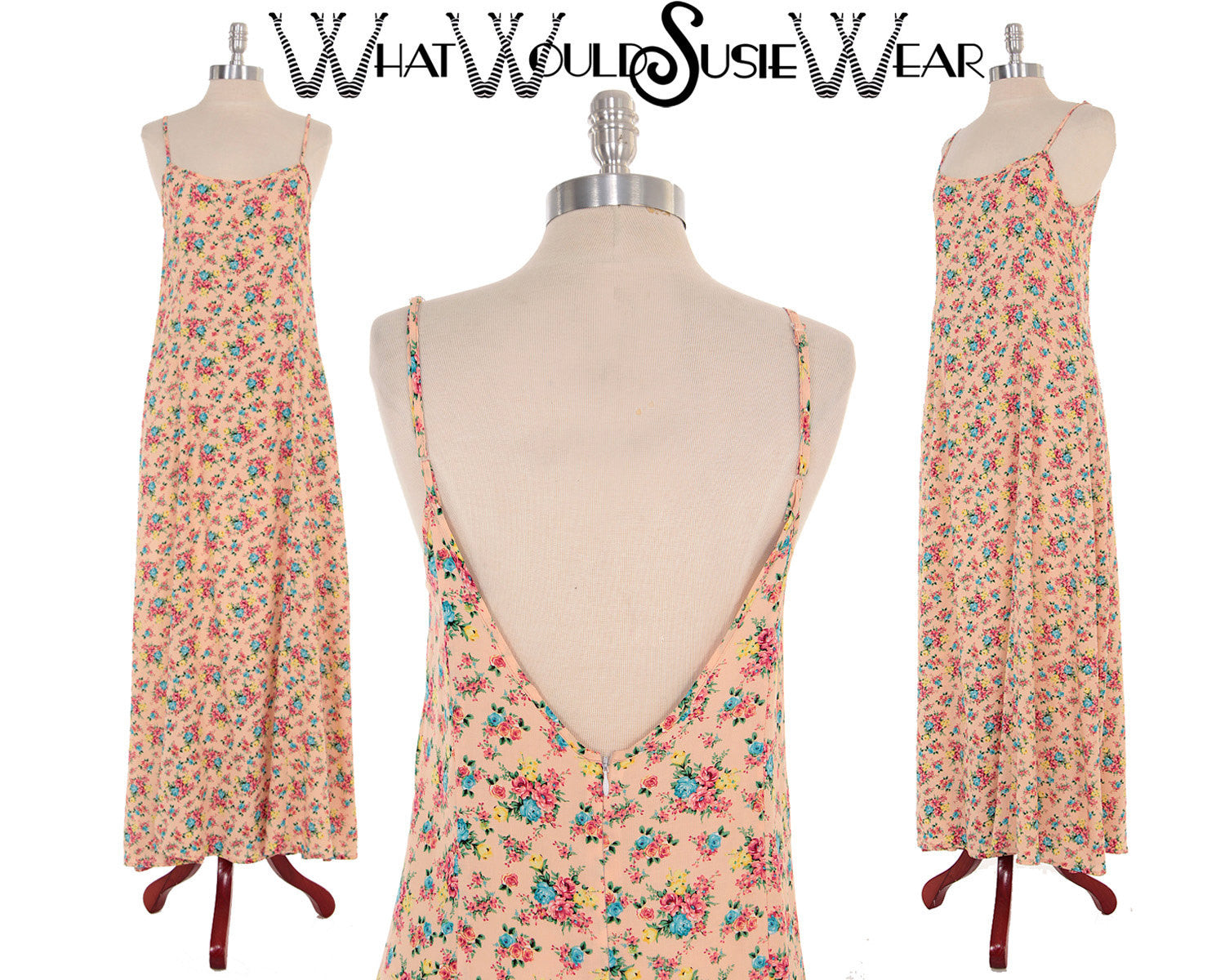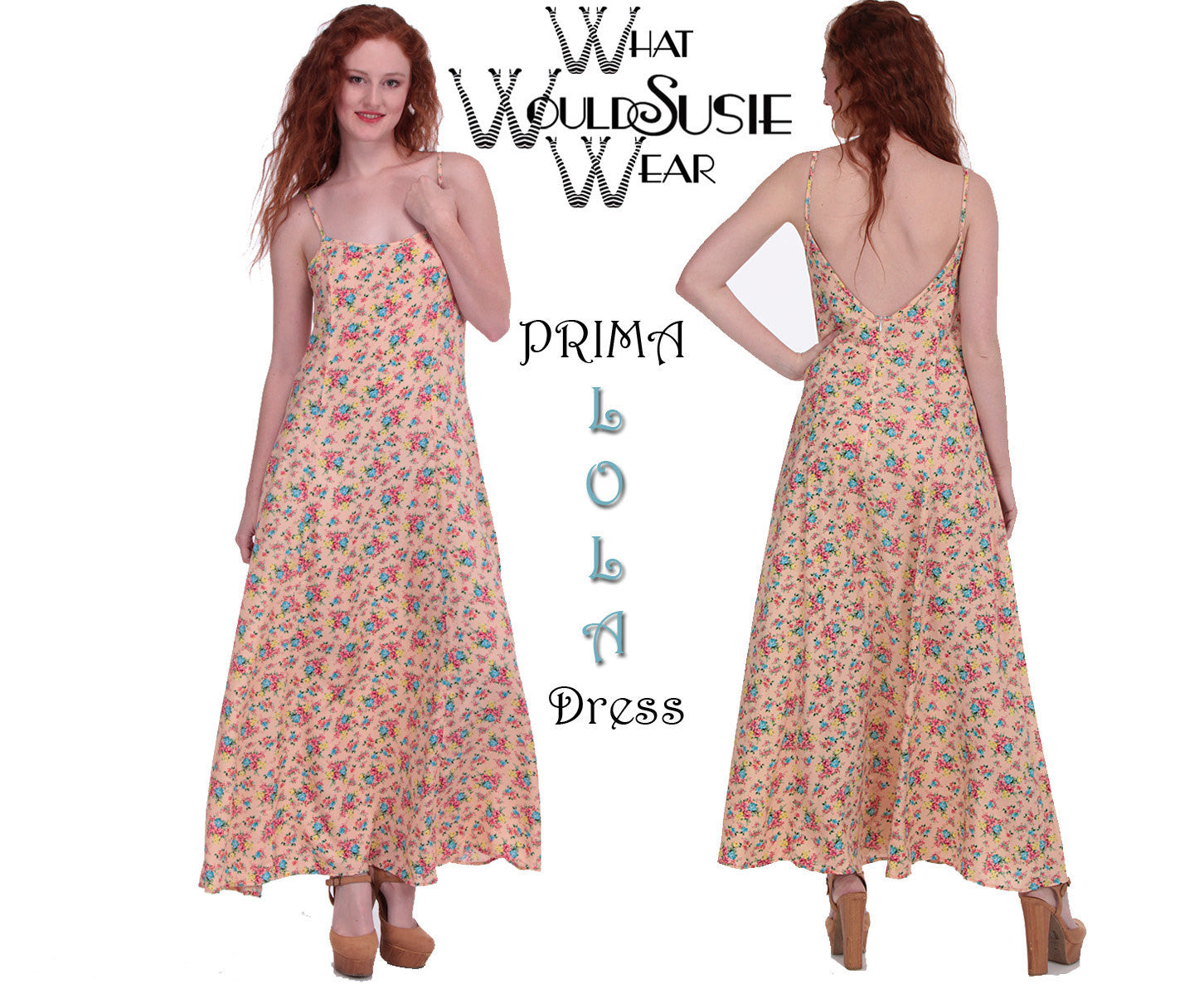 WhatWouldSusieWear PRIMA Lola Boho Maxi Floral Festival Dress. Slinky, Sexy and Super Flowey and cozy Flared bottom dress with Adjustable straps and Super Low Back. Gorgeous Ditsy Floral pattern with Light Peach Pink Back Ground and tiny cute flowers in turquoise. pink and yellow. So flattering and uber cool! Wear with Grunge Boots, Cowboy Boots, or flip flops then switch it up and throw on a pair of platforms or sexy heels for a night on the town. Great for Summer Festival's, or to throw in your suitcase for a beach vacation or cruise. Day to night and night to day, you might even want to sleep in it, it's so soft and cozyalicious! No matter how you wear it we think you're gonna love it!