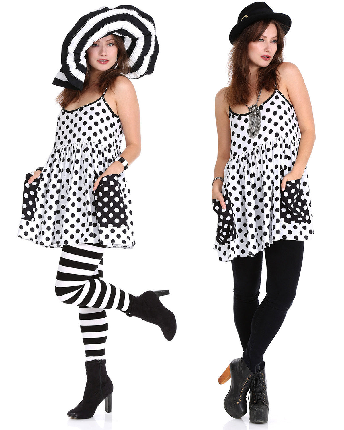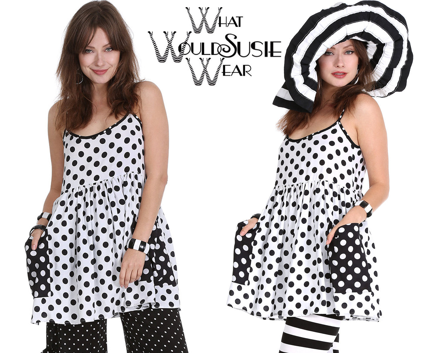 WhatWouldSusieWear's "Salt & Peppa" White and Black Large Polka Dot Mini Dress with Contrasting Pockets and Adjustable Straps! Great alone or with a pair of Pants, Shorts, or Our Black Lace or Striped or Floral PantalOOnies! Perfect to wear to the beach over your bathing suit, then just grab a pair of heels or boots and you are ready to go out for the night! Mix and match with our Striped PantalOOnie's, Daddy or DaddyLongLegsz Striped leggings, Black Lace PantalOOnie's. Made in super soft, light and cozy Rayon Challis! Just a perfect easy breezy dress that you will wear again and again! Perfectly adorable as a Maternity Dress too!