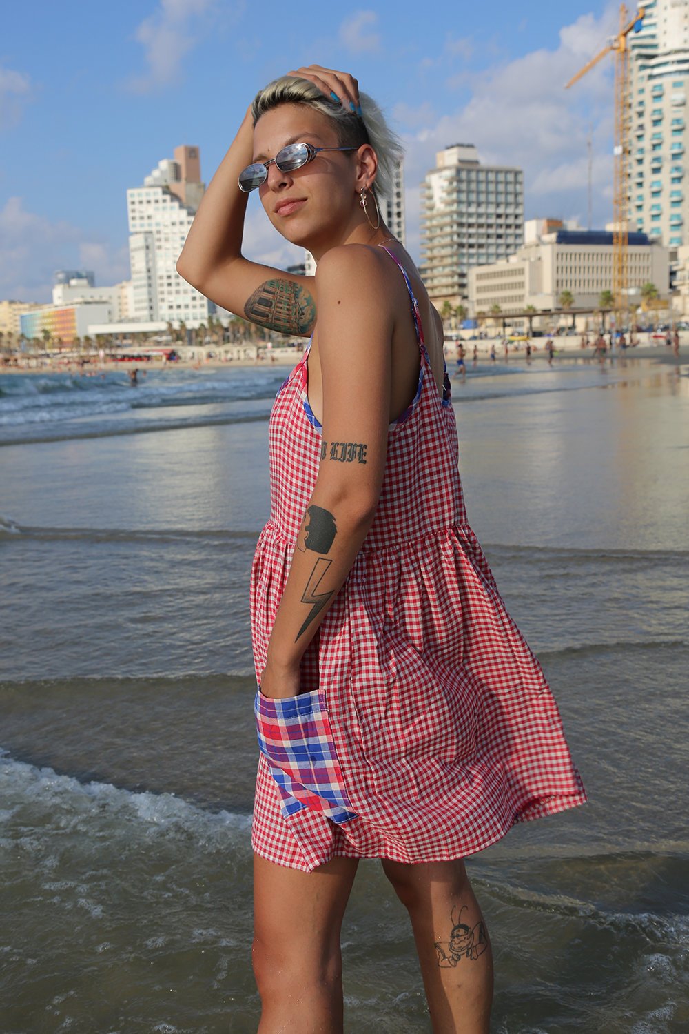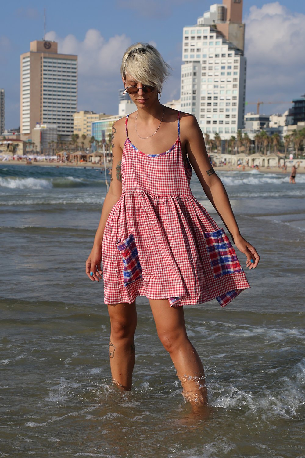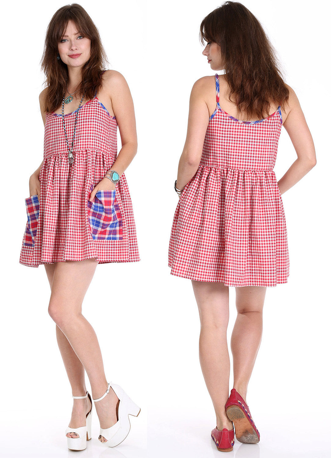 Red & White Gingham Plaid background highlighted with Contrasting Red White and Blue Trim and Pockets. Straps are adjustable for a perfect fit! Great with blue jeans, flats, or dress it up.