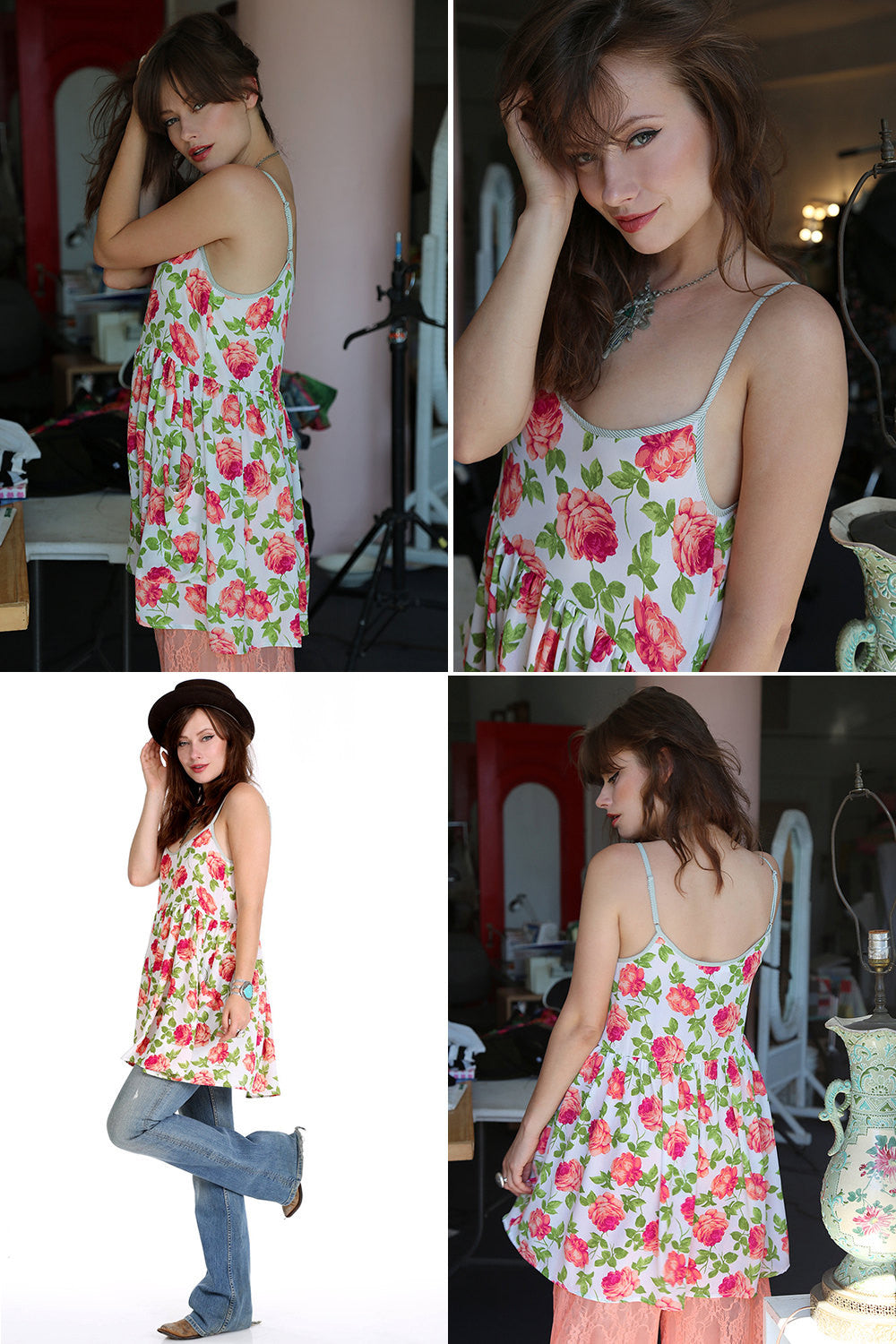 WhatWouldSusieWear Rose Floral Print Rayon Baby Doll Mini Dress with Pockets and Adjustable Straps! Great alone or with a pair of Pants, Shorts, or Our "Melonie" Lace PantalOOnies! Perfect to wear to the beach over your bathing suit, then just grab a pair of heels or boots and you are ready to go out for the night! Made in a lovely soft Poly Chiffon! Just a perfect easy breezy dress that you will wear again and again! Great for Pregnancy also!