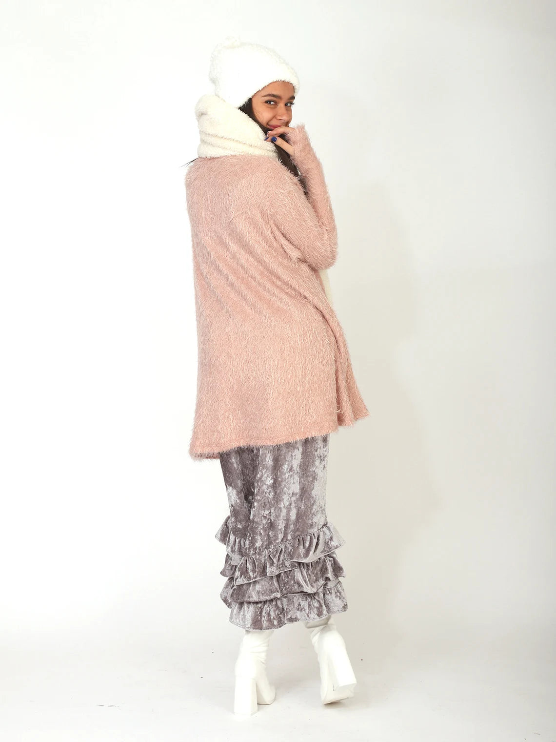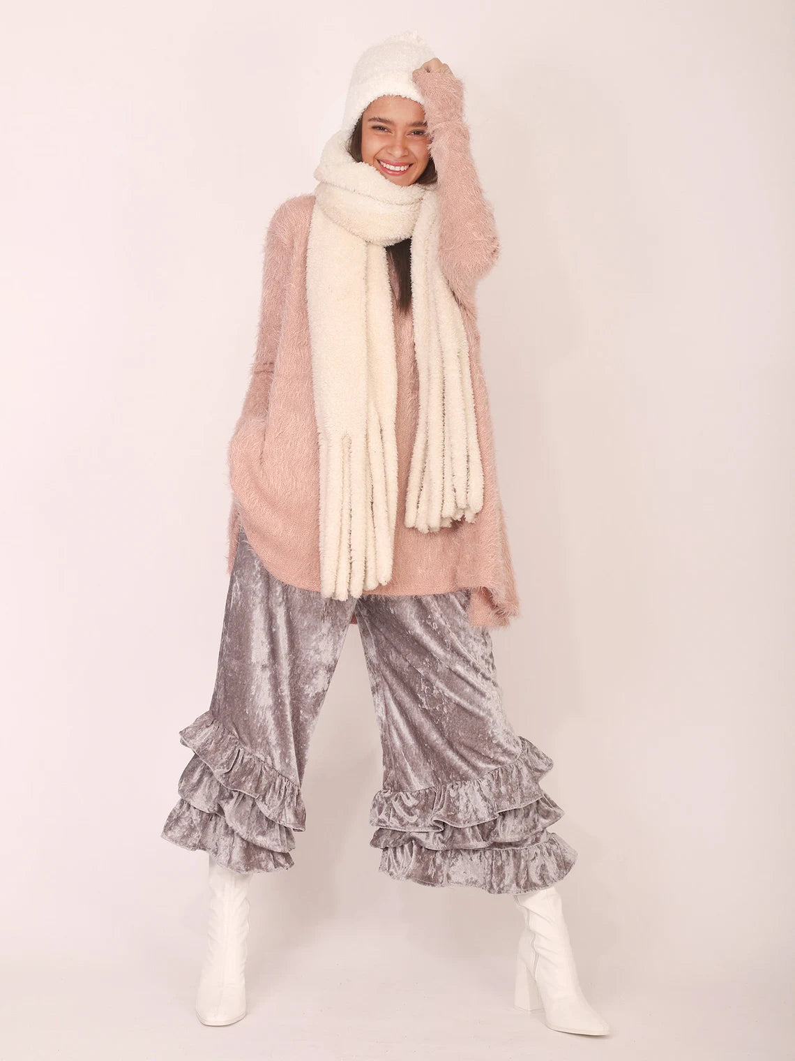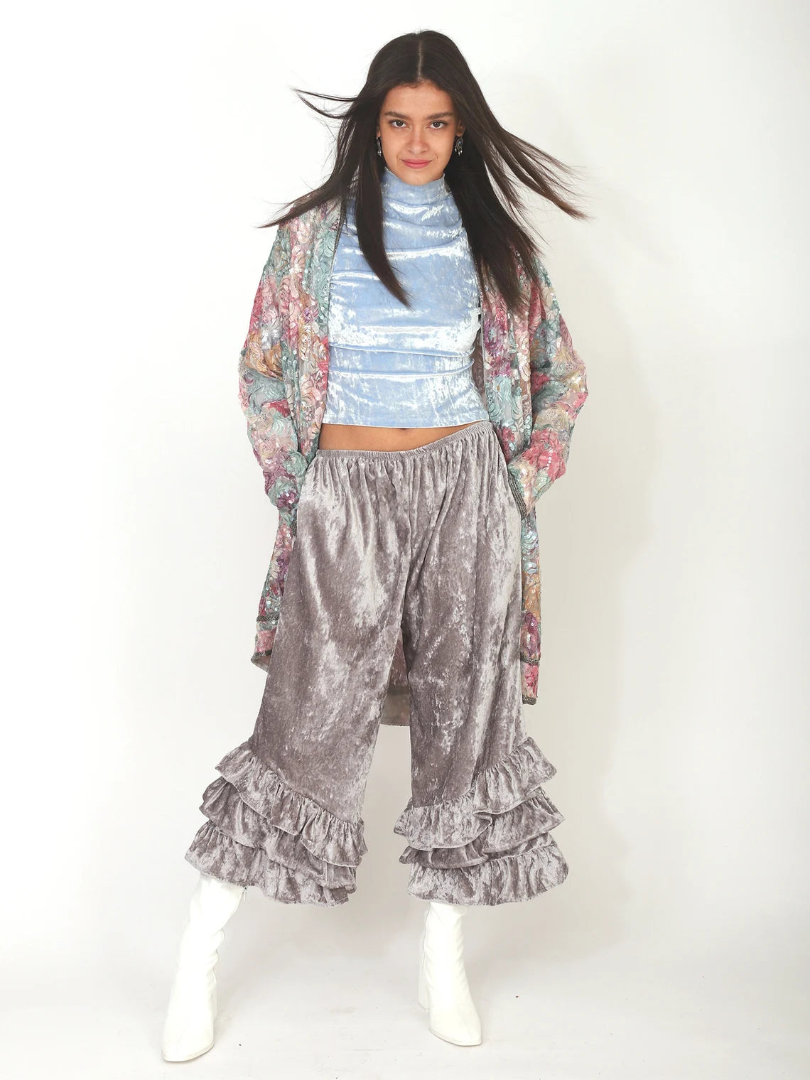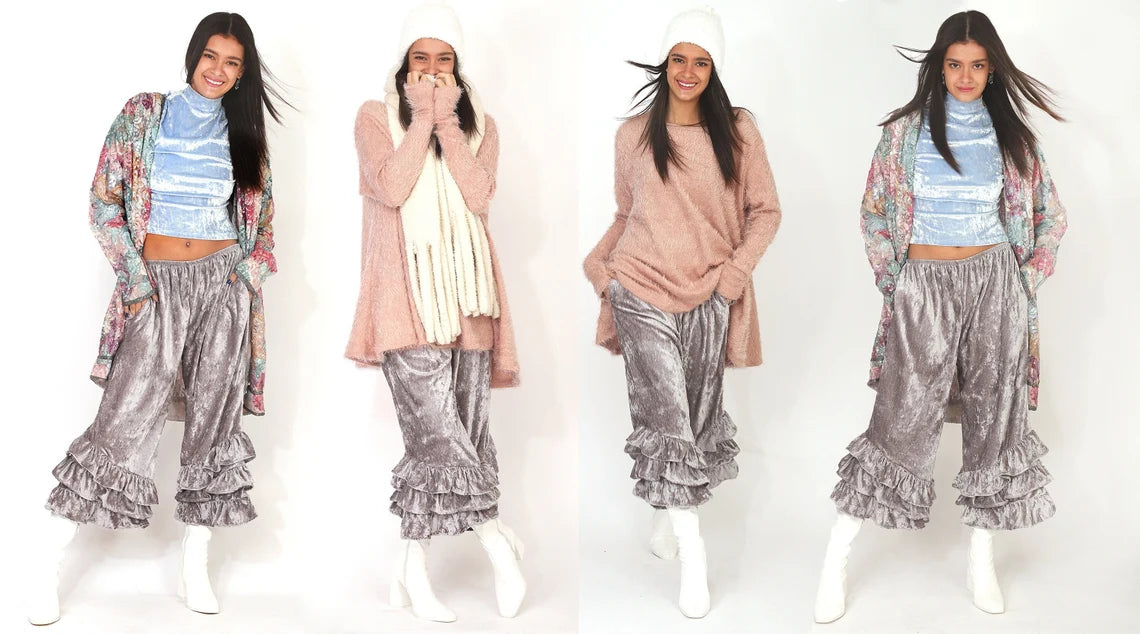 Shimmery Silver Grey Velvet PantalOONIE Bloomers with Pockets in super soft, lightweight, cool, chic and easy to wear Crushed Velvet. Super comfortable elasticized waist. Can be worn at waist or hips. They come in two sizes, Small-Medium and Large to Extra Large. The body of the Bloomers are the same in both sizes, it's just the difference in the size of the elastic that make them a P-M or L-XL.So many ways to wear them!