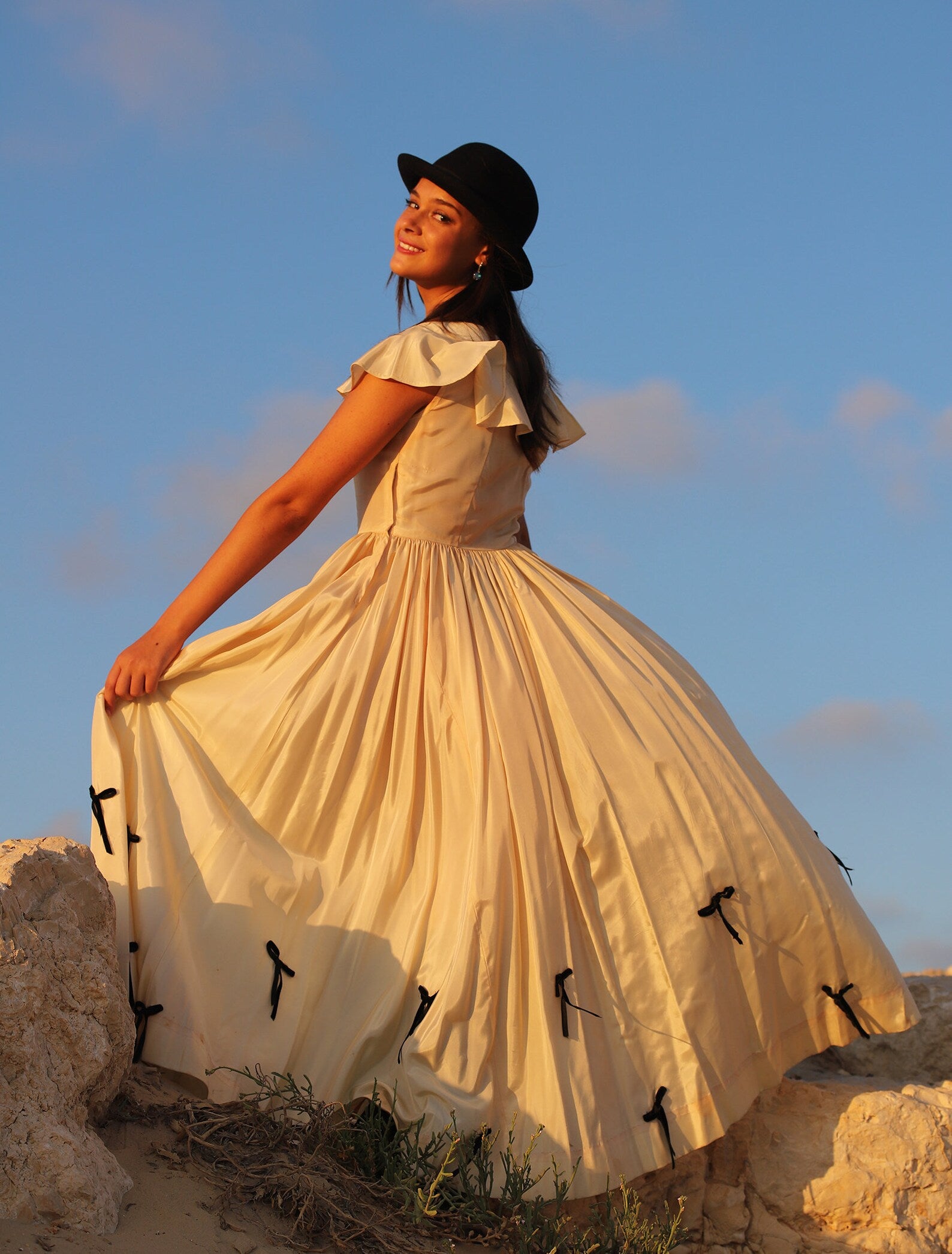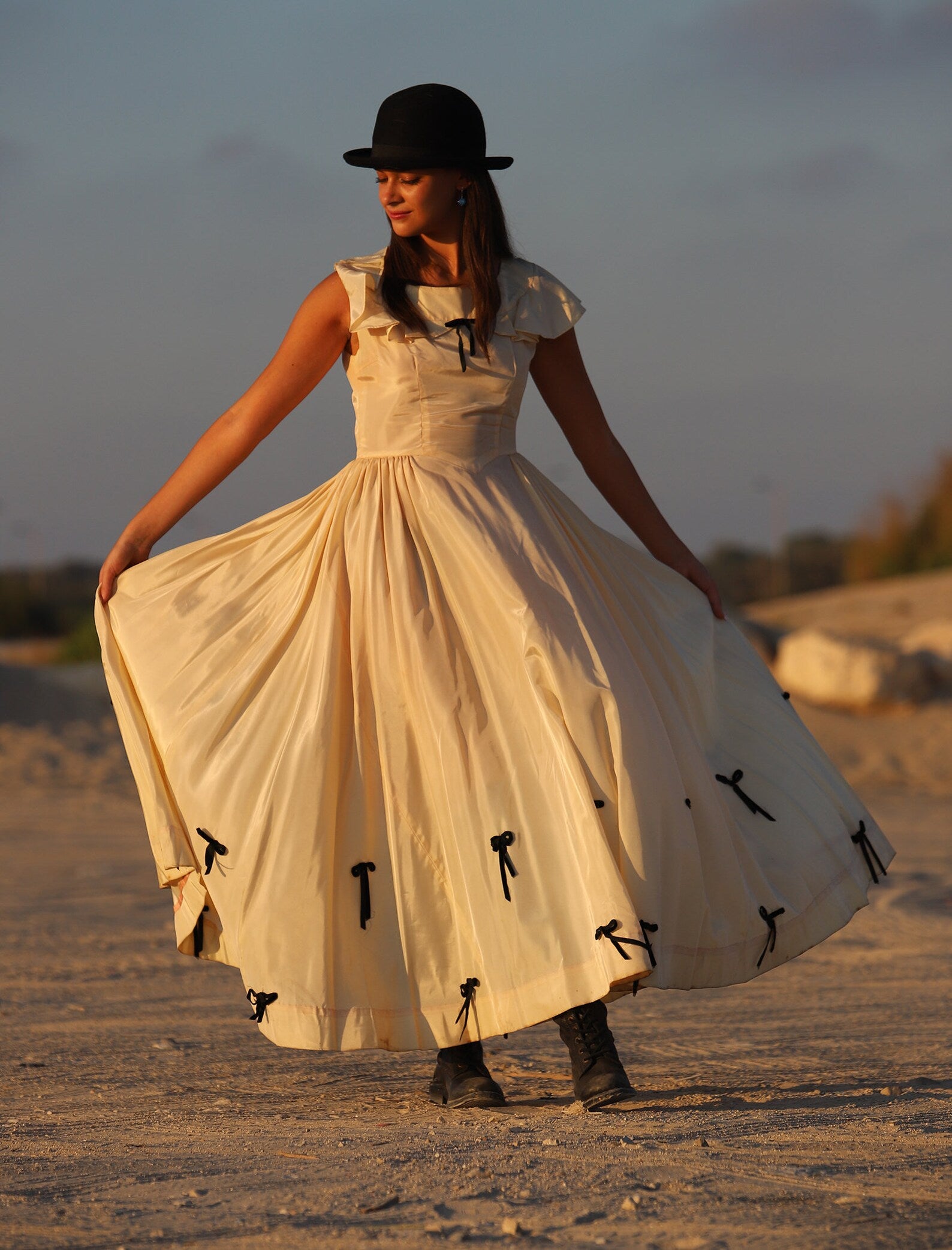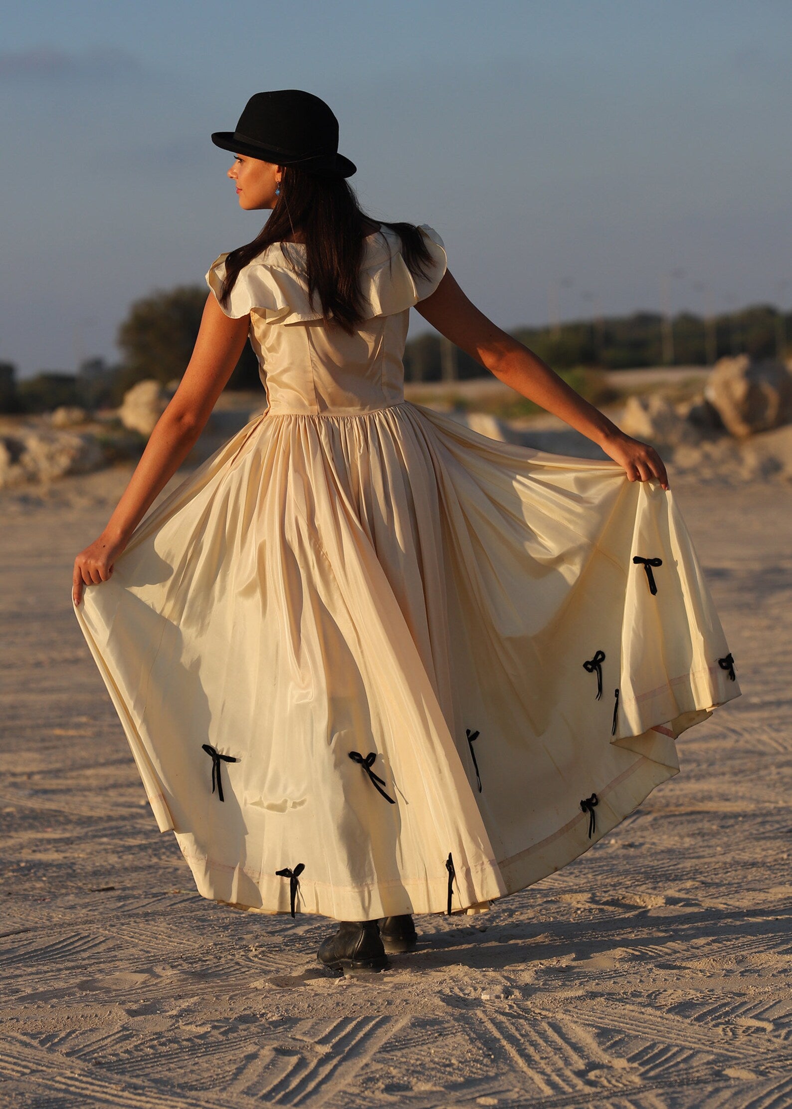 Vintage 1930s Full Sweep Costume Dress. Beautiful Peach and Black Acetate Dress with Flutter Sleeves, fitted bodice that opens up into a Massive Sweeping Skirt with Black Bows in the front of the bodice and throughout the hemline of this magical dress. Shown here with a pair of Combat Boots but of course can be worn with a pair of heels or barefoot for a Vintage Beach Wedding. There is a Tag inside with a number which was most likely the number for an actress to know it was her dress!
