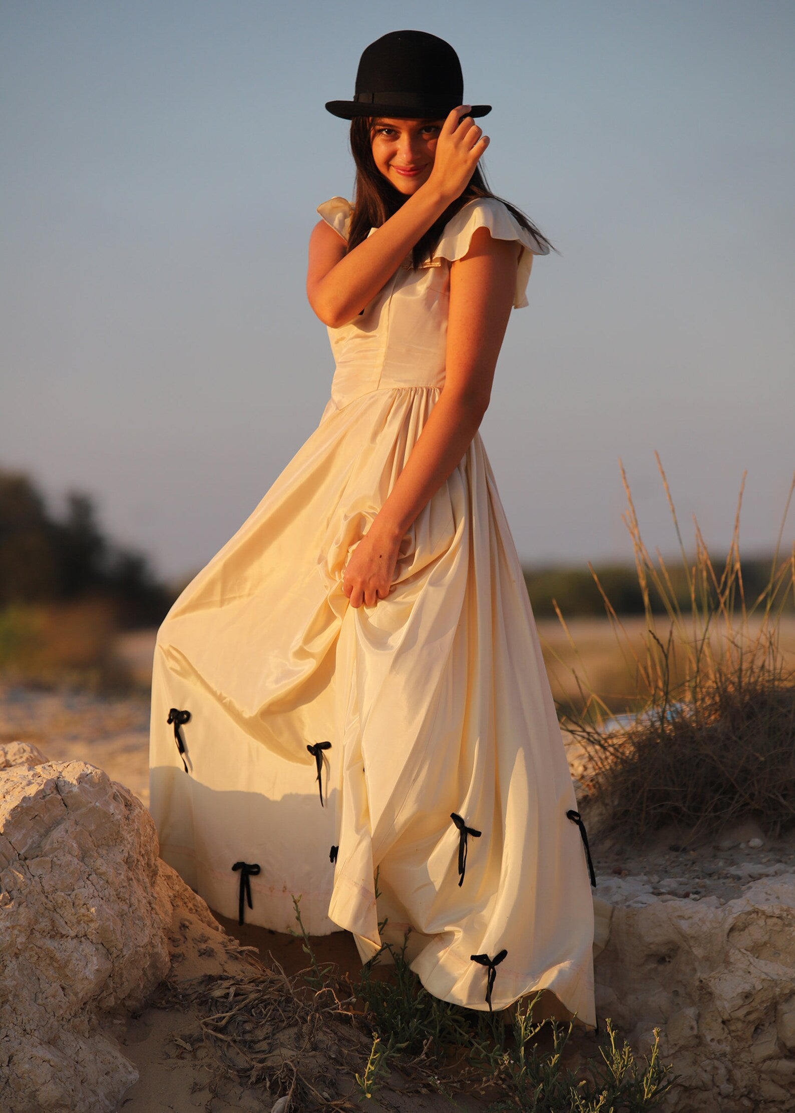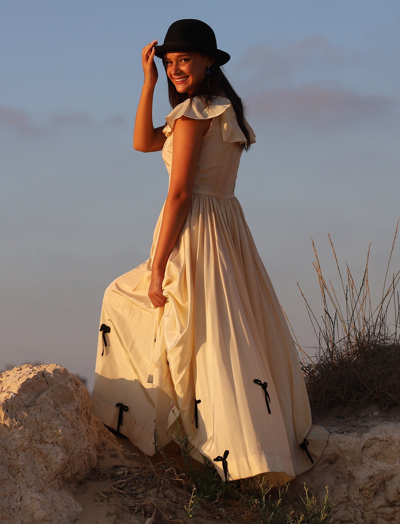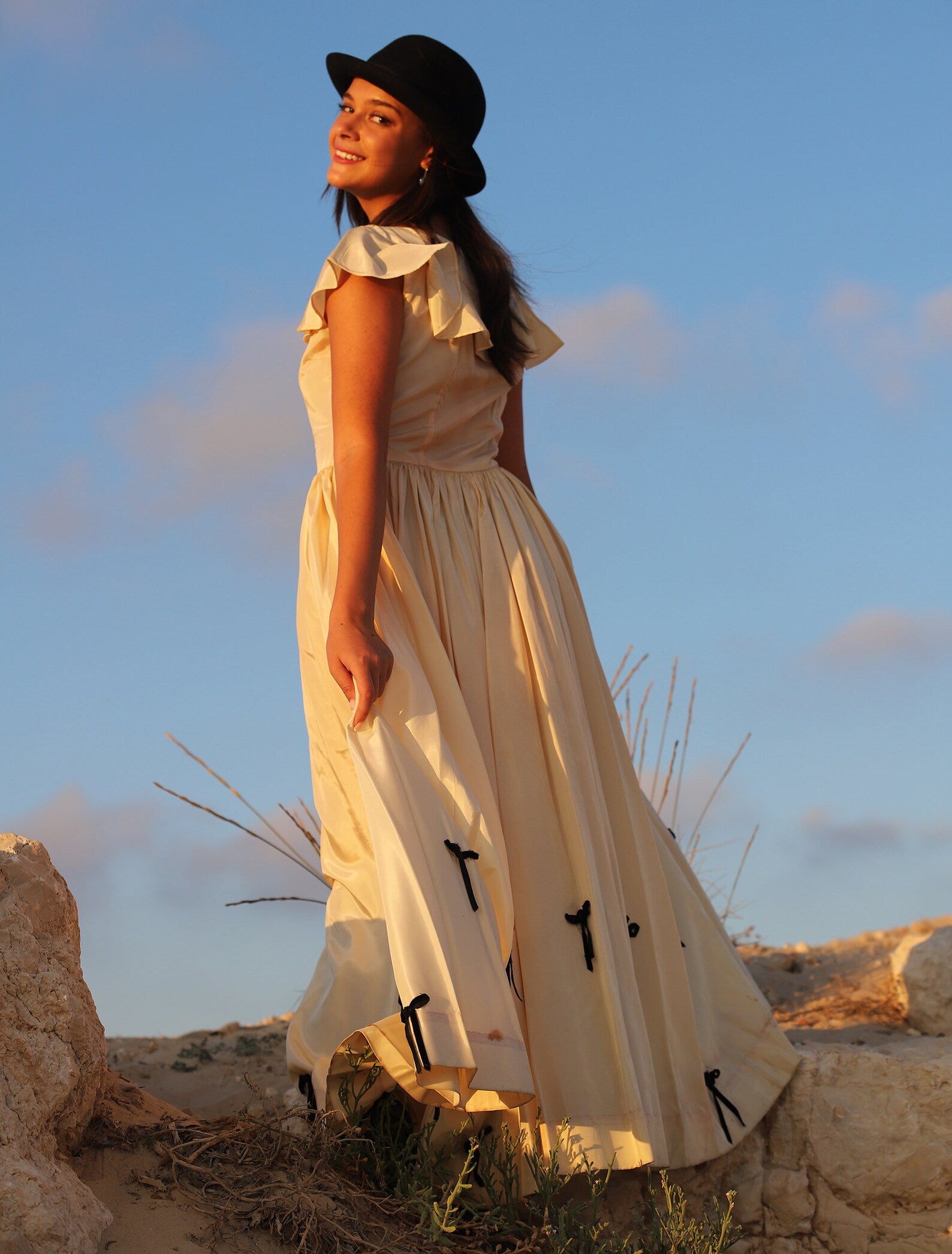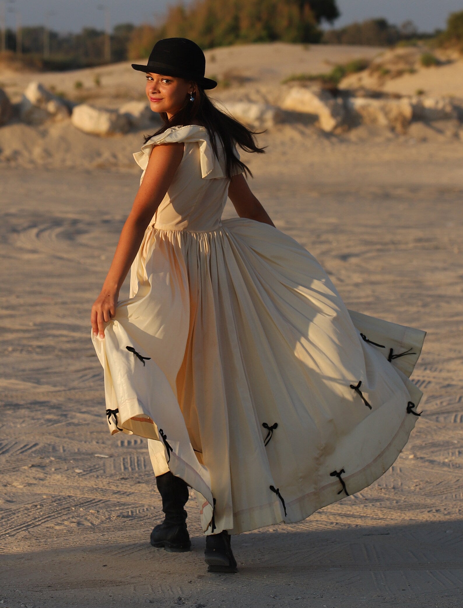 Vintage 1930s Full Sweep Costume Dress. Beautiful Peach and Black Acetate Dress with Flutter Sleeves, fitted bodice that opens up into a Massive Sweeping Skirt with Black Bows in the front of the bodice and throughout the hemline of this magical dress. Shown here with a pair of Combat Boots but of course can be worn with a pair of heels or barefoot for a Vintage Beach Wedding. There is a Tag inside with a number which was most likely the number for an actress to know it was her dress!