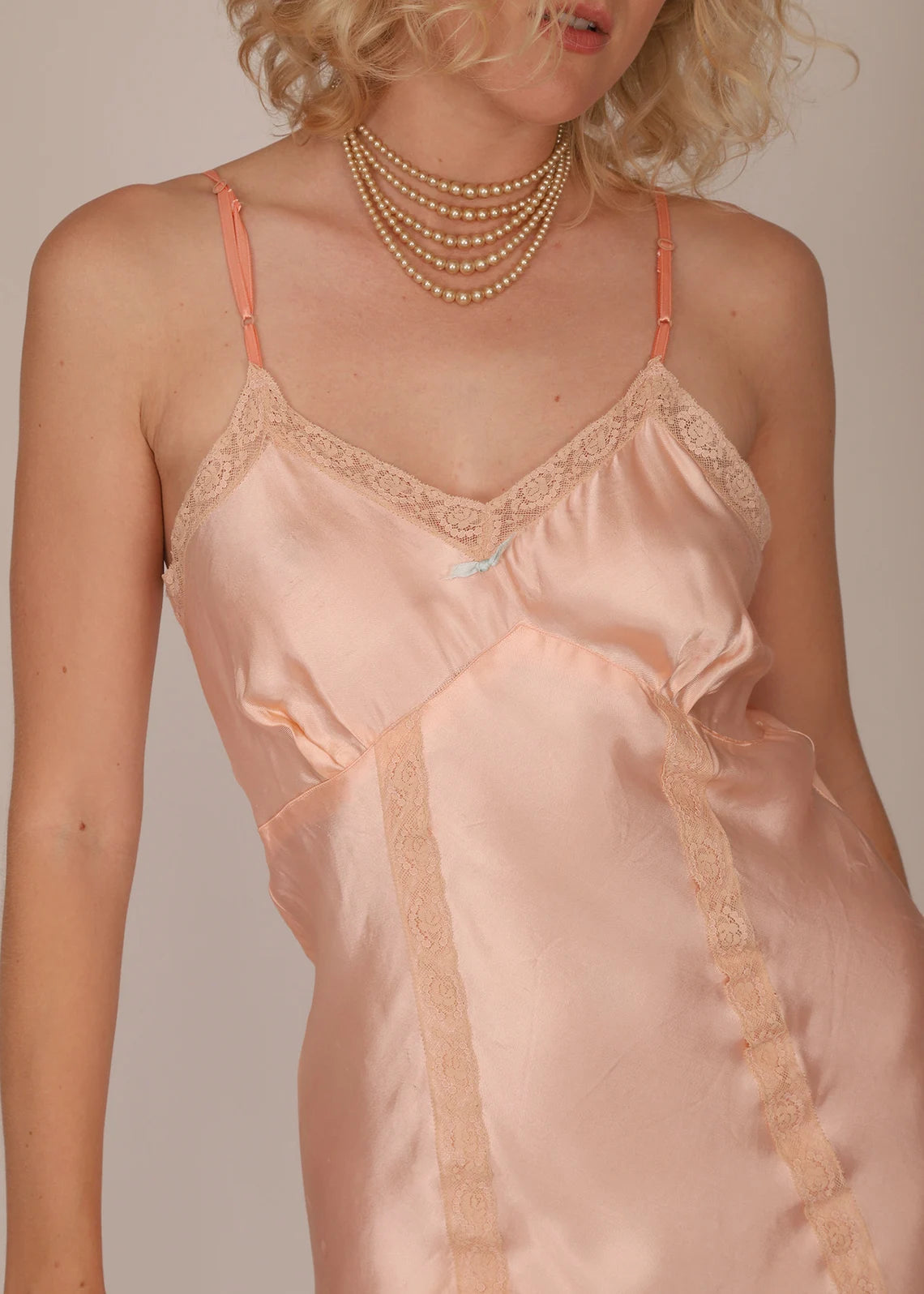 Vintage 1930s Peach Silk Slip with Lace Trim at Top Of Sweetheart neckline and down the front of dress with Spaghetti straps. Knee Length. Small Blue Bow at the center of V Neckline. Adjustable straps. Gently scalloped at the bottom hemline.