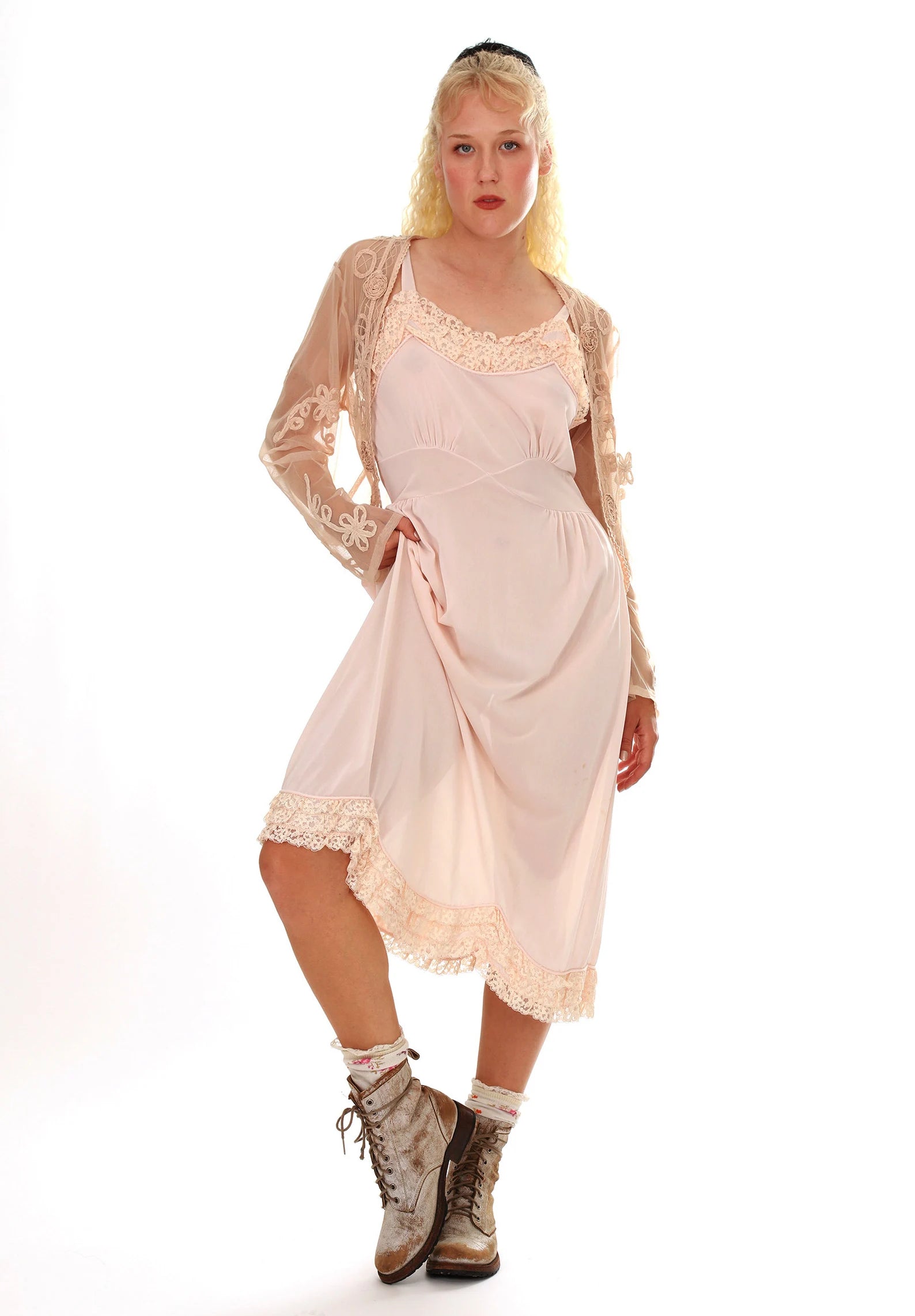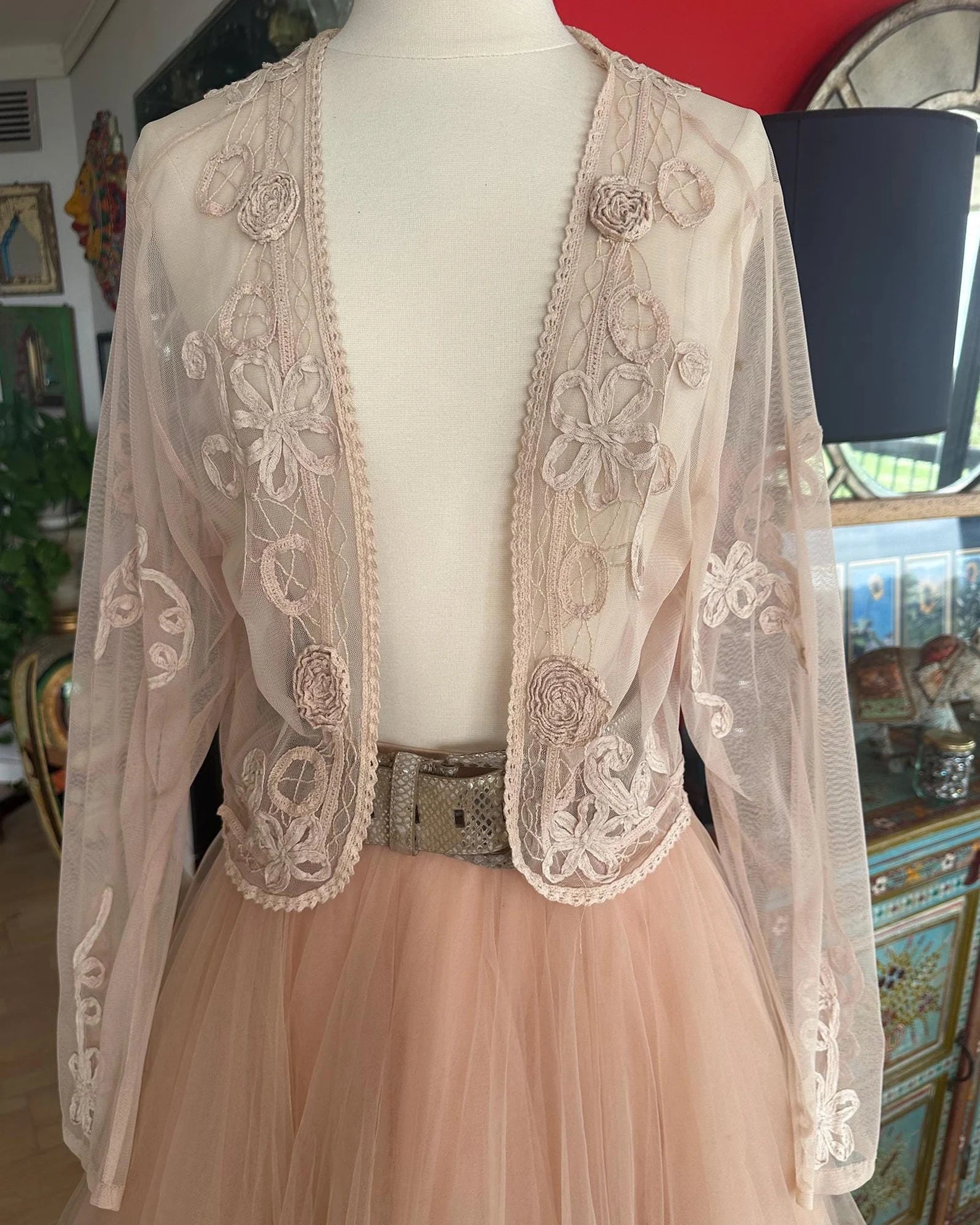 Vintage 1930s Sheer Netted Peachy Taupe Battenburg Lace Bed Jacket. Sheer fabric embellished with swirls of Battenburg Hand Stitched on crocheted ribbons, features crocheted roses placed on the front and back of the neck. Battenburg lace swirly decor on back as well. Beautiful to wear as shown over a vintage slip dress, or with a pair of jeans. So light, feminine and whimsical. There is one tiny stain on the left sleeve by the shoulder. I almost missed it, but it doesn't detract from the jacket which is otherwise perfecto. **Please Note the color more of a peachy taupe than the photos of the jacket on Caileigh.