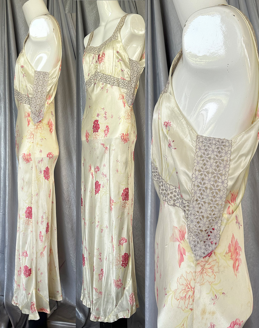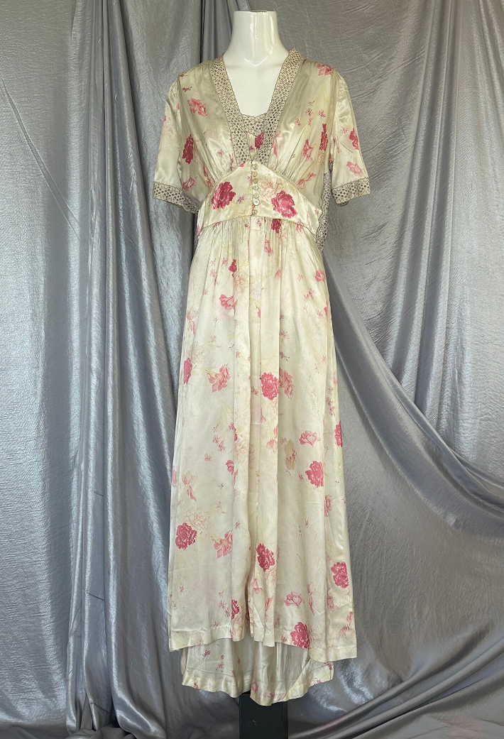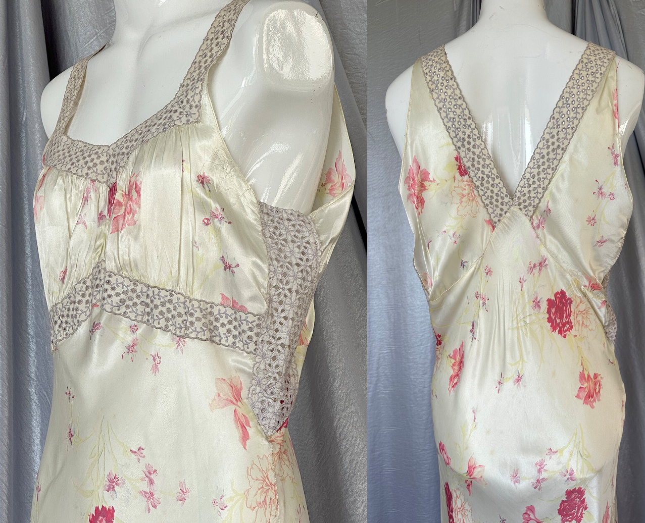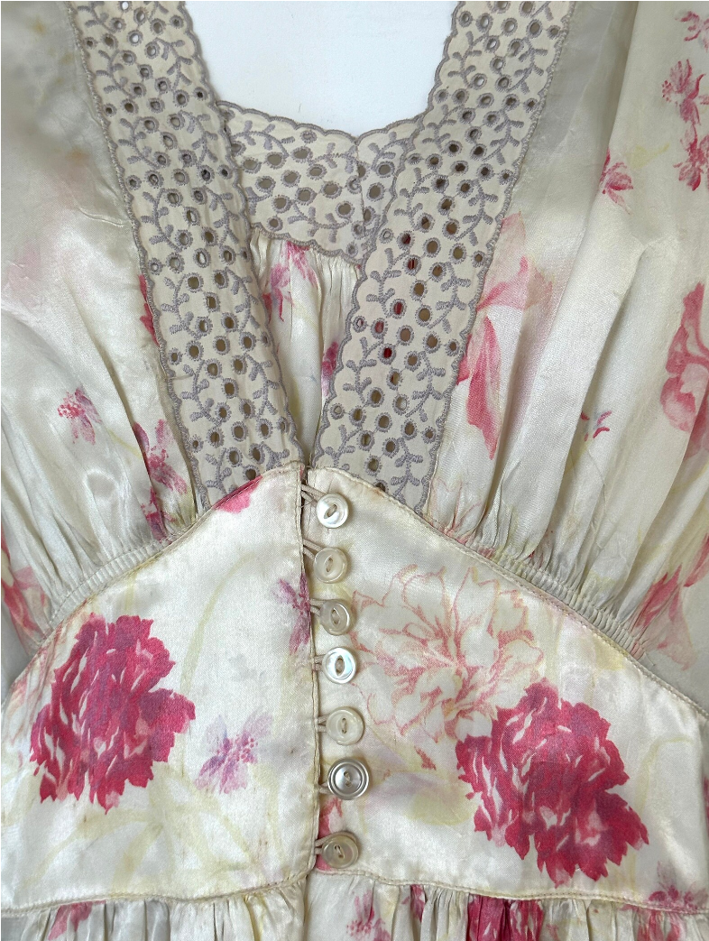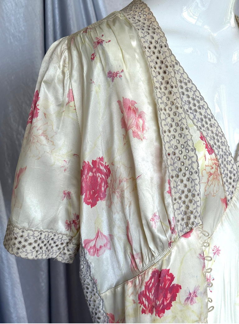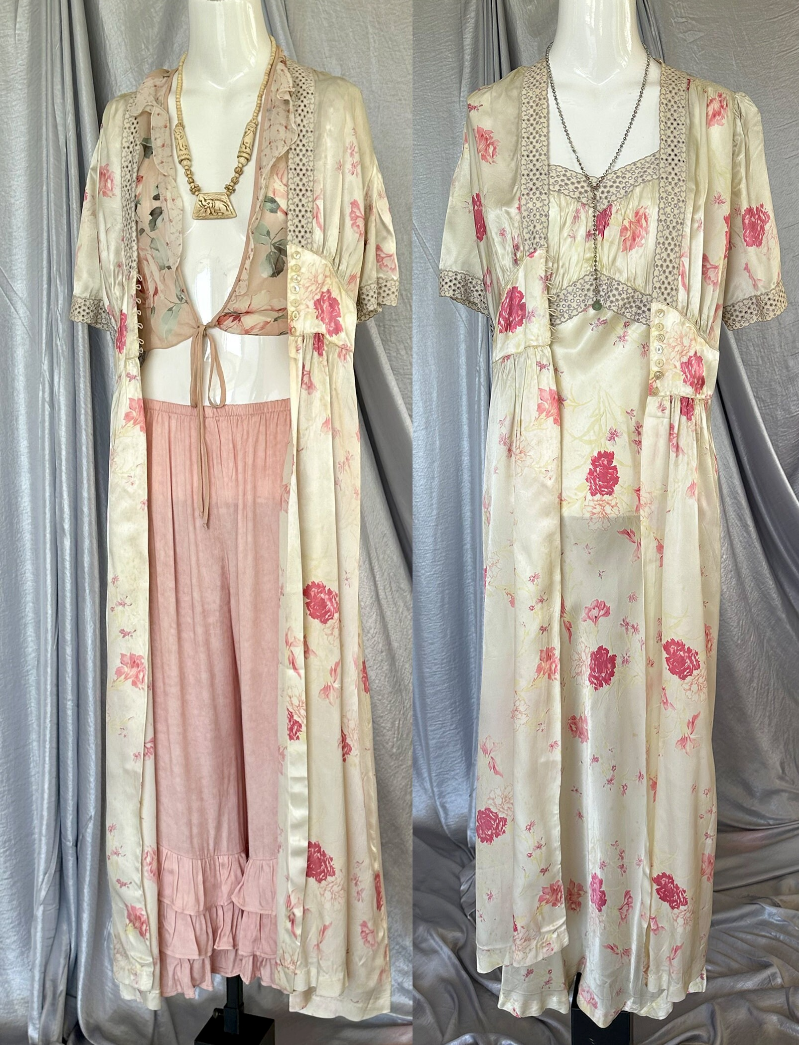 Stunning Vintage 1940s Off White, Shades of Fuchsia Pink Floral Silky Stainy Peignoir Slip Dress and Robe, cut on the bias with Eyelet Ribbon embellishments around the neckline, sleeves Empire waist and and sides of Duster/Robe. Seven pearlized buttons as closure on the Duster.Such a gorgeous Peignoir set that can of course be worn in the bedroom, but why keep it there, wear it out. You can easily wear the slip as a dress, and the robe/duster as a jacket with my PantalOOnie's and a top, or over a pair of jeans and a T-shirt.