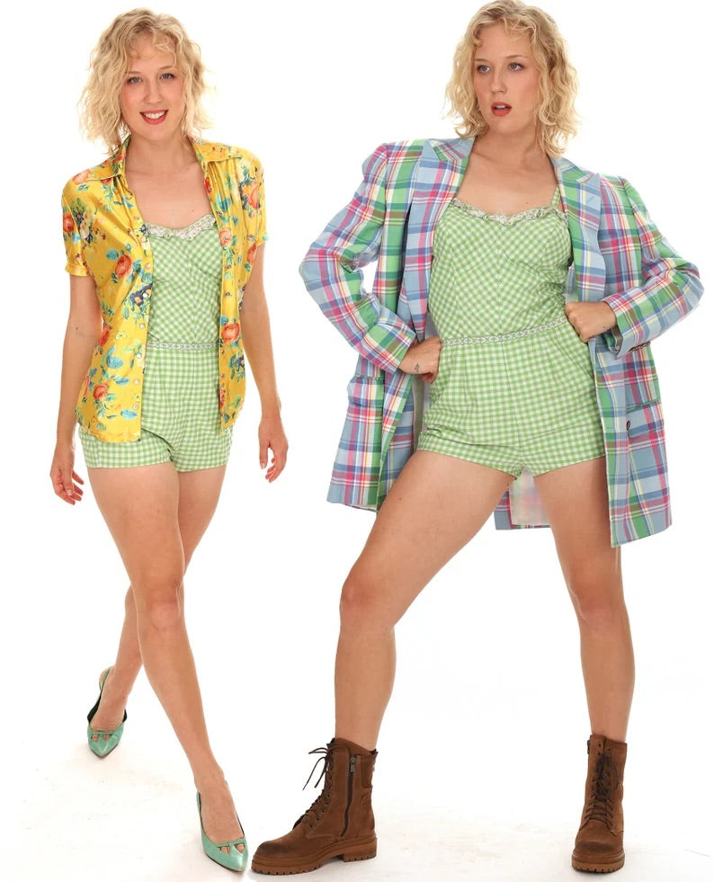 Vintage 1950s Jantzen Pinup Lime Green and White Gingham Plaid Bathing Suit, Onesie, Playsuit with Charming Embroidered Ruffles at the top and matching embroidered Ribbon at Waistline, Adjustable Button Straps, with Puckered Stretchy Sides. Fully lined with inside attached bra. Long zipper at back. The inside tag shows that this garment is a Large, but as you can see from out Model Caileigh it will fit multiple sizes. Caileigh is 5'8". Bust 34B, Hips around 38", so I would say it could fit a Small to Large woman depending on desired fit, and considering it has stretchy puckering at the sides. Too cute to just wear swimming, as you can see in the last image! Totally wearable to go out for the day, especially with Short Shorts on trend right now and forever!