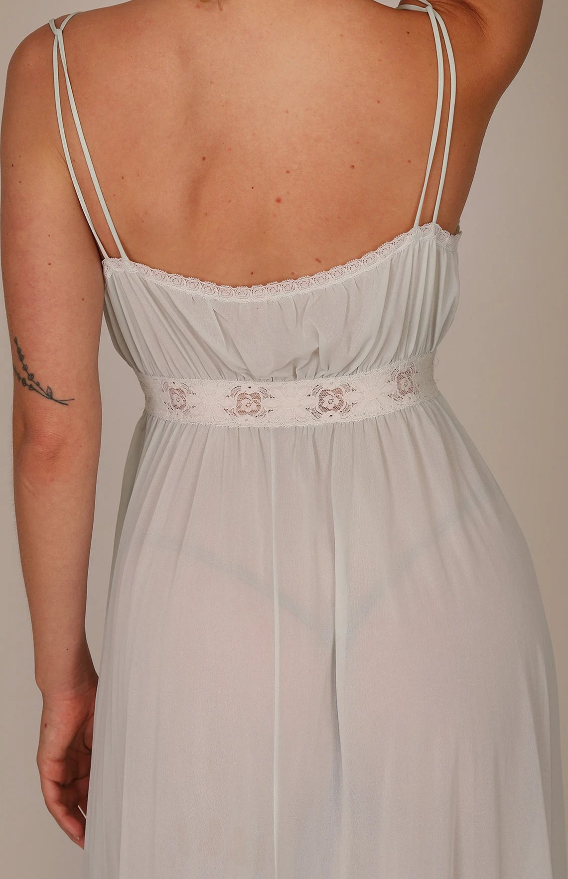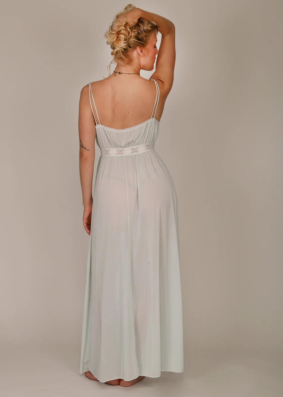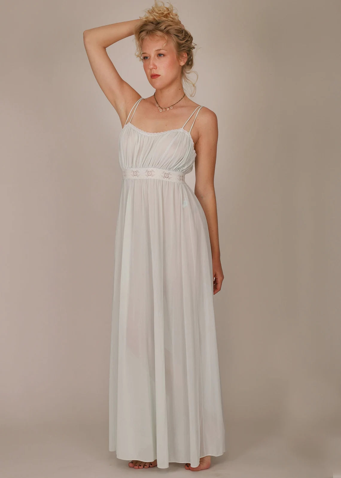 Vintage 1950s Light Blue Nylon and Lace Empire Waist Negligee with double spaghetti straps. So pretty and ultra feminine. A lovely light shade of blue with a white floral elasticized band.Super light and comfortable and sexy!!