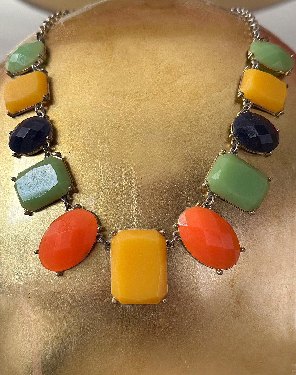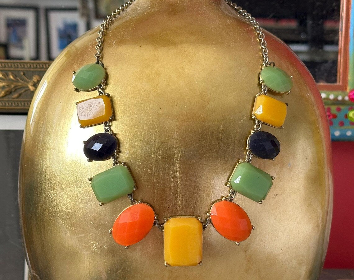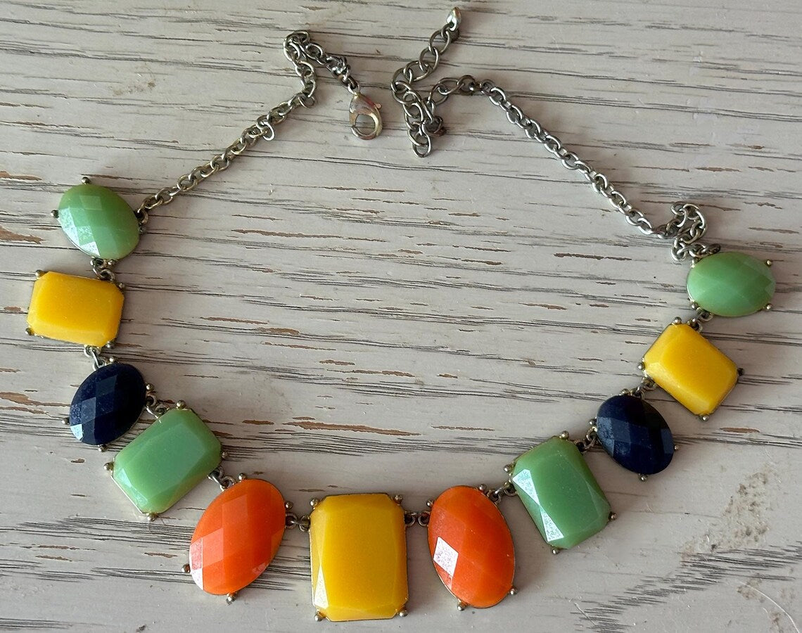 Vintage 1960s Mustardy Yellow, Orange, Jadeish Green and Blueish Black Lucite Plastic Bezeled Beaded Necklace with Silver Adjustable Chain. Super unique colors that can go with so many outfits. Shown here with a mixed outfit and looks perfect! The back is pretty too, so you could even wear it backwards! I just loved the colors and think you will too! MEASUREMENTS: Full Length: 21" Pendants around 1" or smaller