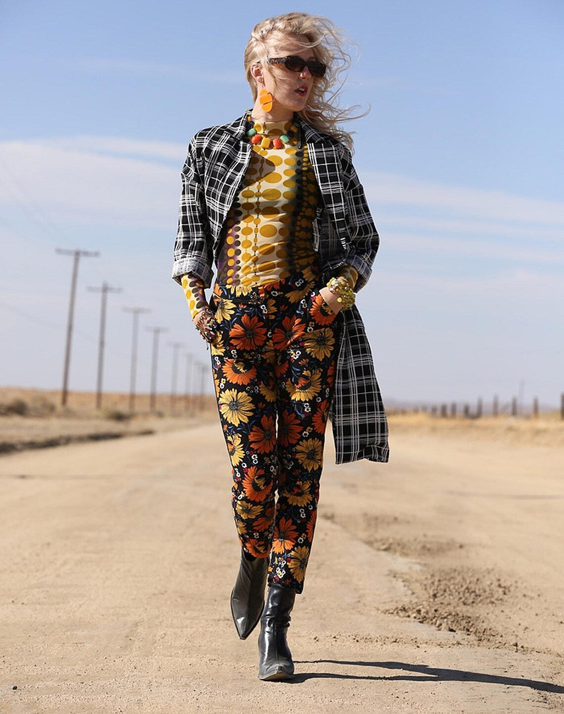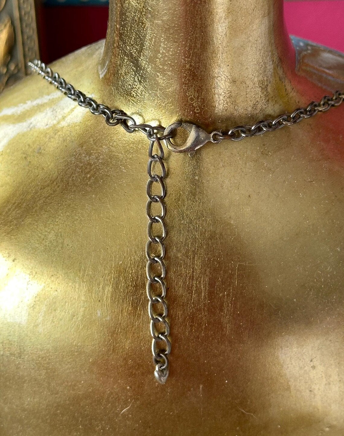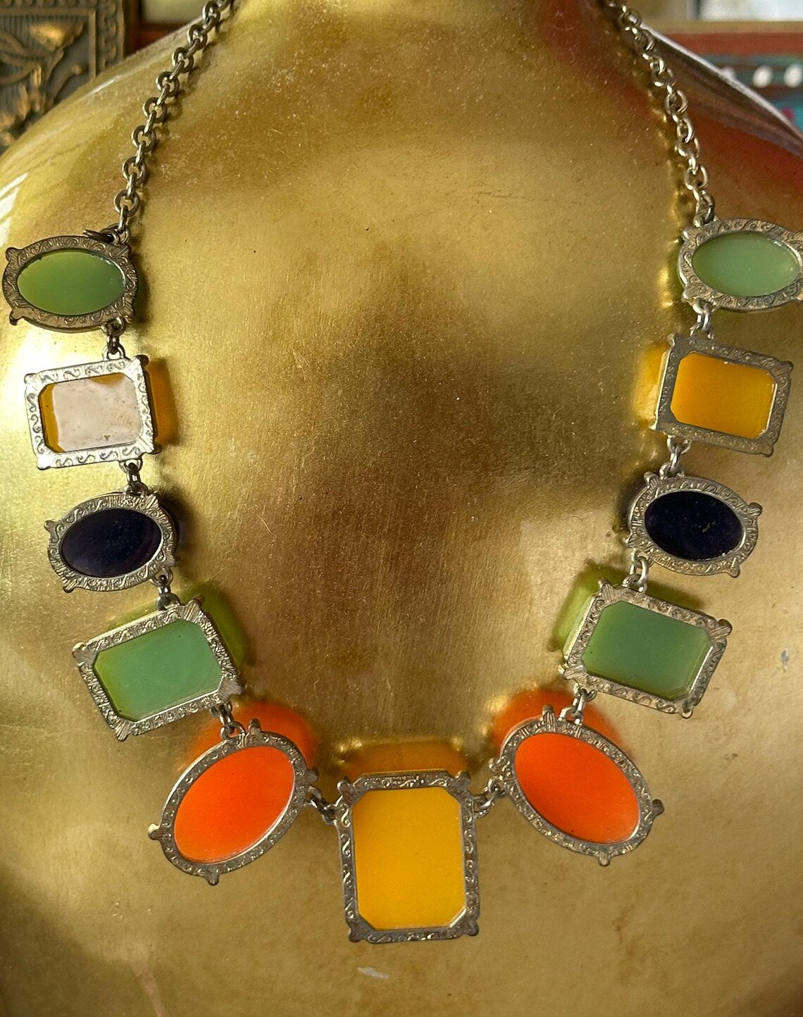 Vintage 1960s Mustardy Yellow, Orange, Jadeish Green and Blueish Black Lucite Plastic Bezeled Beaded Necklace with Silver Adjustable Chain. Super unique colors that can go with so many outfits. Shown here with a mixed outfit and looks perfect! The back is pretty too, so you could even wear it backwards! I just loved the colors and think you will too! MEASUREMENTS: Full Length: 21" Pendants around 1" or smaller