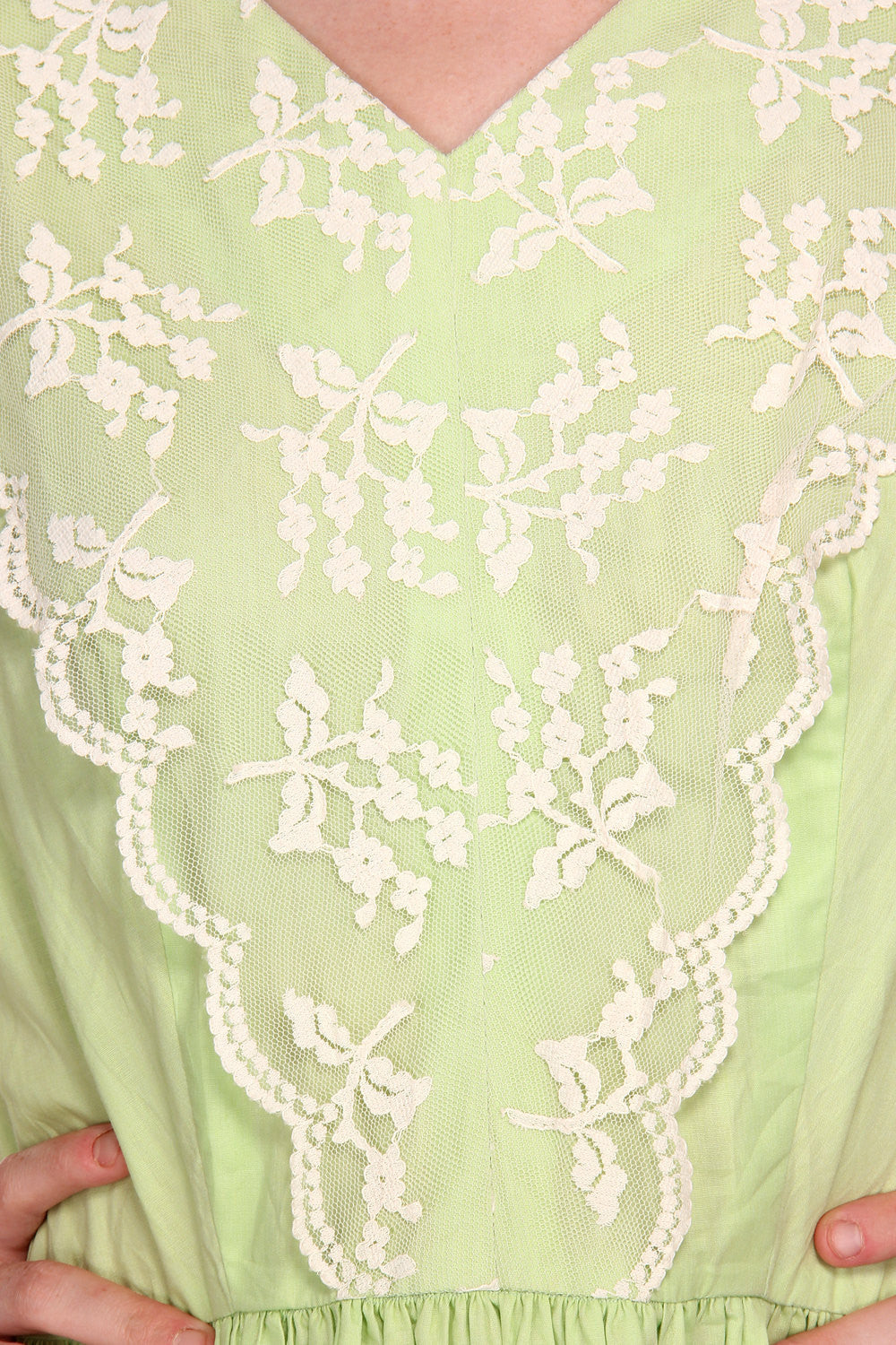 Retro 1950s Light Minty Green Dress with Lace Apron and Ruffle Detail.