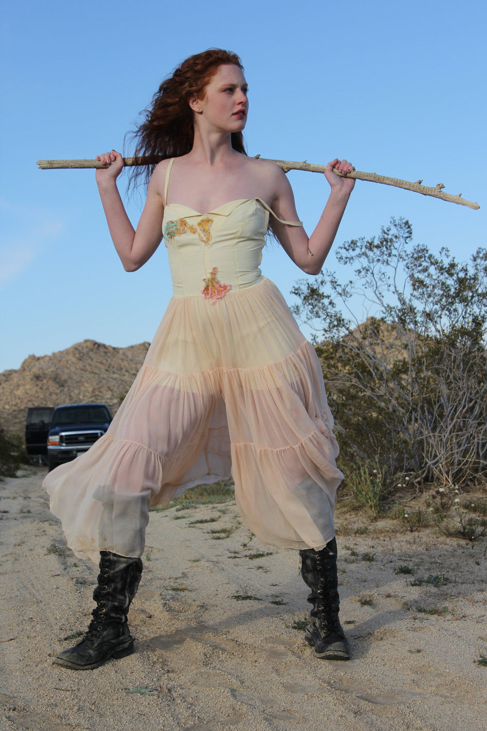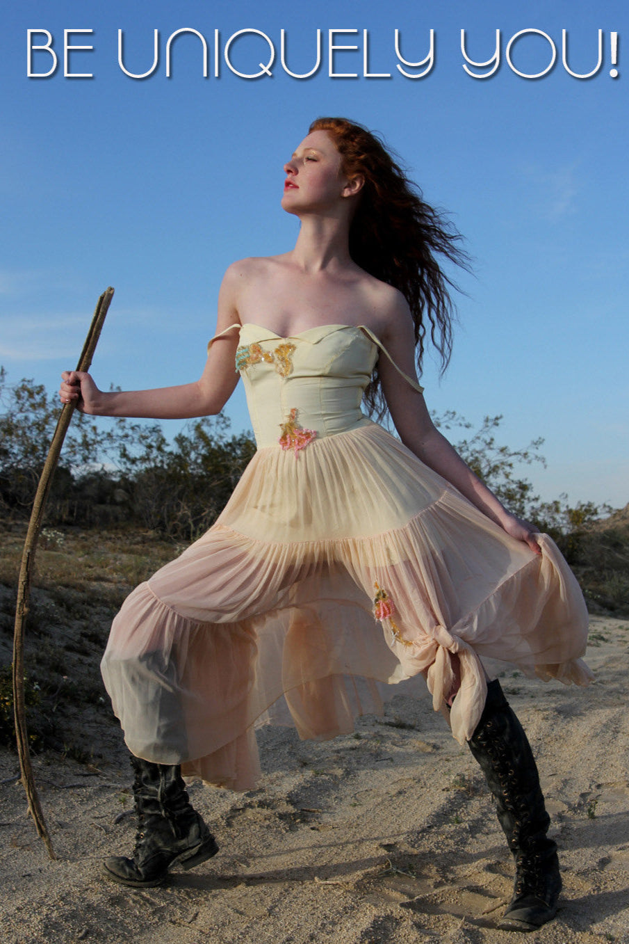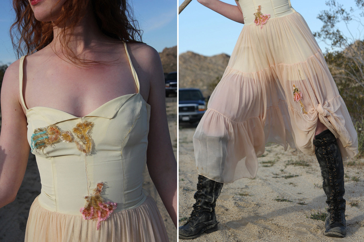 Find the Fairy Princess Warrior In You with this Magical Whimsical Vintage 1950s Sheer Chiffon Dress. Sweetheart neckline, vintage sequin florals scattered about. Torn skirt tied up and tattered in all the best ways. The under slip is cut short, but covers all the necessities. Wear as shown with a great pair of battle boots, or with slenderly sexy vintage heels. This dress is not in perfect condition, but it is the look and feel of this beautiful dress that makes it so unique and special.