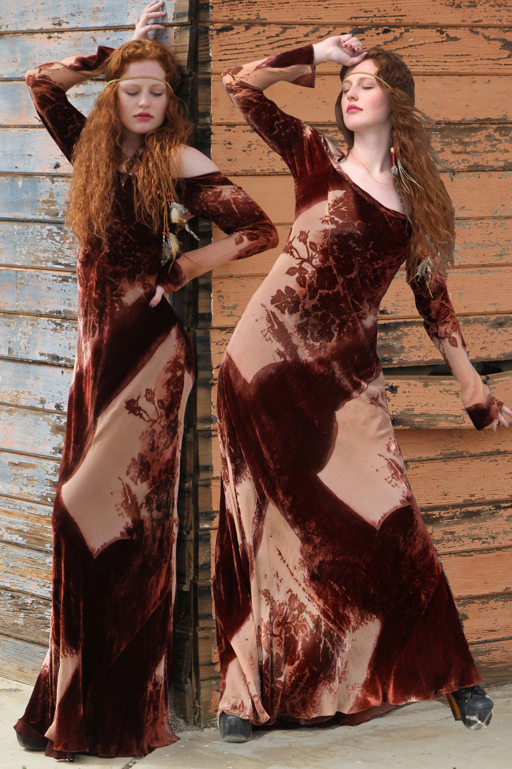 Vintage 1970s Romantic Bohemian Renaissance One Of A Kind Masterpiece of a Dress! Sheer Rust Burnout Velvet Off Shoulder Model Length Maxi Dress. Surely One of the most Unique magnificent dresses to cross our paths. This dress reminded us of a dress that would befit the wonderment of Stevie Nicks. The burnout work on this dress was done by someone who was an Artist. So particularly crafted, and with such amazing detail and careful placement of the burnout process on silk. The dress is lined and incredibly soft and supple. How amazing would this dress be for a bride who is looking for a Bohemian dress from another Era. It's not white? No it certainly is not, but we love the idea of shocking the crowd into a hush of amazement. This dress would certainly do that!, but would be equally as stunning and deserving of a walk down the Red carpet, or just because you are looking for a dress that you dream of wearing.
