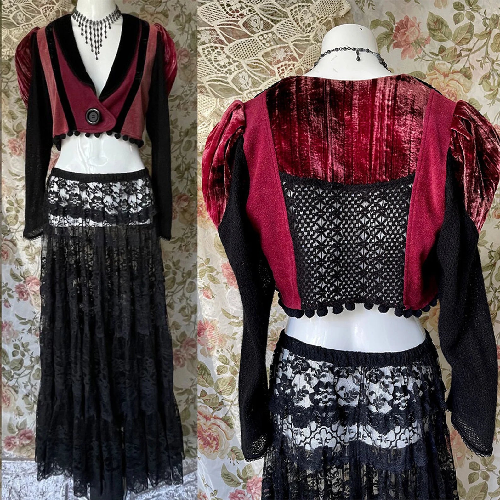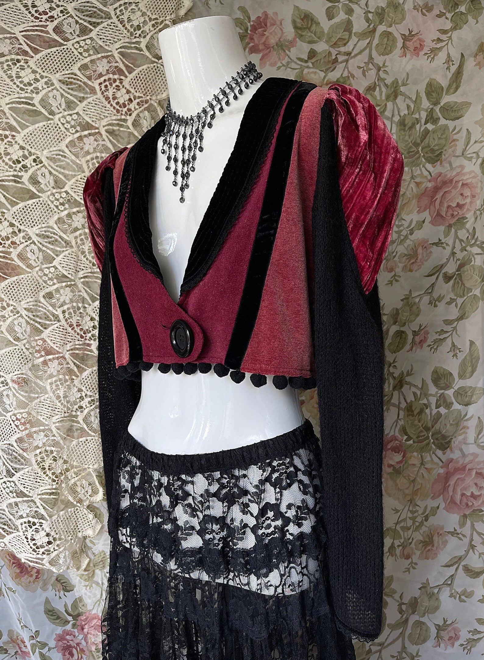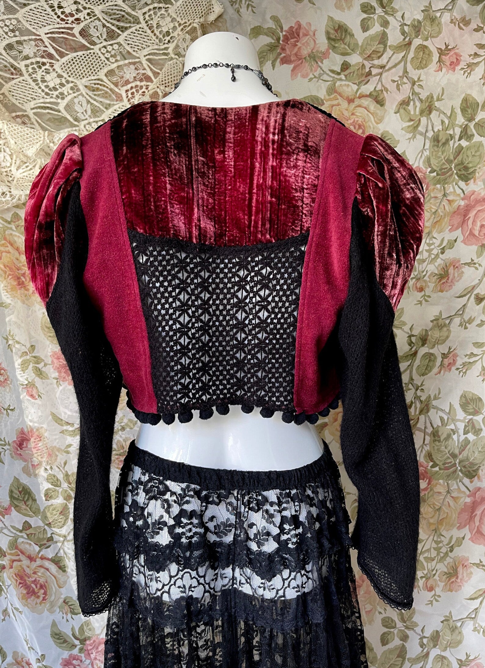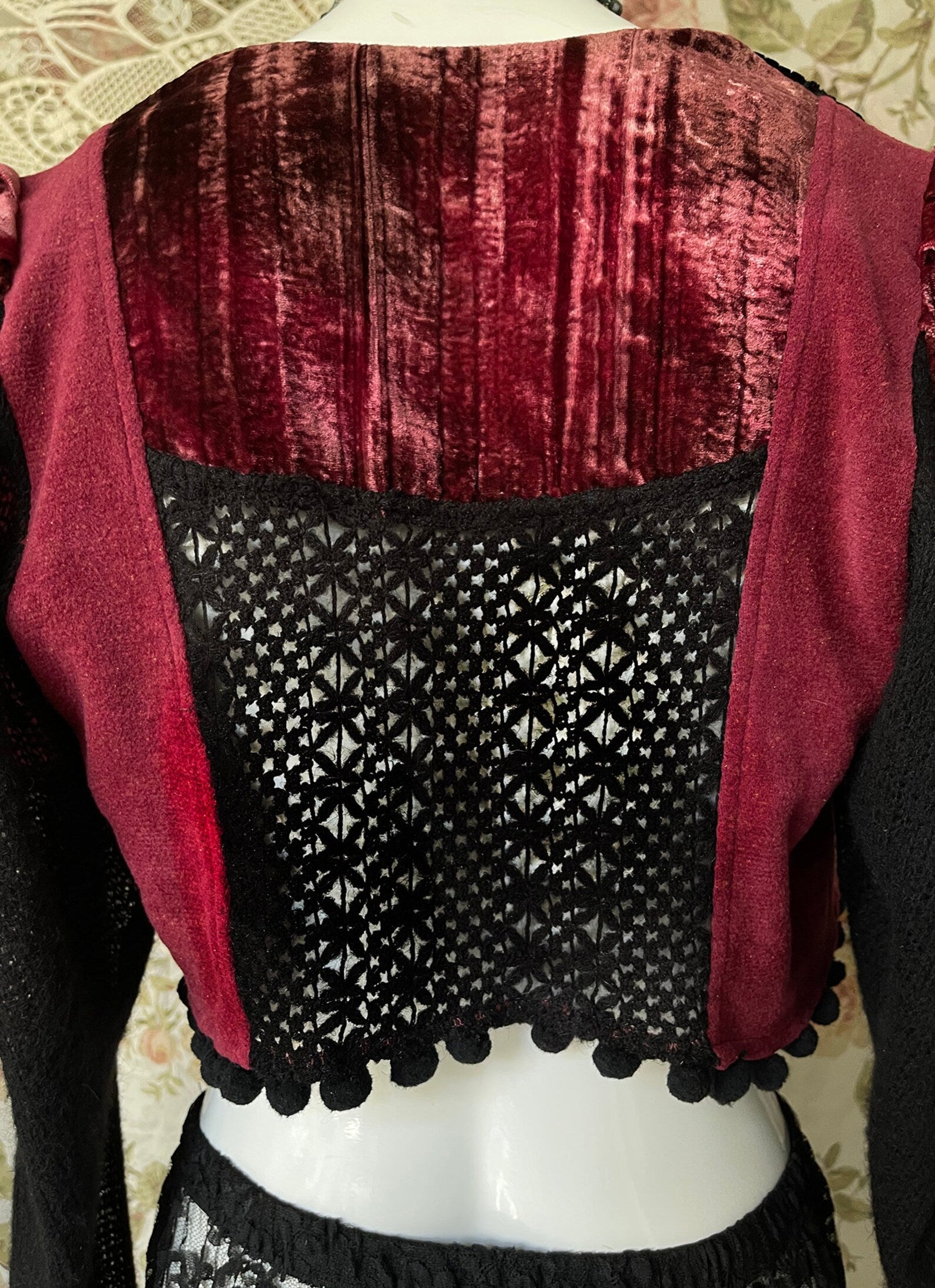 Vintage 70s One Of A Kind Black and Burgundy Velvet Steampunk Cropped Jacket with Black Crocheted Inset at back, with Puff Shoulders and Black Knitted Sleeves. Just amazing! So unique with so much detail including a large Black button to close up the jacket and little black pom poms at the hem. The velvet on the Body of this jacket does have give and can stretch to fit larger sizes. Amazing with a skirt or pair of black jeans and boots. So unique and the colors are rich and beautiful. The best example of the color is in photo 4th image.