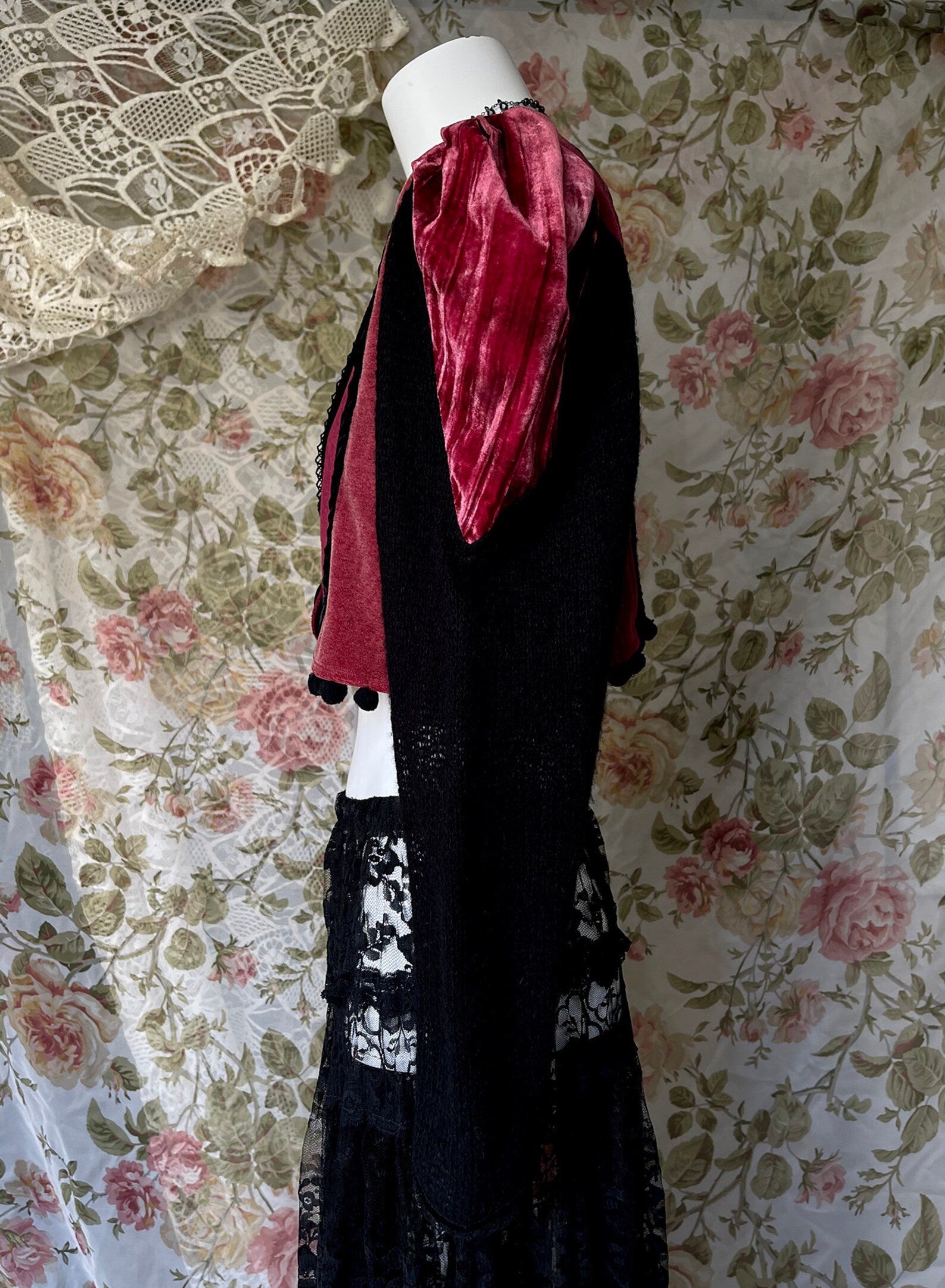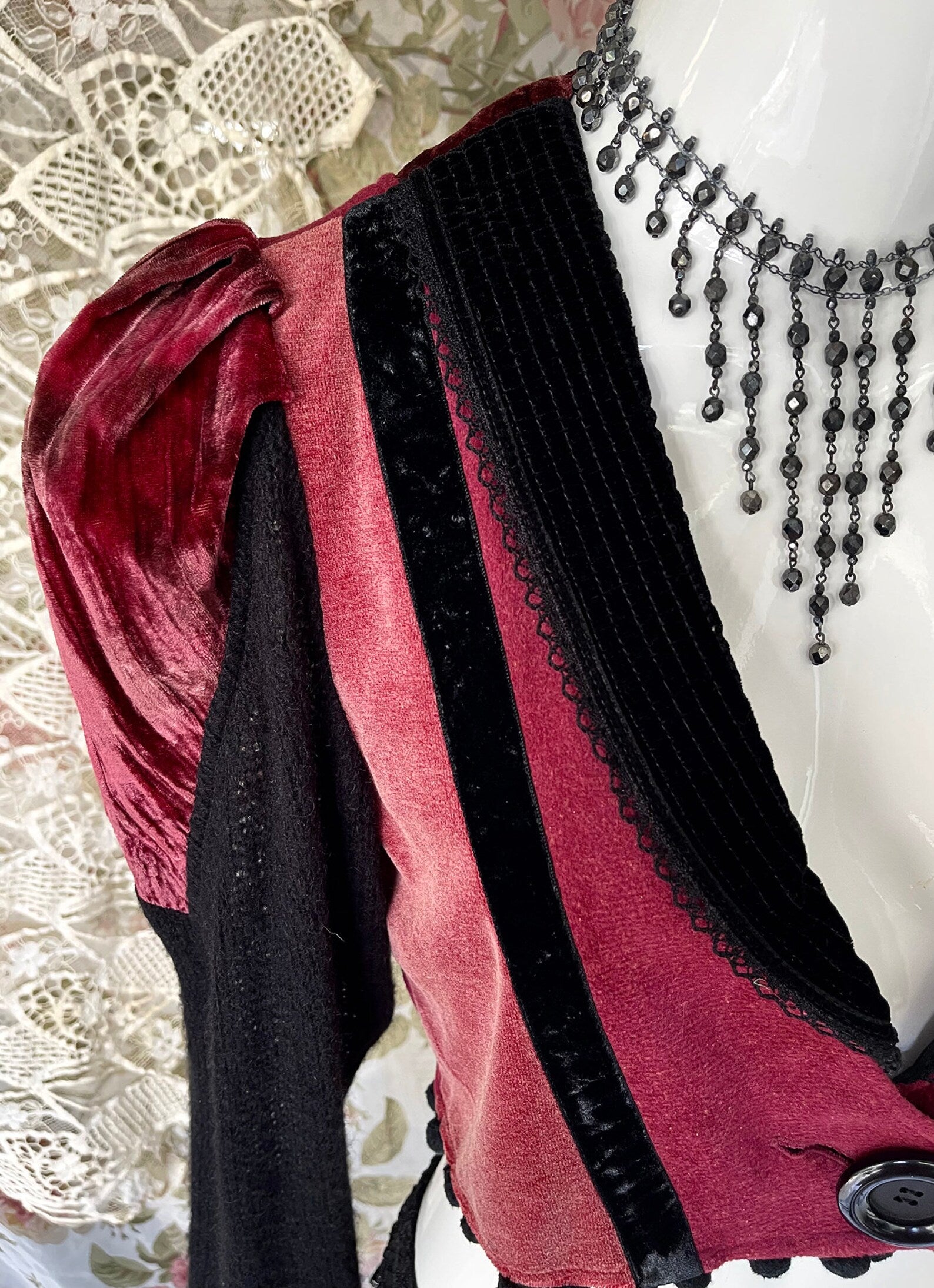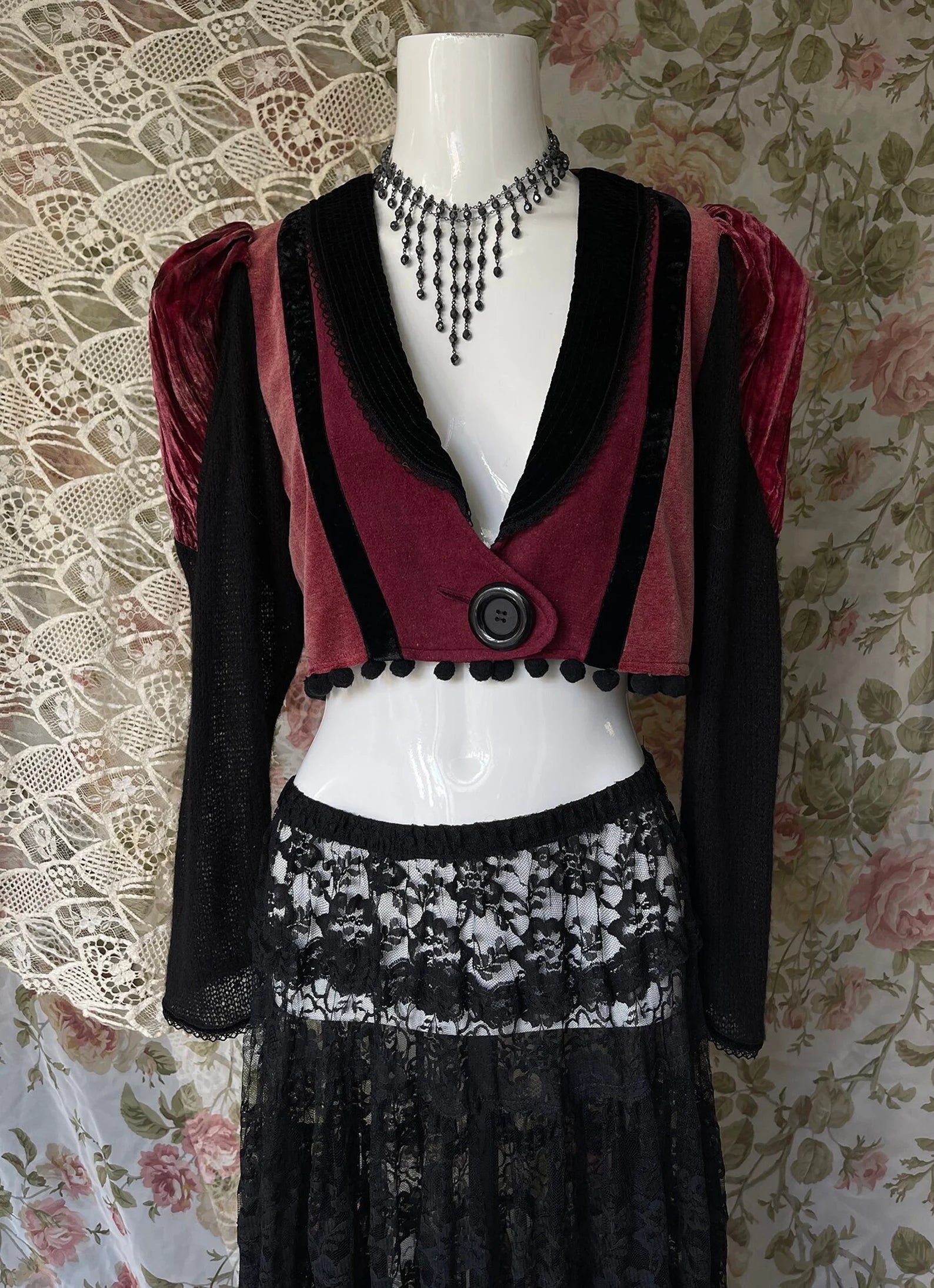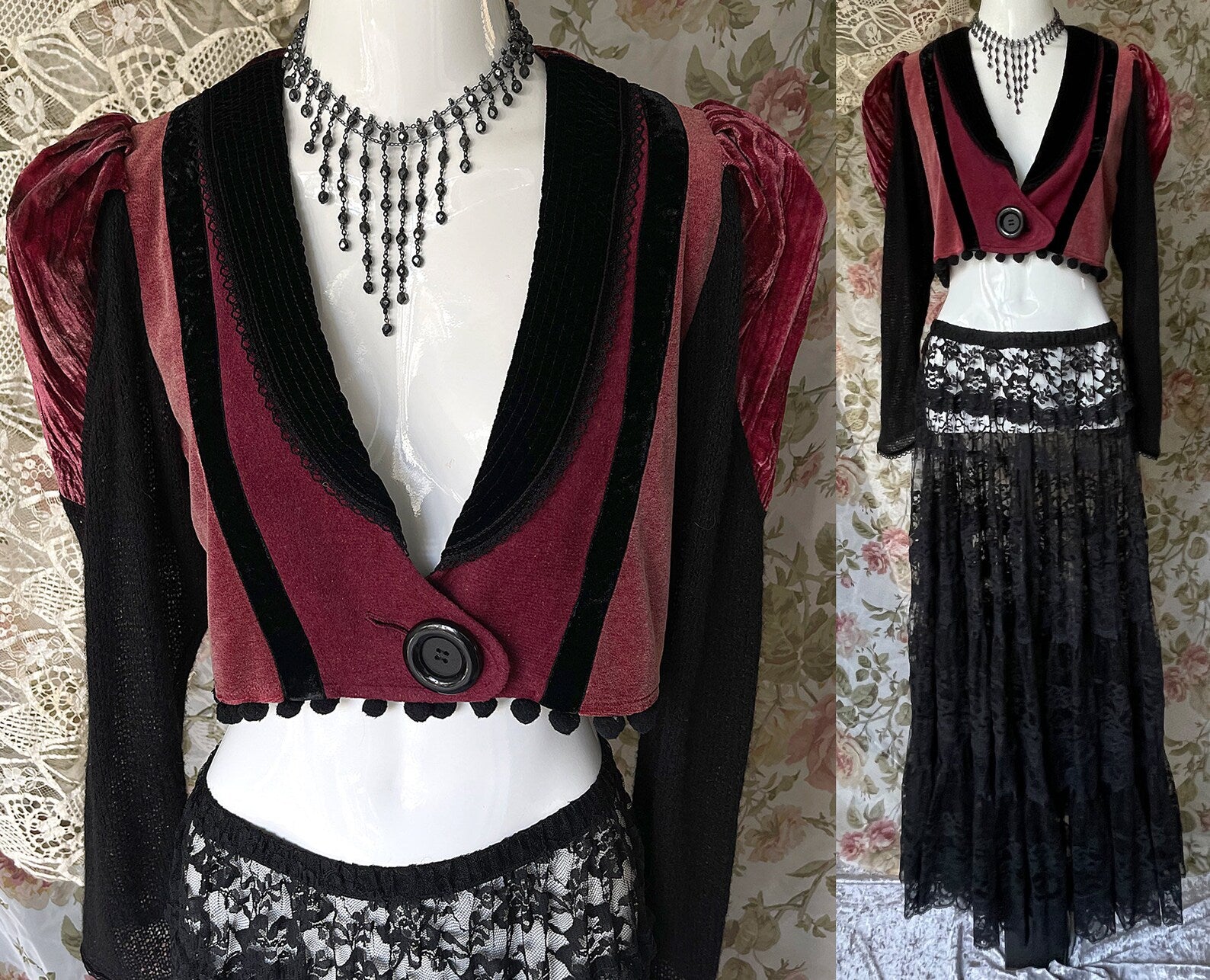 Vintage 70s One Of A Kind Black and Burgundy Velvet Steampunk Cropped Jacket with Black Crocheted Inset at back, with Puff Shoulders and Black Knitted Sleeves. Just amazing! So unique with so much detail including a large Black button to close up the jacket and little black pom poms at the hem. The velvet on the Body of this jacket does have give and can stretch to fit larger sizes. Amazing with a skirt or pair of black jeans and boots. So unique and the colors are rich and beautiful. The best example of the color is in photo 4th image.