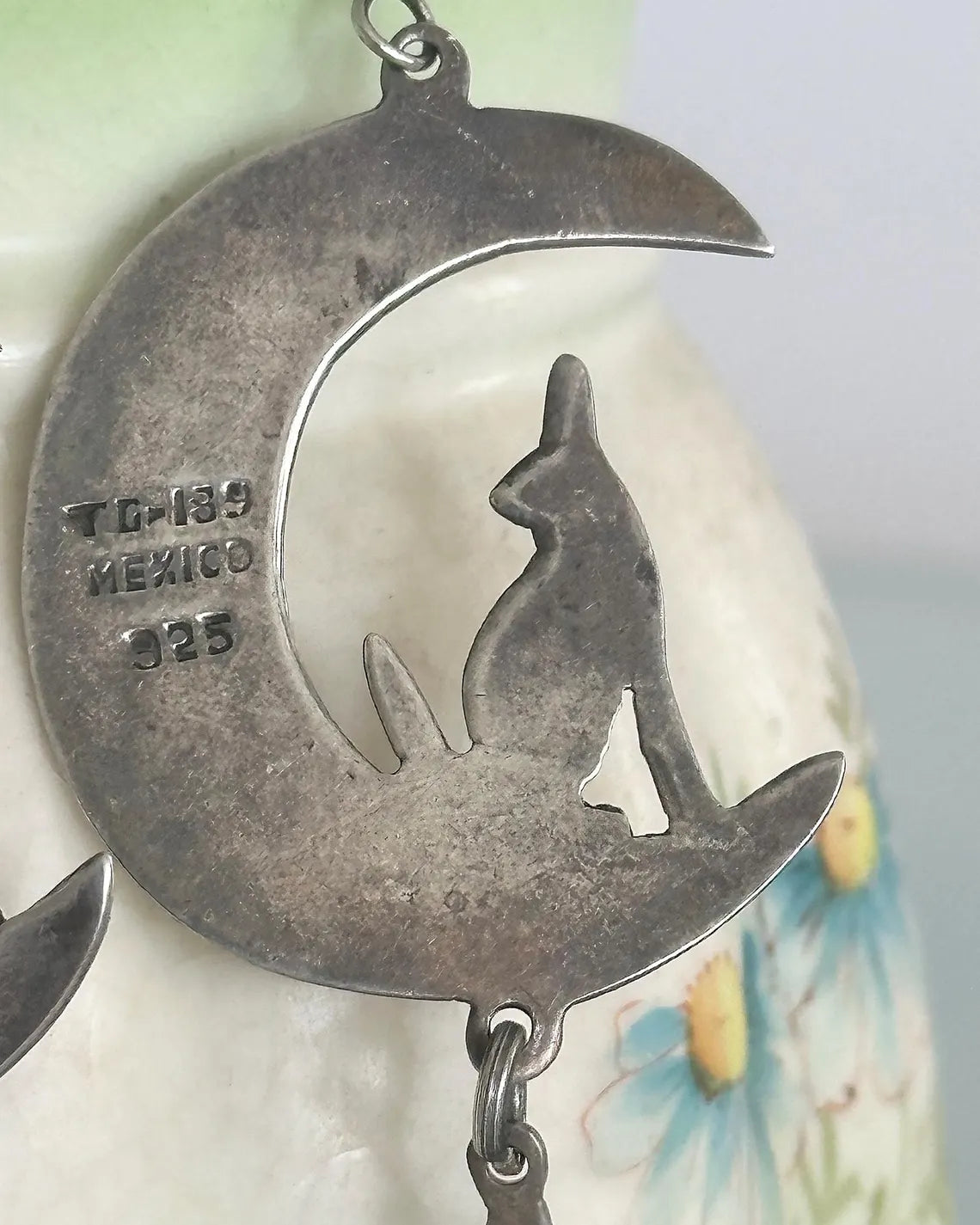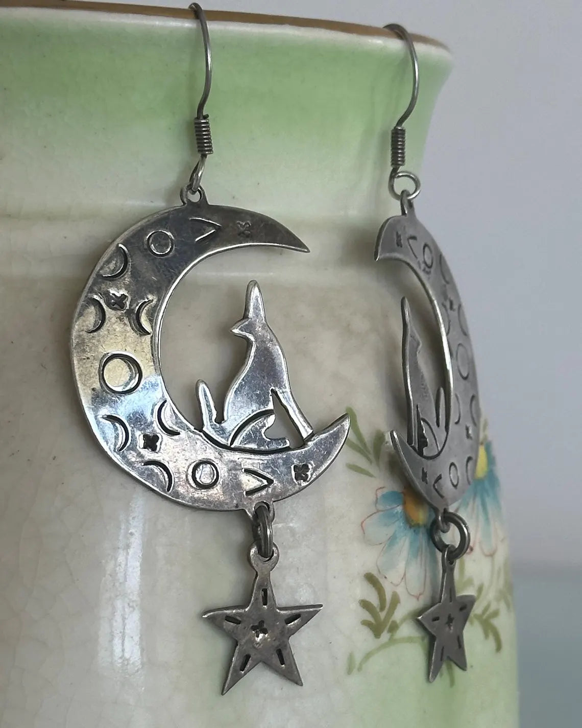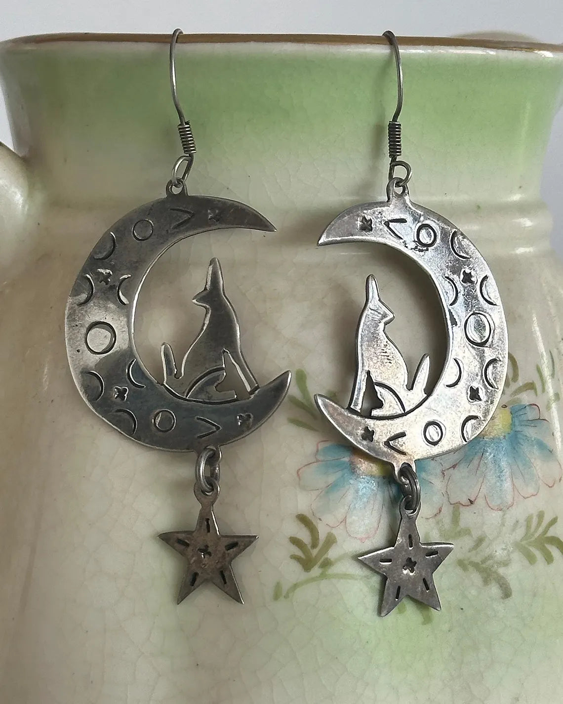 Vintage 925 Sterling Silver Coyote Howling at The Moon and Star Stamped Drop Earrings with Silver Ear Hooks. Gently tarnished. Can be cleaned more if you prefer them that way. I personally love them a bit aged. Such a unique, charming design. Lightweight and easy to wear.