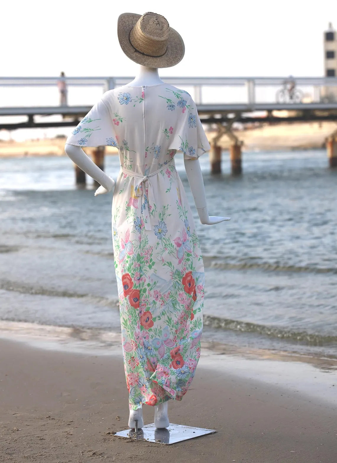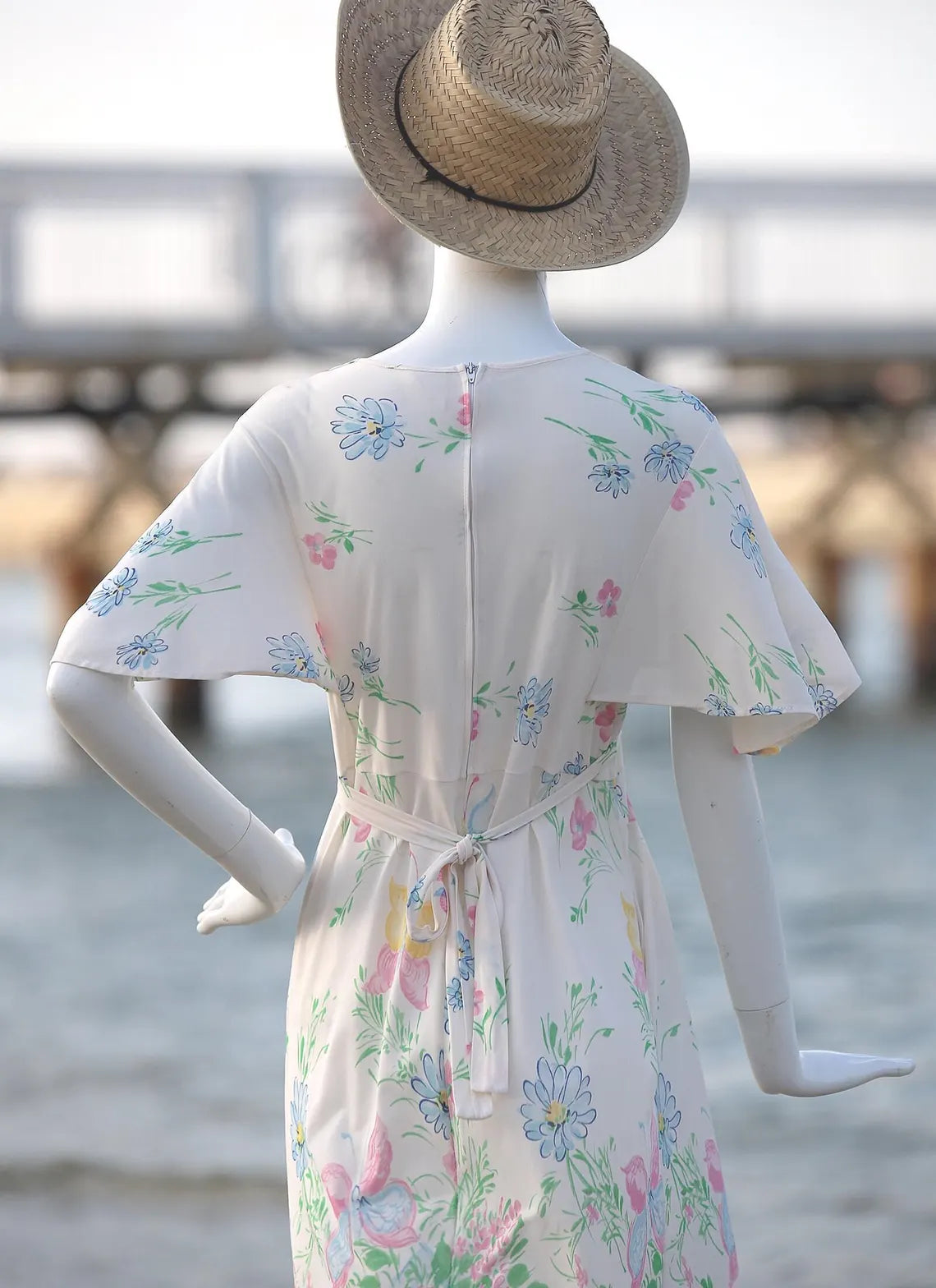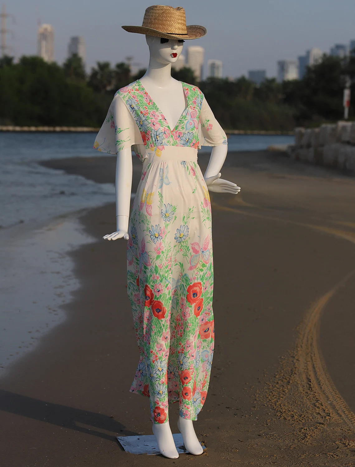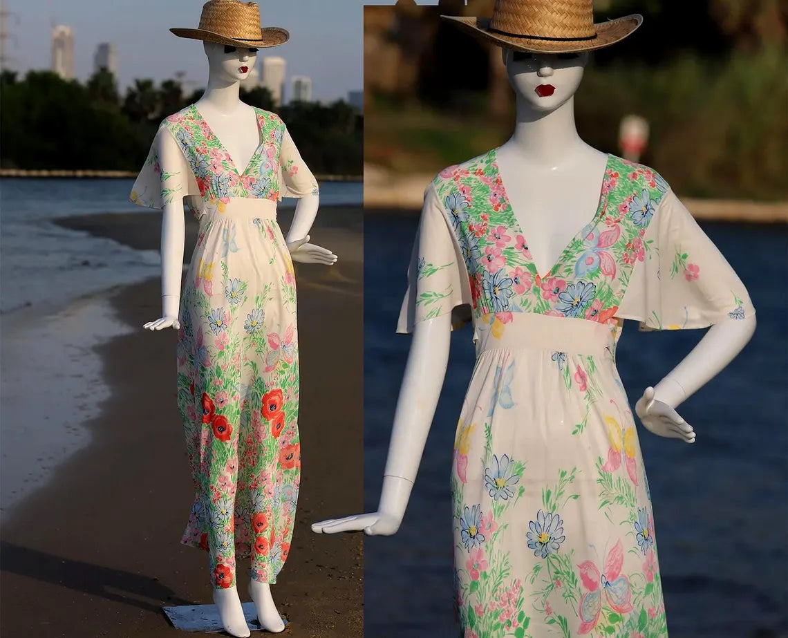 Vintage 70s White Floral BohoBell Sleeve Maxi Dress with V Neck that ties to the back, with the most amazing Pastelly Floral Print. I have rarely seen such a beautiful print. Like a vintage Floral Painting! Super soft and lightweight vintage Nylon. You will feel like you aren't wearing anything. Perfect for a hot day with a pair of sandals, with a pair of heels, or with a pair of Cowboy Boots. One of the prettiest dresses I have come upon! Zips up the back.