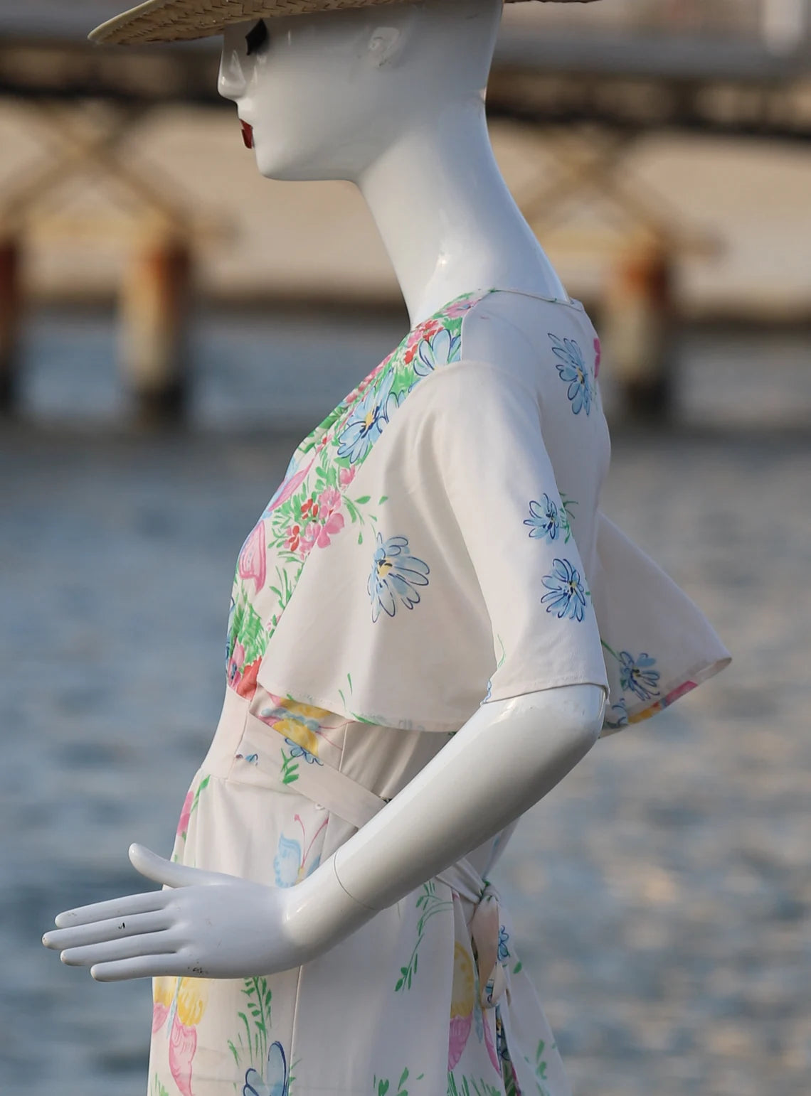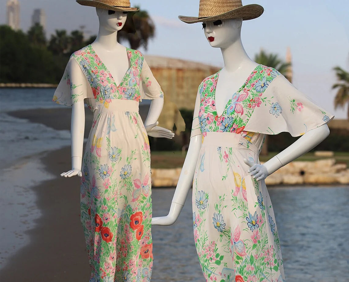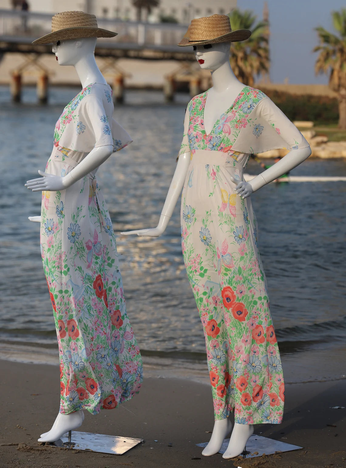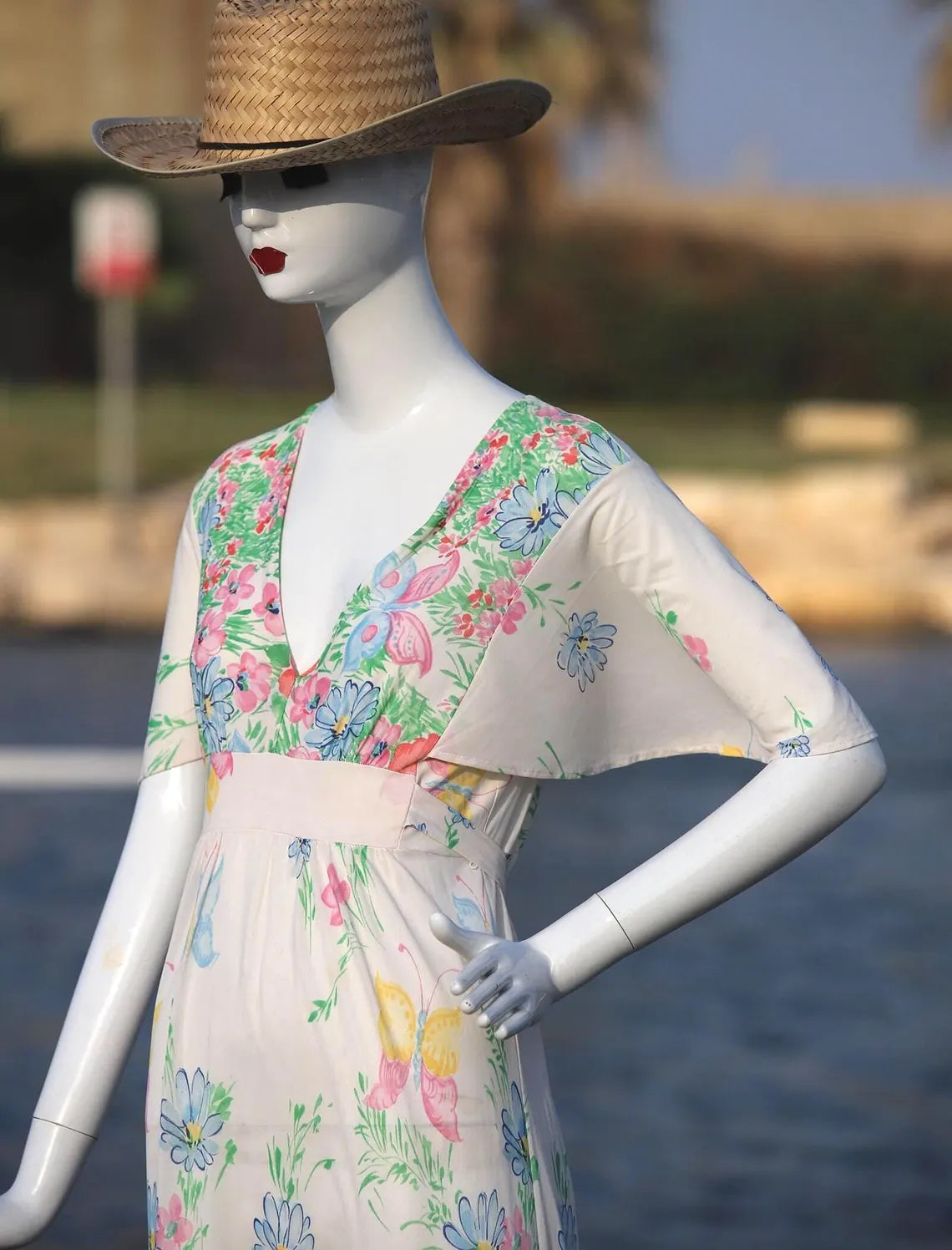 Vintage 70s White Floral BohoBell Sleeve Maxi Dress with V Neck that ties to the back, with the most amazing Pastelly Floral Print. I have rarely seen such a beautiful print. Like a vintage Floral Painting! Super soft and lightweight vintage Nylon. You will feel like you aren't wearing anything. Perfect for a hot day with a pair of sandals, with a pair of heels, or with a pair of Cowboy Boots. One of the prettiest dresses I have come upon! Zips up the back.