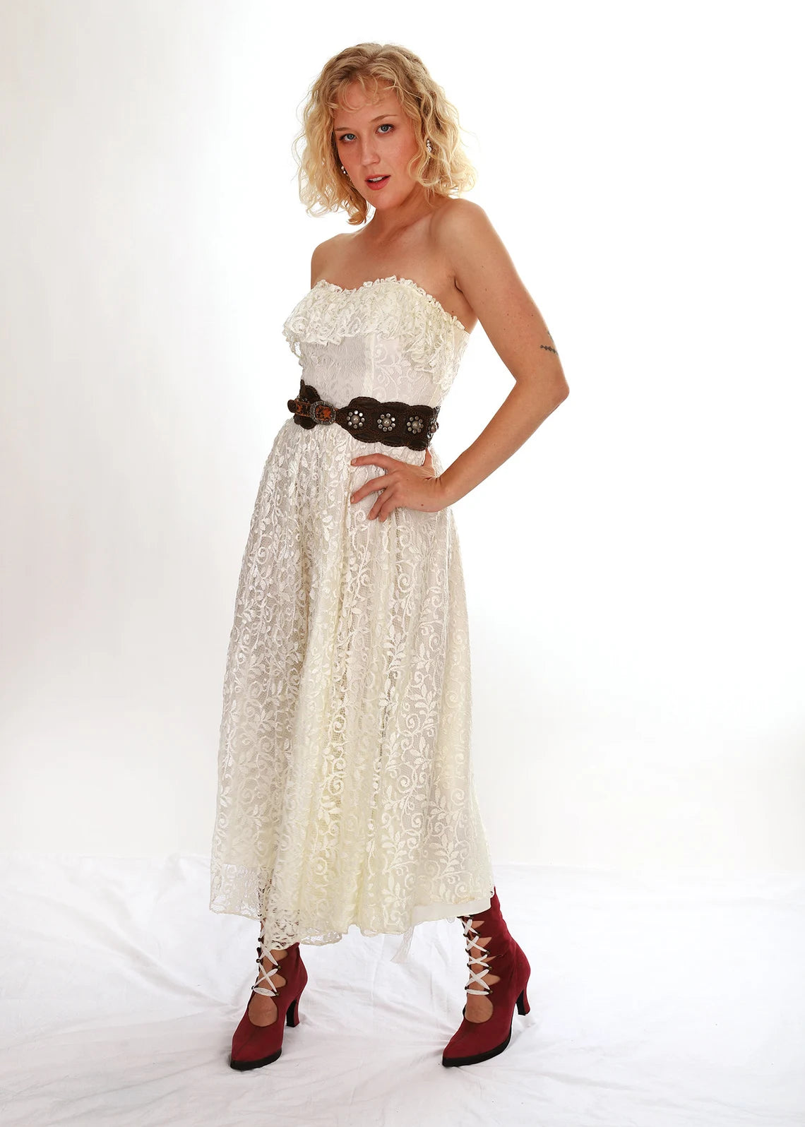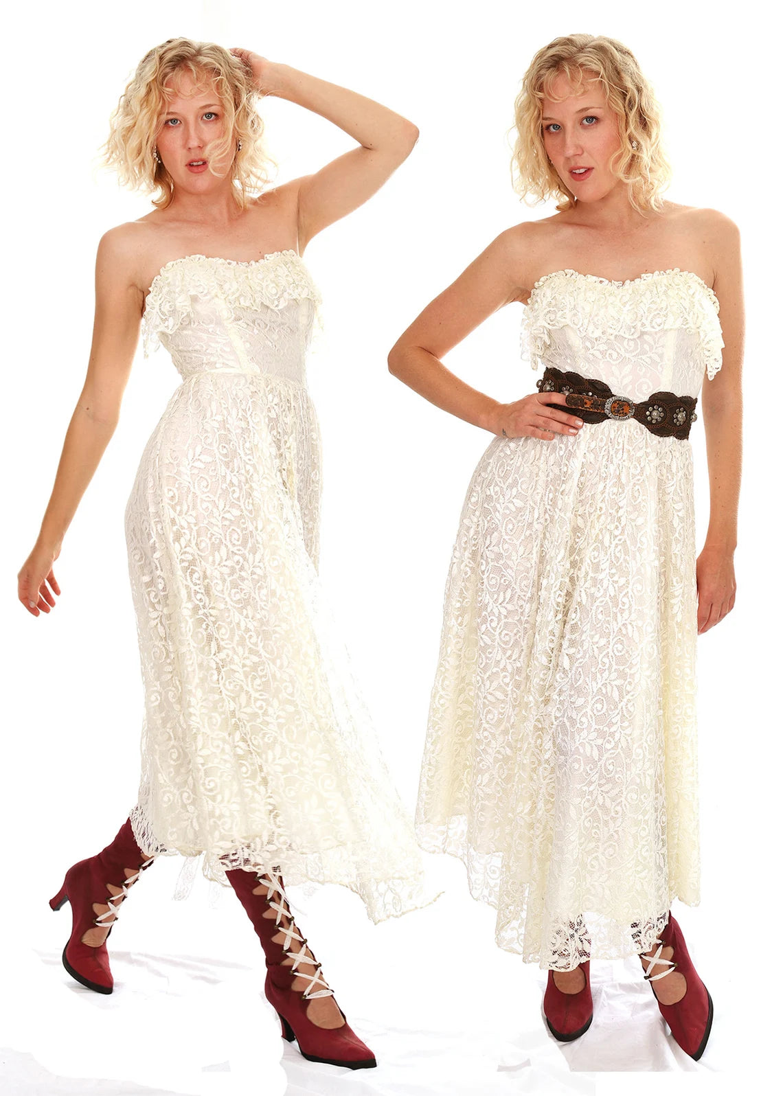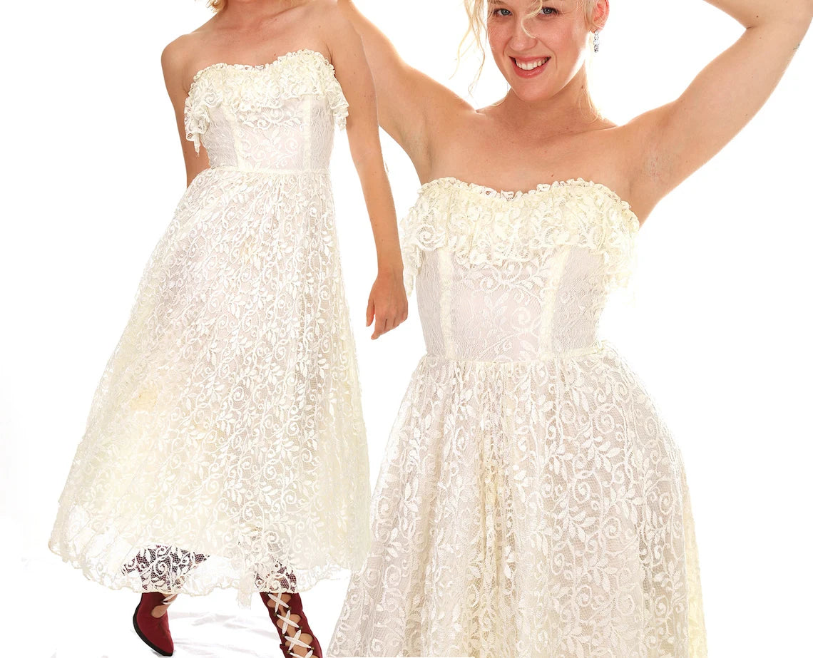 Vintage 70s White Strapless Lace Fit and Flare Dress with Ruffle Trimmed Boned Bodice, that opens into a wide flare gorgeous skirt with a lovely low open back. So flirty and feminine. The fabric does have a bit of a sheen to it which is so pretty. Wear for a beach wedding or just because it so fun. Dress it up or down, with heels or a wonderful pair of lace up boots. Great with flats too! Belted or not just a fabulous dress, and when out get tired of it whIte you can easily dye it to another color of your choice! Perfect for a beach wedding, or after dress for your party when you want to dance around! In great condition. It did have an age stain on the underskirt and skirt, but I was able to get the majority of it out (had to tell you) **(See the last image. The black square shows where the stain was, and with all the fabric it is nearly impossible to detect or I wouldn't have listed it!