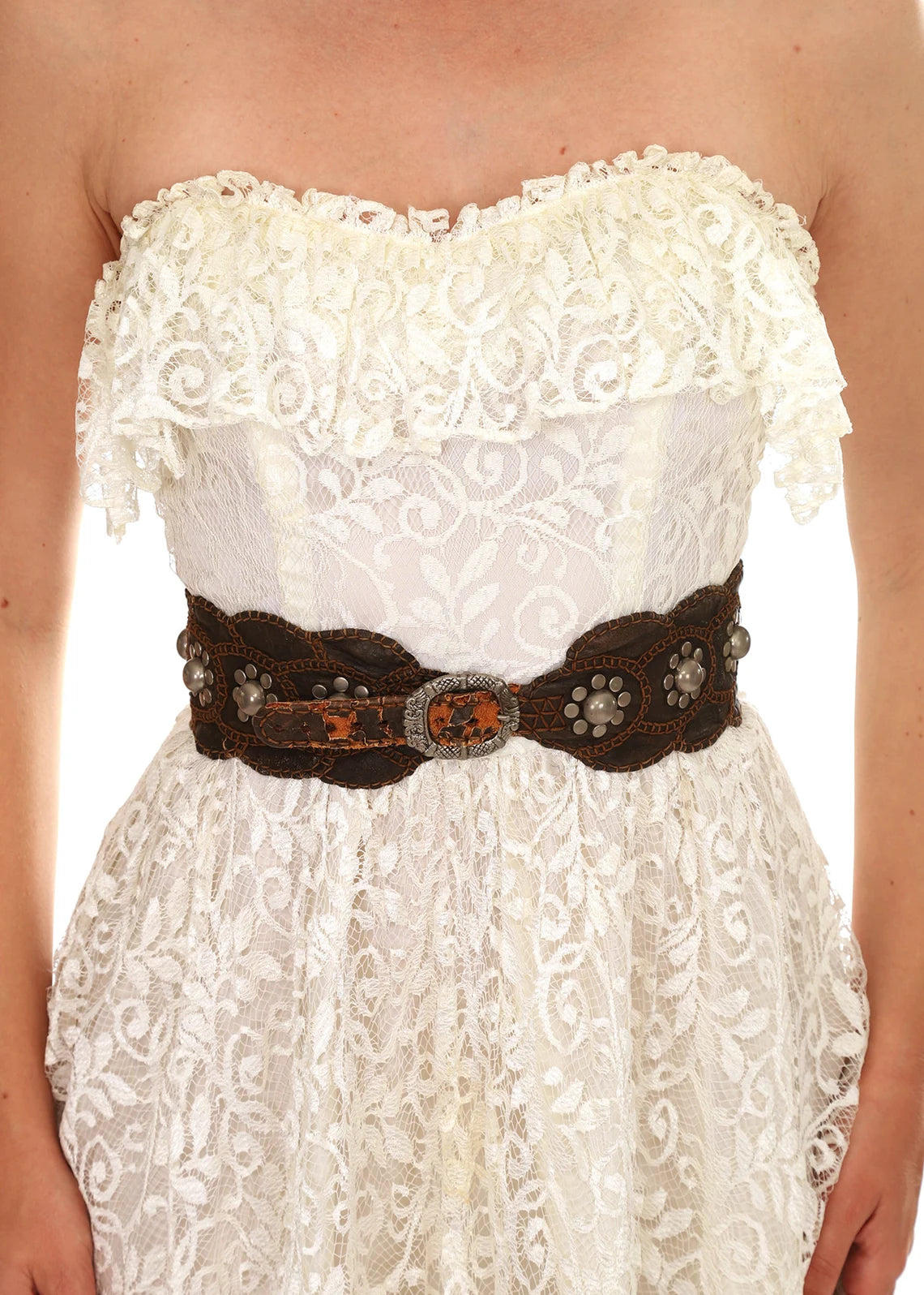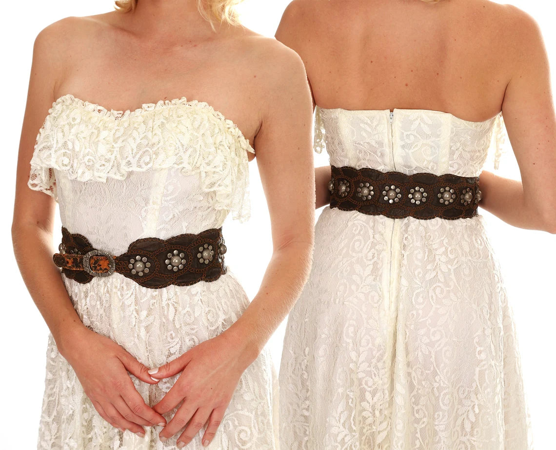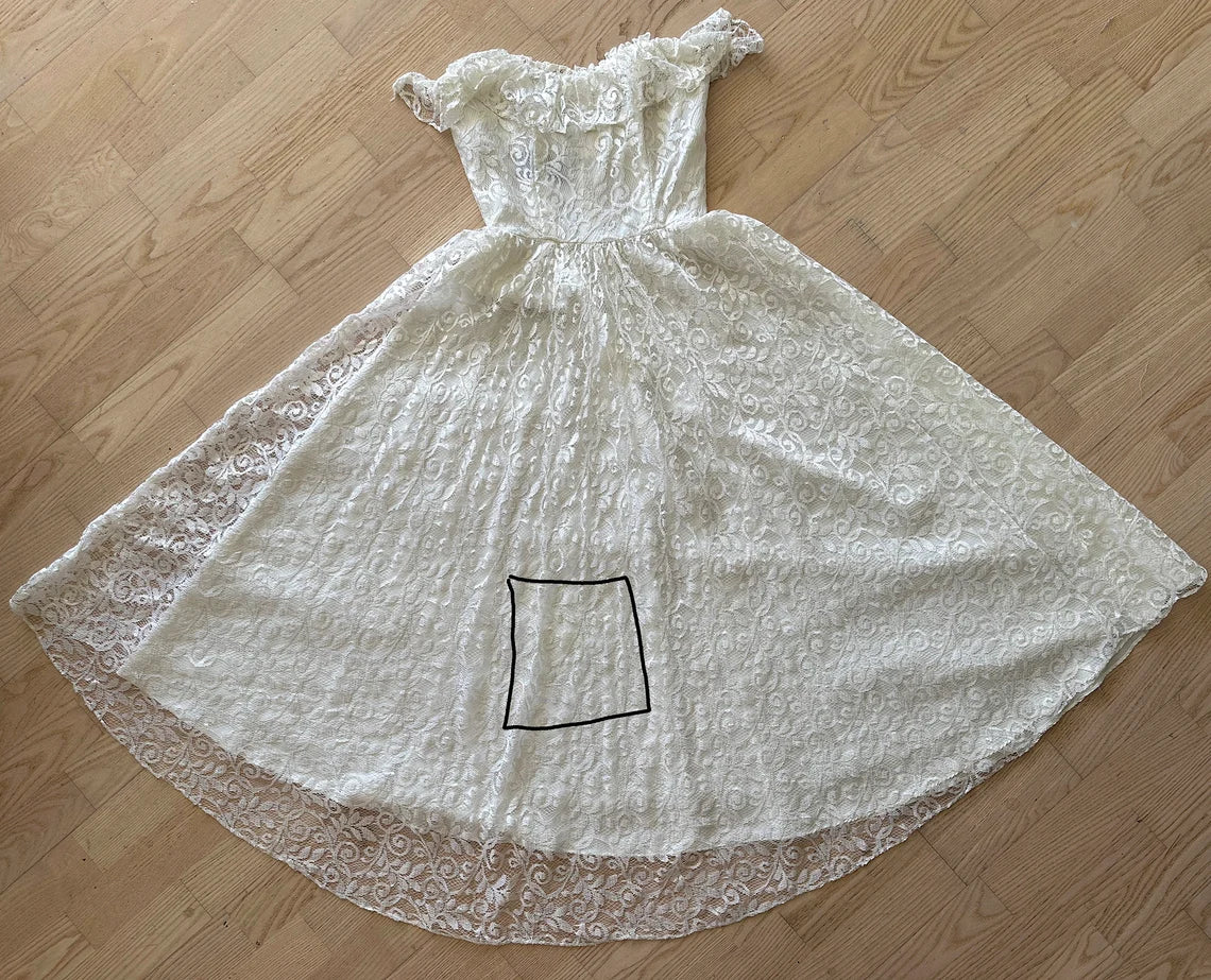 Vintage 70s White Strapless Lace Fit and Flare Dress with Ruffle Trimmed Boned Bodice, that opens into a wide flare gorgeous skirt with a lovely low open back. So flirty and feminine. The fabric does have a bit of a sheen to it which is so pretty. Wear for a beach wedding or just because it so fun. Dress it up or down, with heels or a wonderful pair of lace up boots. Great with flats too! Belted or not just a fabulous dress, and when out get tired of it whIte you can easily dye it to another color of your choice! Perfect for a beach wedding, or after dress for your party when you want to dance around! In great condition. It did have an age stain on the underskirt and skirt, but I was able to get the majority of it out (had to tell you) **(See the last image. The black square shows where the stain was, and with all the fabric it is nearly impossible to detect or I wouldn't have listed it!