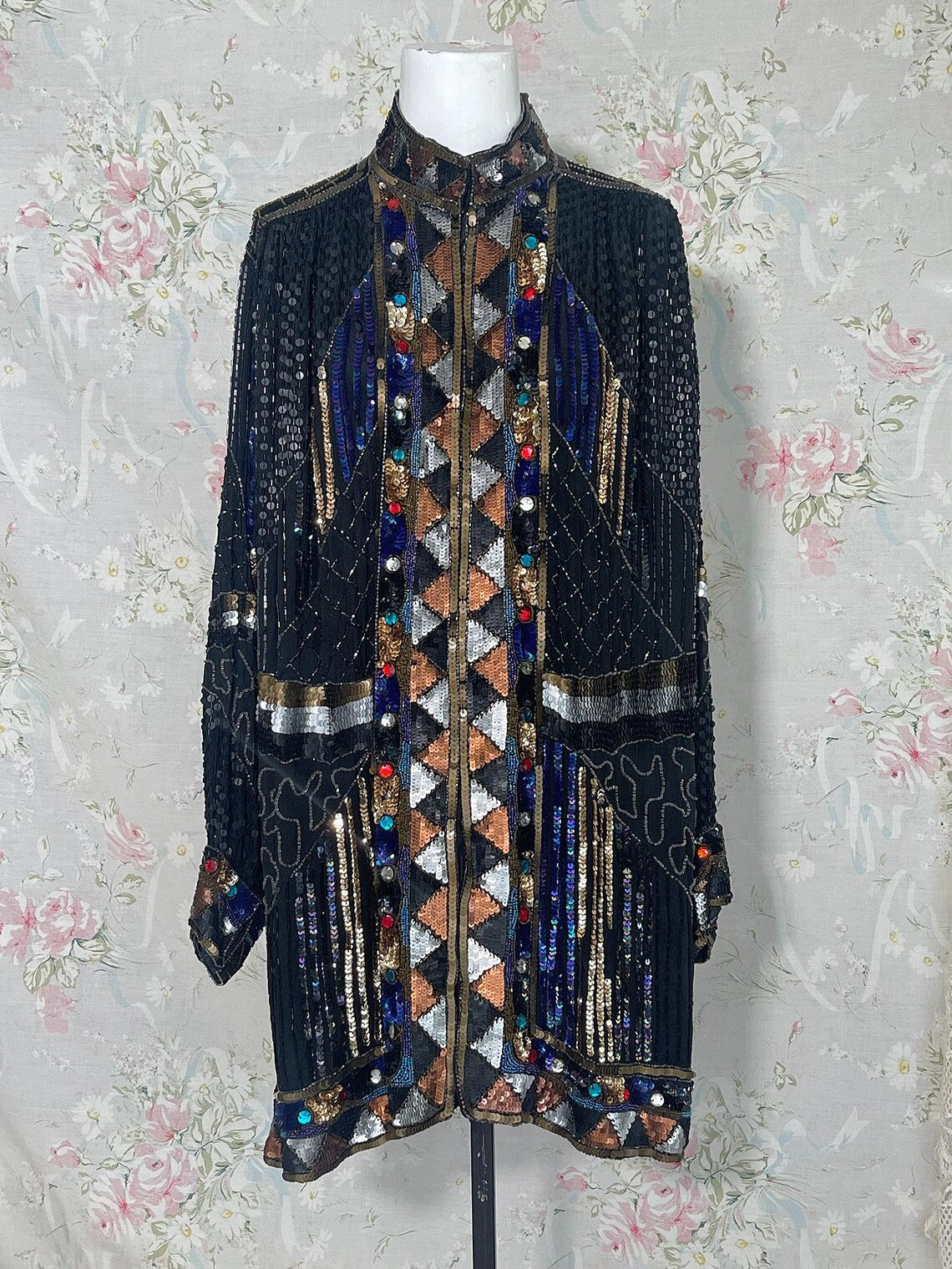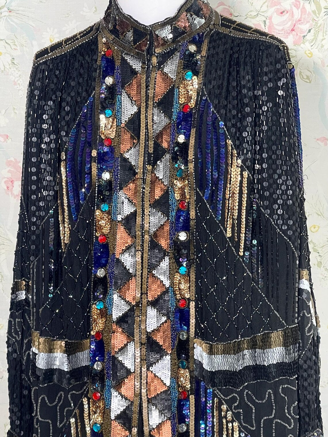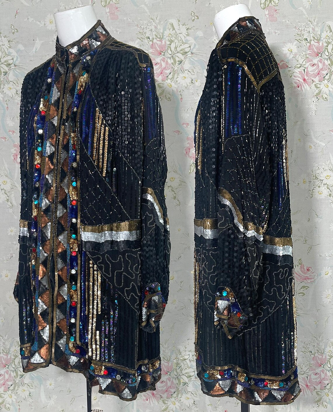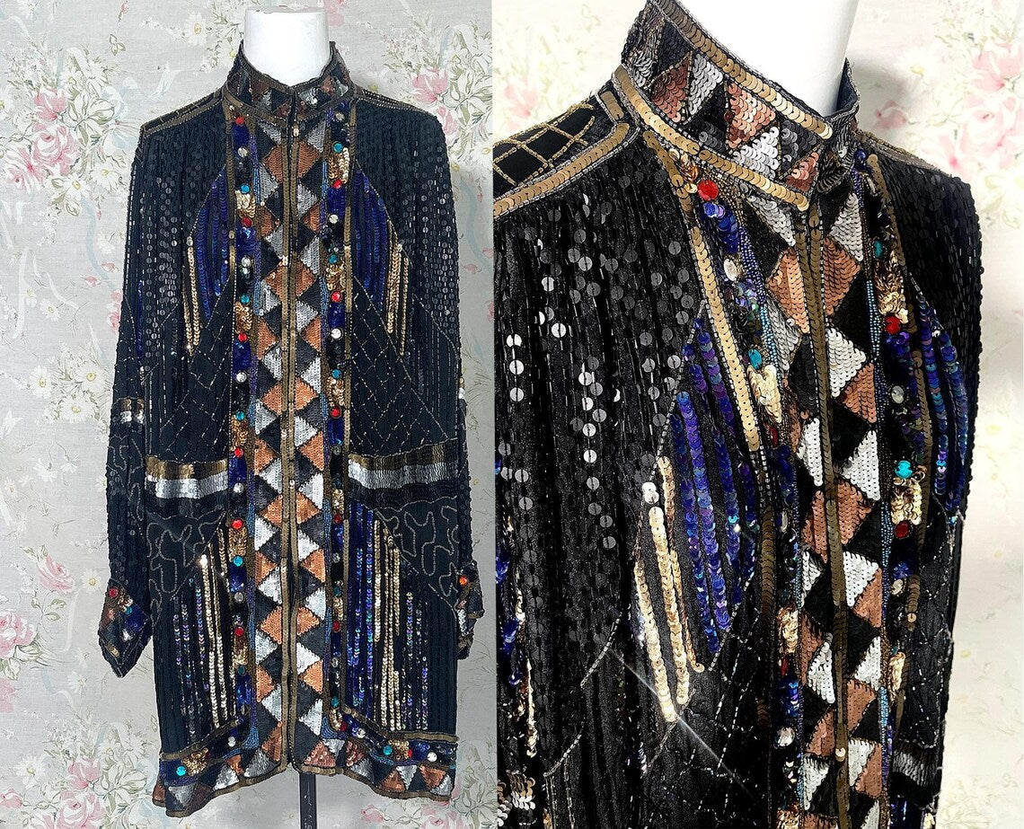 Vintage 80s Black, Bronze Heavily Sequined Beaded Long Jacket with Jewels. Absolutely stunning 100 % Silk Fully Lined jacket with Chevron Pattern of Bronze Silver and Gold Sequins along the Jackets Closure, Hemline and sleeve cuffs, Black Sequin Jacket , Nehru Collar, with Silver and Bronze Waist, and Multi Colored jeweled Large Rhinestones. Sparkle a plenty in this stunner. Great with Black Jeans and boots, with shimmery Bronzey pants, or silky full skirt. So many colors would work with this fantastic piece. In fabulous condition!