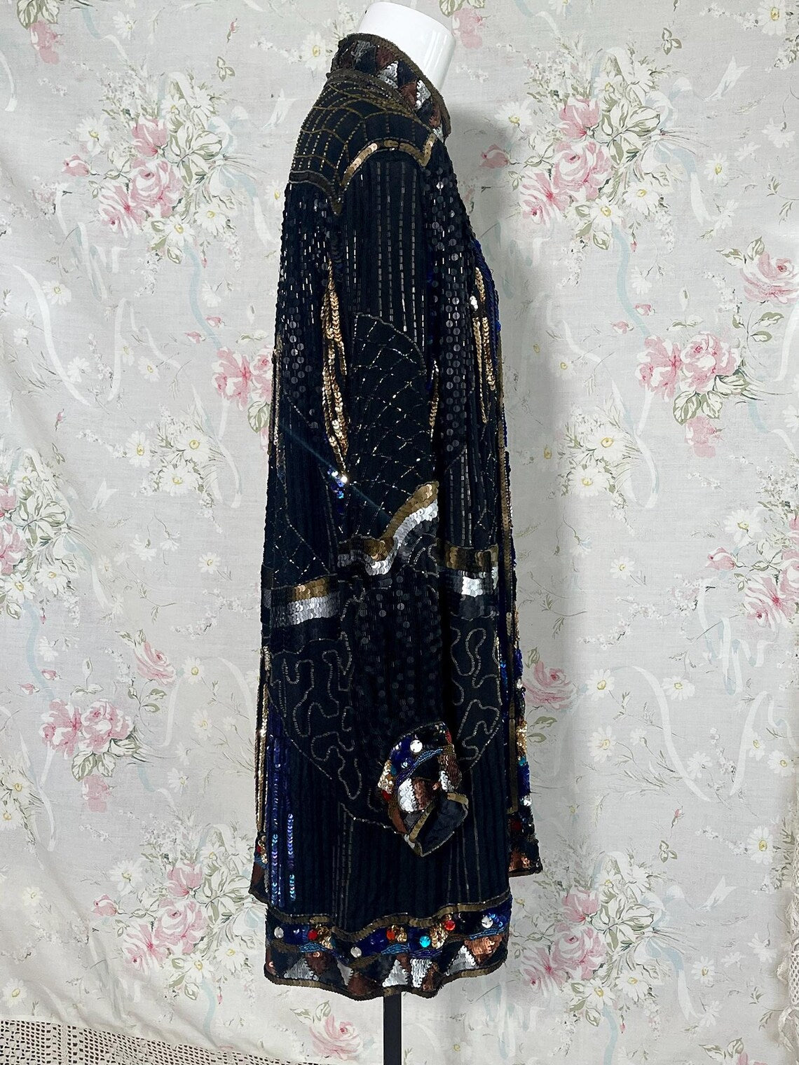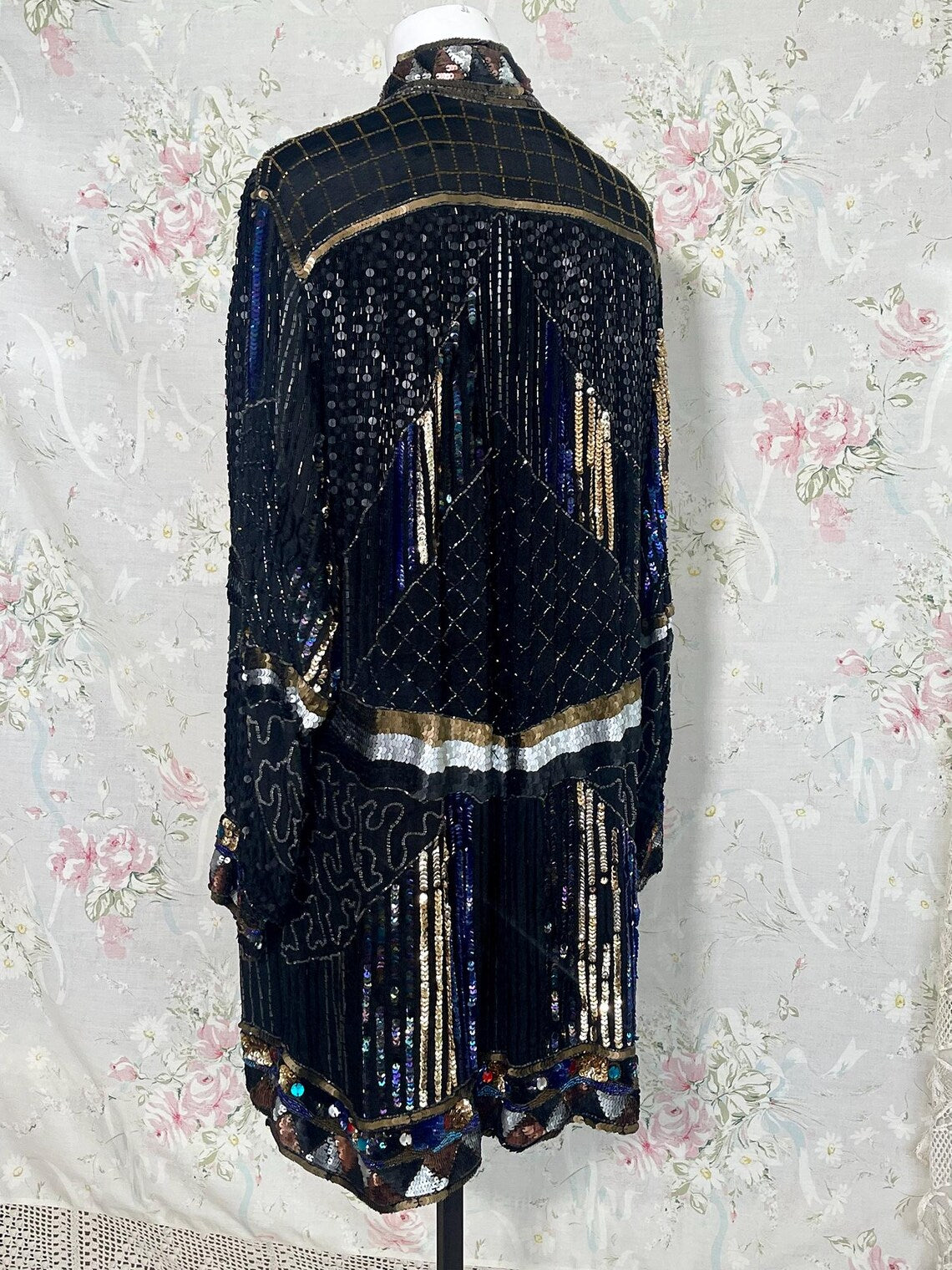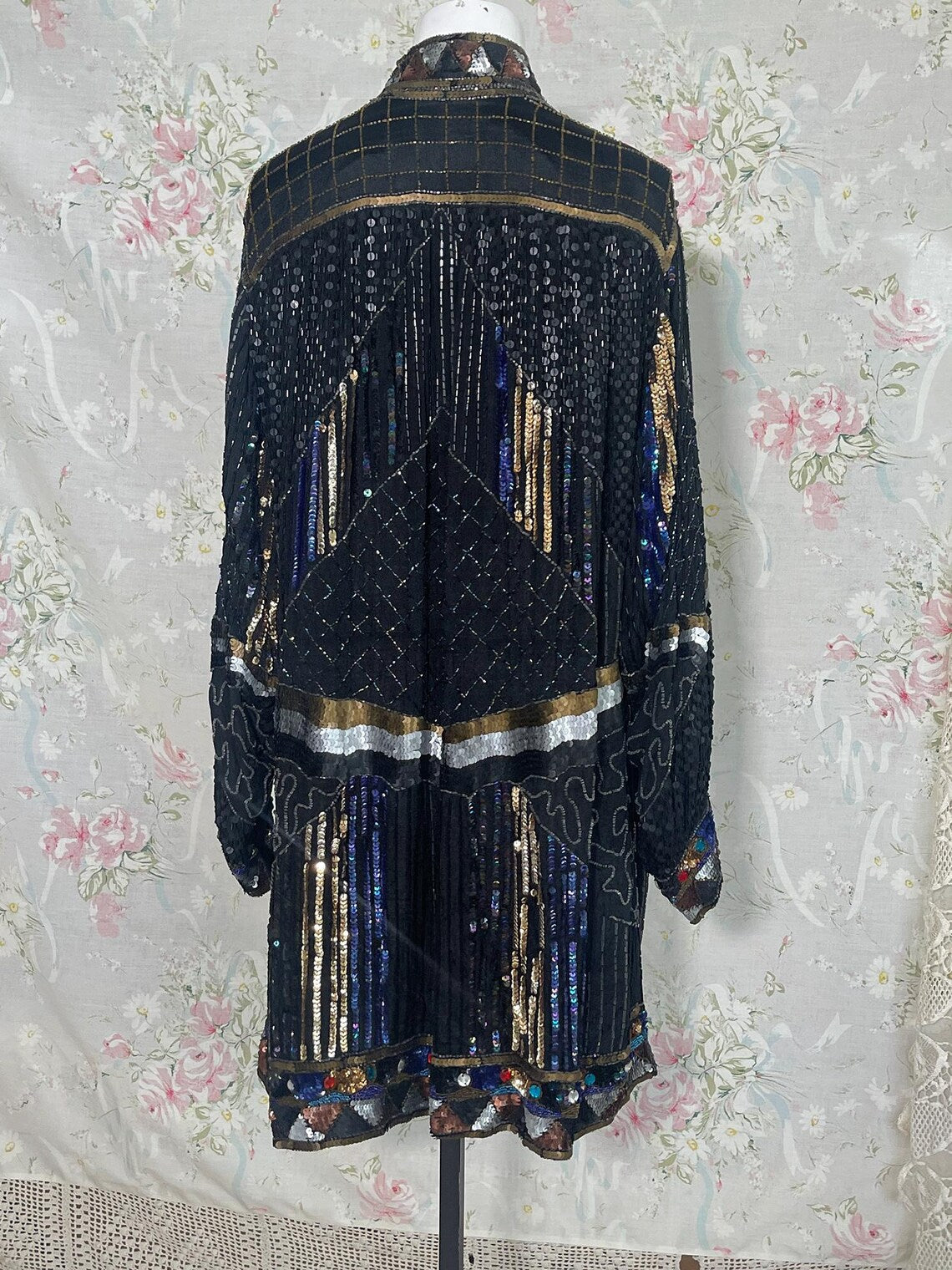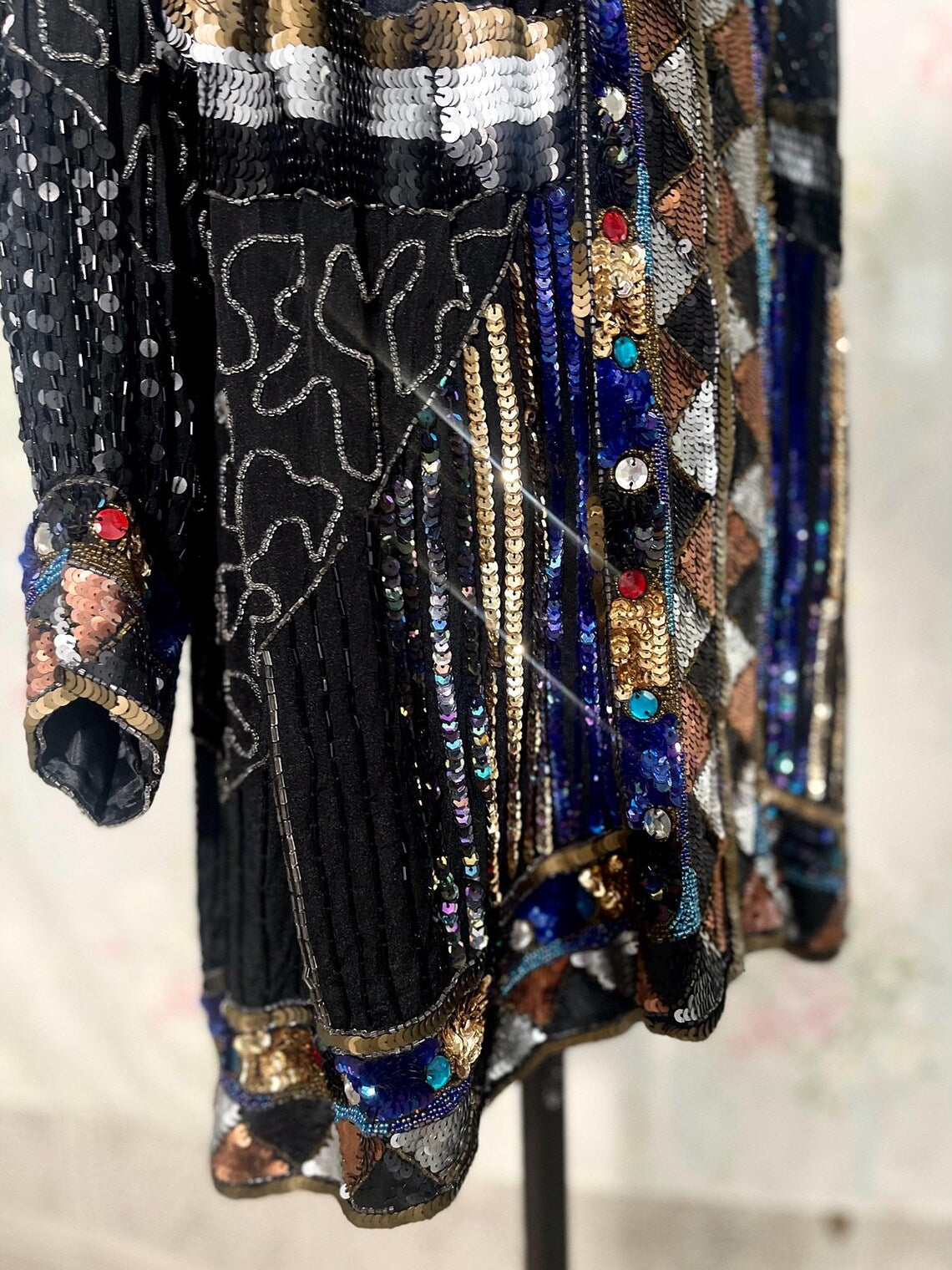 Vintage 80s Black, Bronze Heavily Sequined Beaded Long Jacket with Jewels. Absolutely stunning 100 % Silk Fully Lined jacket with Chevron Pattern of Bronze Silver and Gold Sequins along the Jackets Closure, Hemline and sleeve cuffs, Black Sequin Jacket , Nehru Collar, with Silver and Bronze Waist, and Multi Colored jeweled Large Rhinestones. Sparkle a plenty in this stunner. Great with Black Jeans and boots, with shimmery Bronzey pants, or silky full skirt. So many colors would work with this fantastic piece. In fabulous condition!