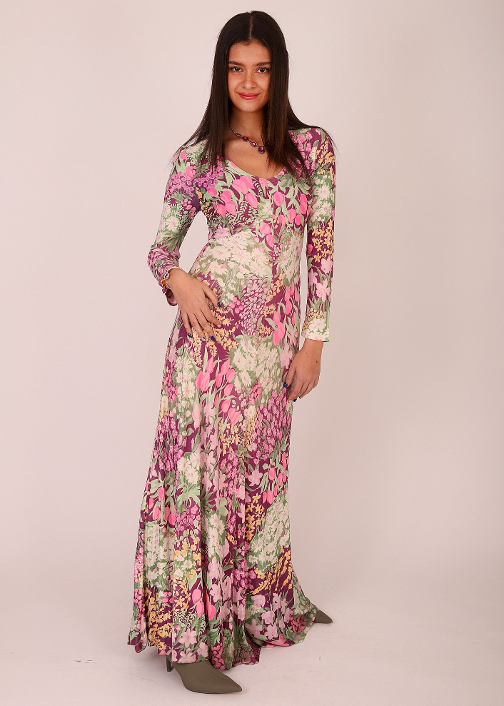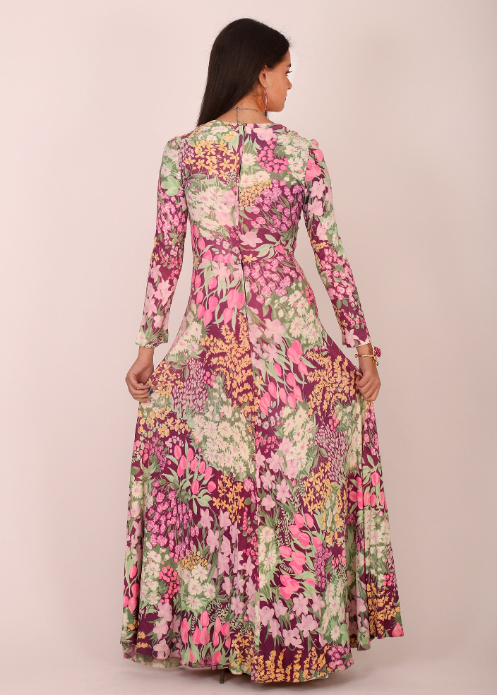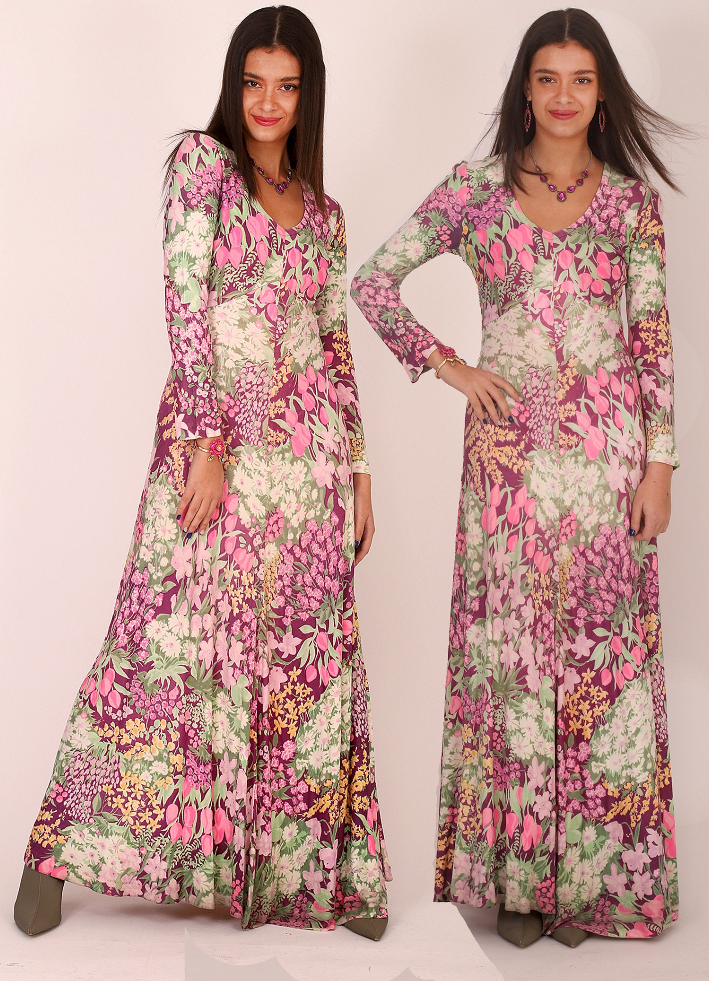 Vintage 70s Bold Floral V Neck Long Sleeve Bohemian Maxi Dress. Absolutely wonderful Vintage Vintage Nylon Dress that is silky soft and has beautiful flare and wide skirt at the bottom so it moves with you beautifully. Just gorgeous bouquets of different flowers in unusual colors in shades of Pink, Soft burgundy and Limey green, yellow and white. Tulips and daisies, and so much more. Just a fantastic super cool, fabulous vintage find. A hard one for me to give up, but I want someone else to love it as much as me!