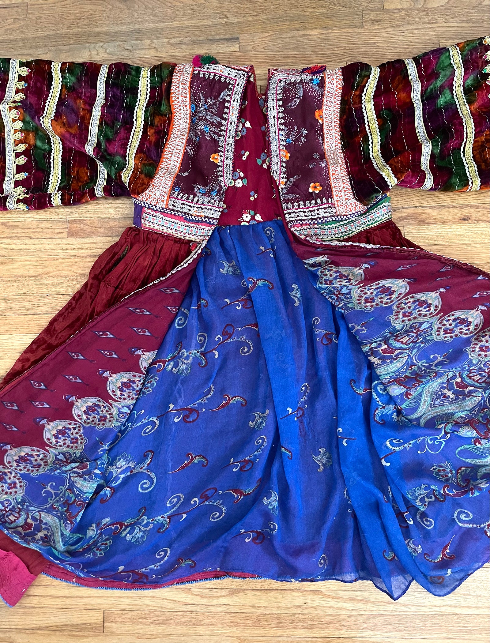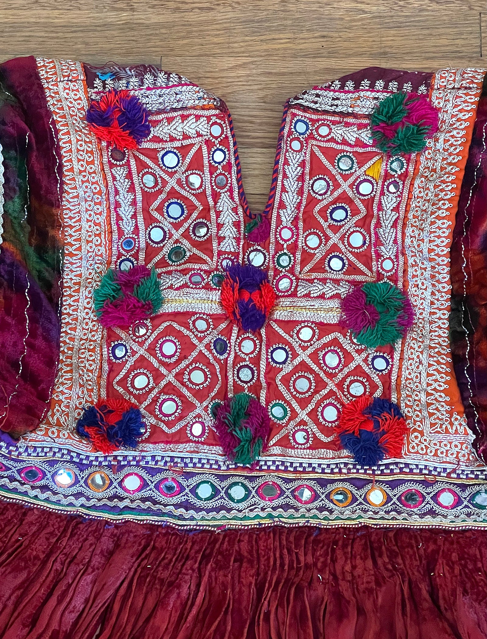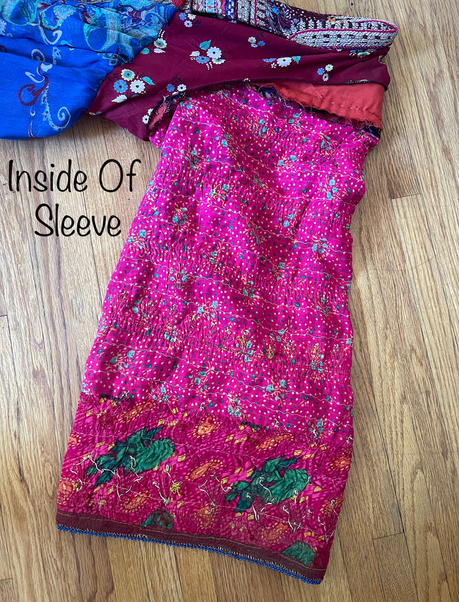 Vintage 70s Burgundy Velvet Poet Sleeve, Heavily Embroidered, Embellished Mirrored Jacket with Tie Dye Massive Velvet Poet Sleeves, Gold and Silver Ribbons, and Threading, with the inside of the jacket being as awesome as the outside with Fuchsia Sleeve Lining, and a gorgeous Royal Blue Paisley and Burgundy Floral Lining in the body. There is so much detail in this jacket. It really is a piece of art! Scattered about are hand beaded flowers, Gold ribbon along the hem and sleeve hems adorned with multi colored rhinestone like beads. The neckline is hand stitched with Blue and red cording. The back of the neck has a V shape. This jacket was hand stitched and machine stitched with such care and creativity. You will definitely be wearing a masterpiece, and feel like a piece of art yourself when you wear this incredible jacket, and yes it has lined pockets!