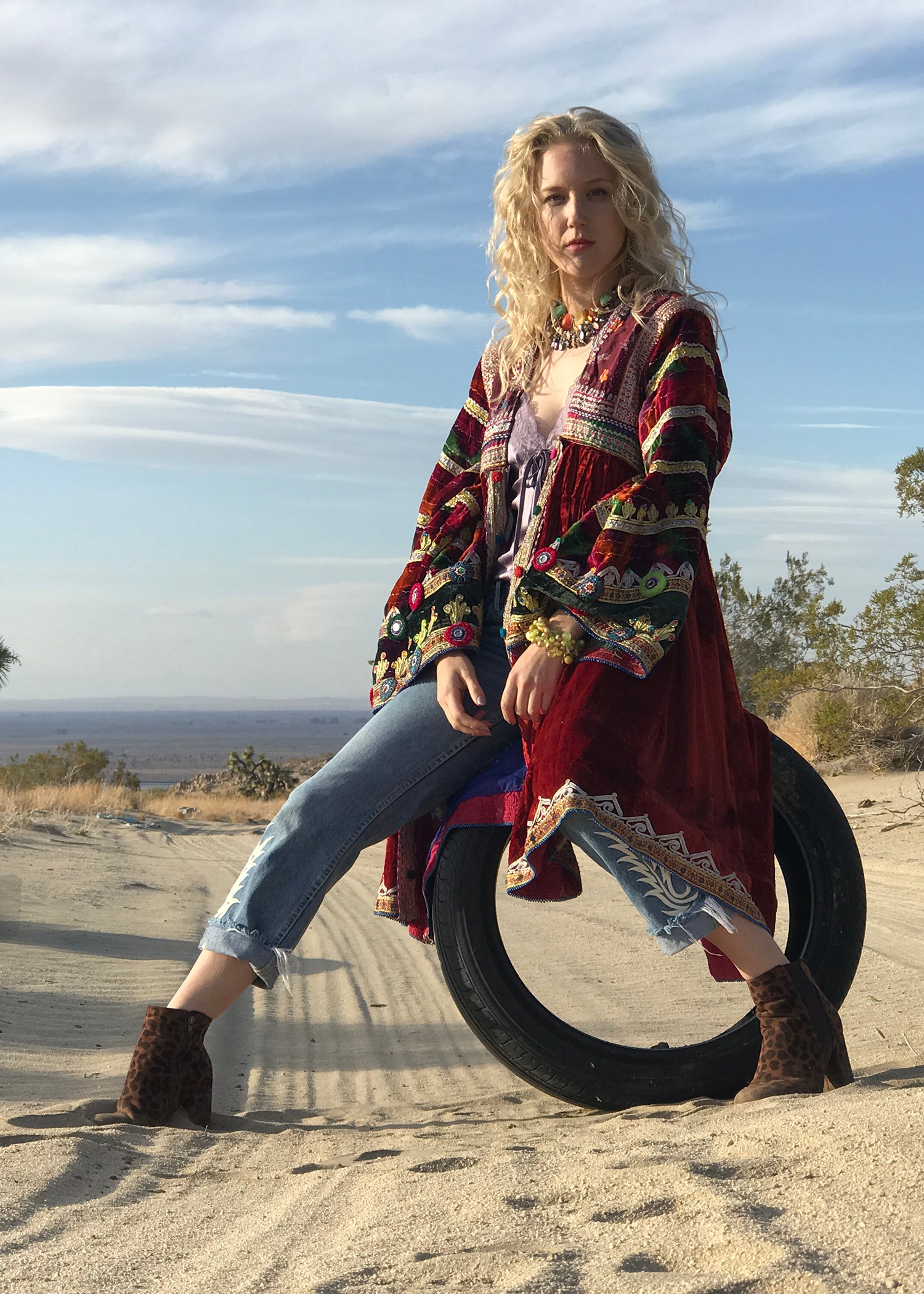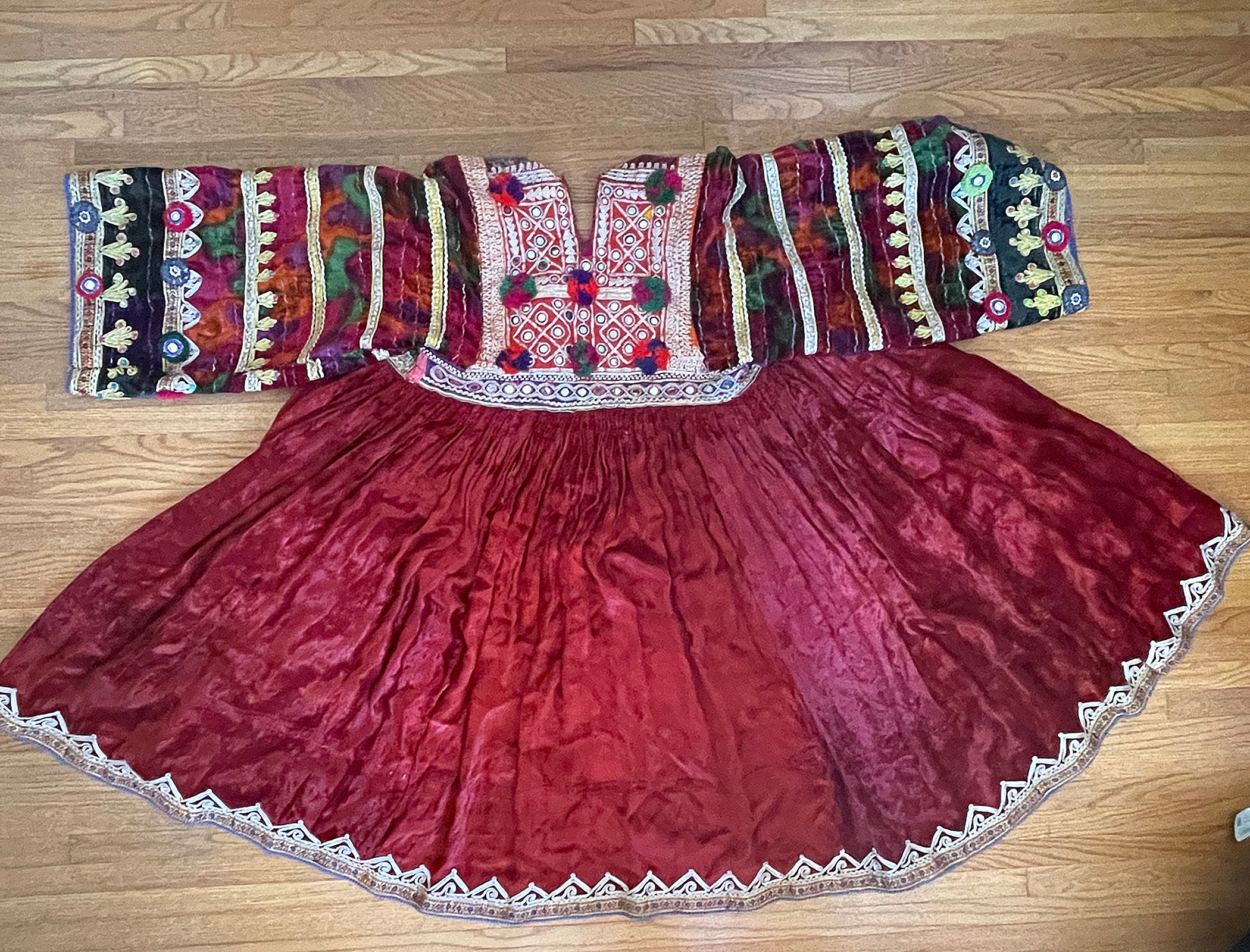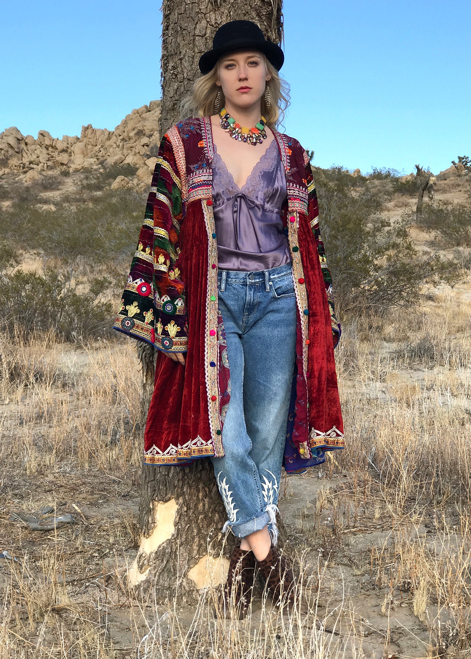Vintage 70s Burgundy Velvet Poet Sleeve, Heavily Embroidered, Embellished Mirrored Jacket with Tie Dye Massive Velvet Poet Sleeves, Gold and Silver Ribbons, and Threading, with the inside of the jacket being as awesome as the outside with Fuchsia Sleeve Lining, and a gorgeous Royal Blue Paisley and Burgundy Floral Lining in the body. There is so much detail in this jacket. It really is a piece of art! Scattered about are hand beaded flowers, Gold ribbon along the hem and sleeve hems adorned with multi colored rhinestone like beads. The neckline is hand stitched with Blue and red cording. The back of the neck has a V shape. This jacket was hand stitched and machine stitched with such care and creativity. You will definitely be wearing a masterpiece, and feel like a piece of art yourself when you wear this incredible jacket, and yes it has lined pockets!