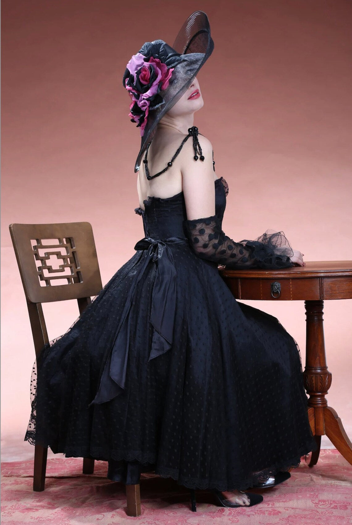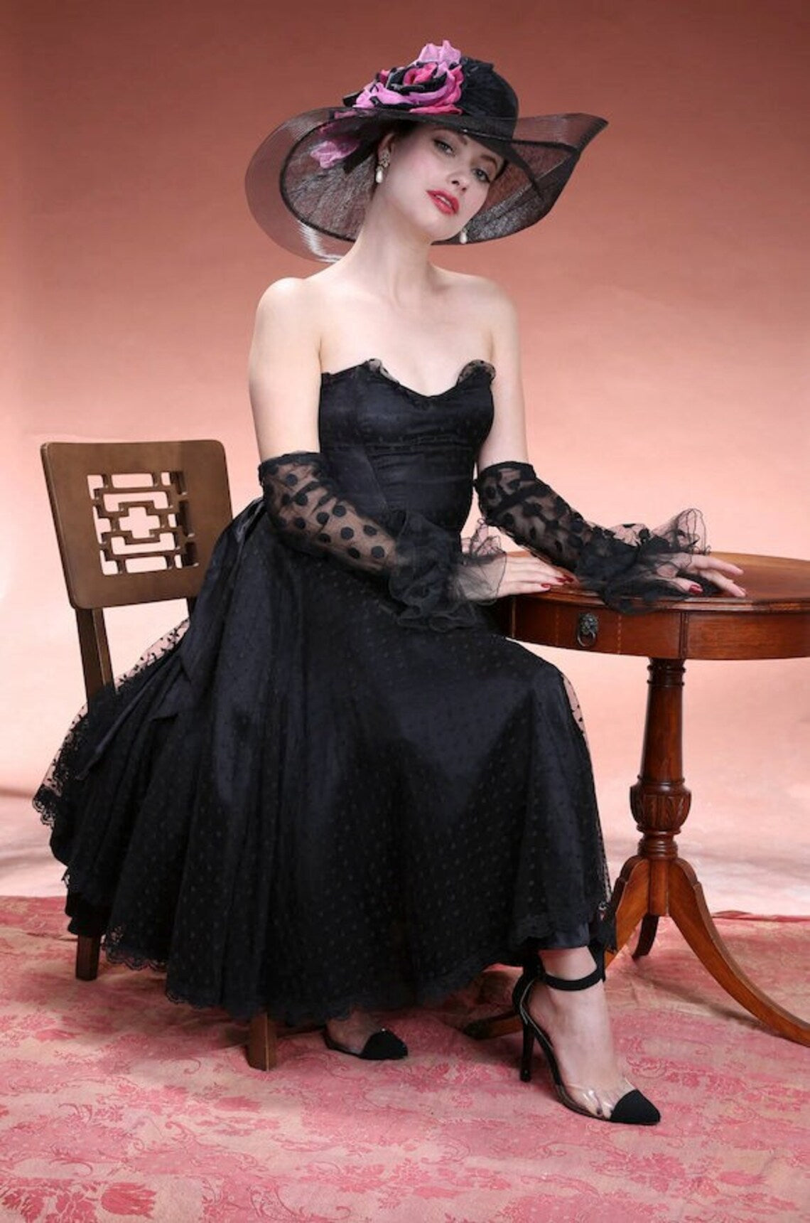 Vintage 80s Black Strapless Gunne Sax Dress by Jessica McLintock. Sweetheart Neckline. Corseted Bodice has soft bones. Zips up the back, opening into a beautiful skirt. Fully lined with Black Satiny Fabric, with Overlay of dotted Lace, and Satin Sash. Perfect for a dressey event, or hippie it up with a pair of Grunge boots. Such a great find. One you will want to wear again and again. Dress was a bit small on Lily, but the zipper closes perfectly.