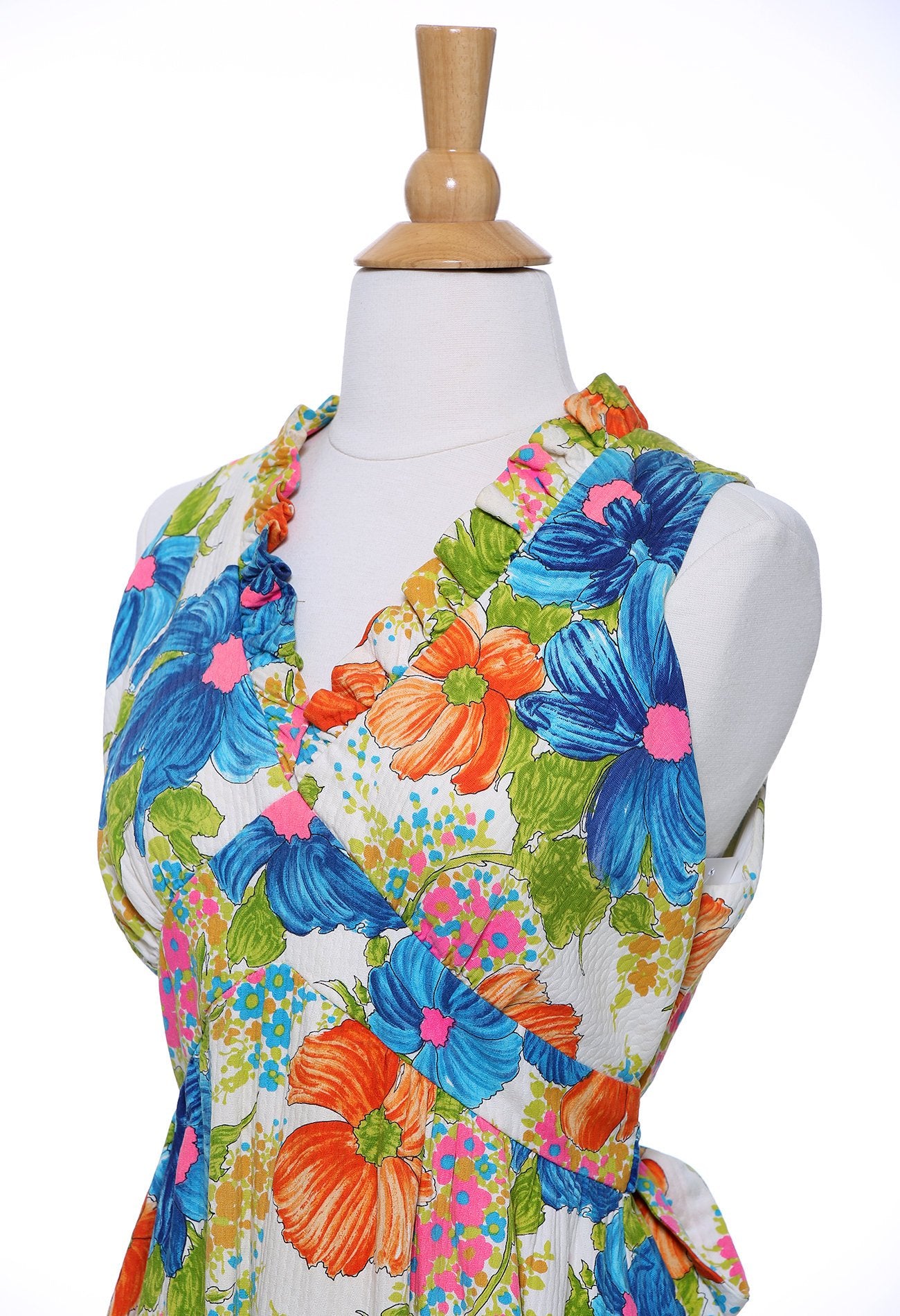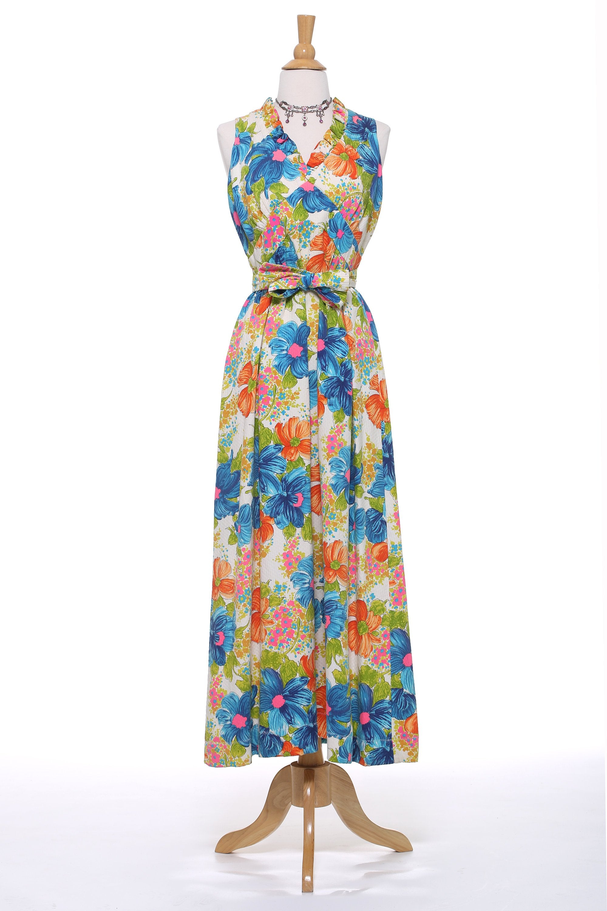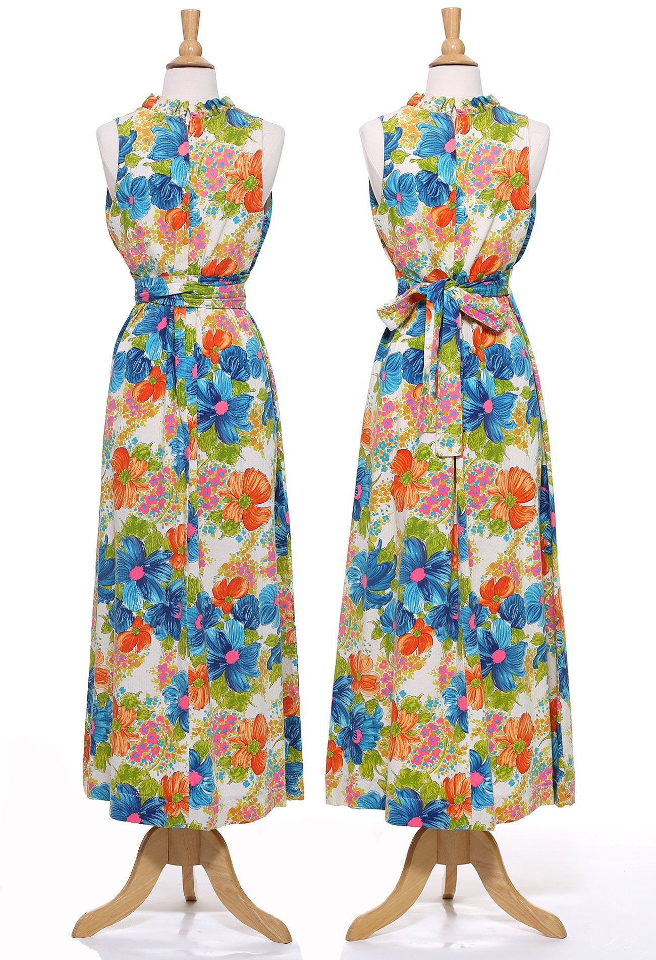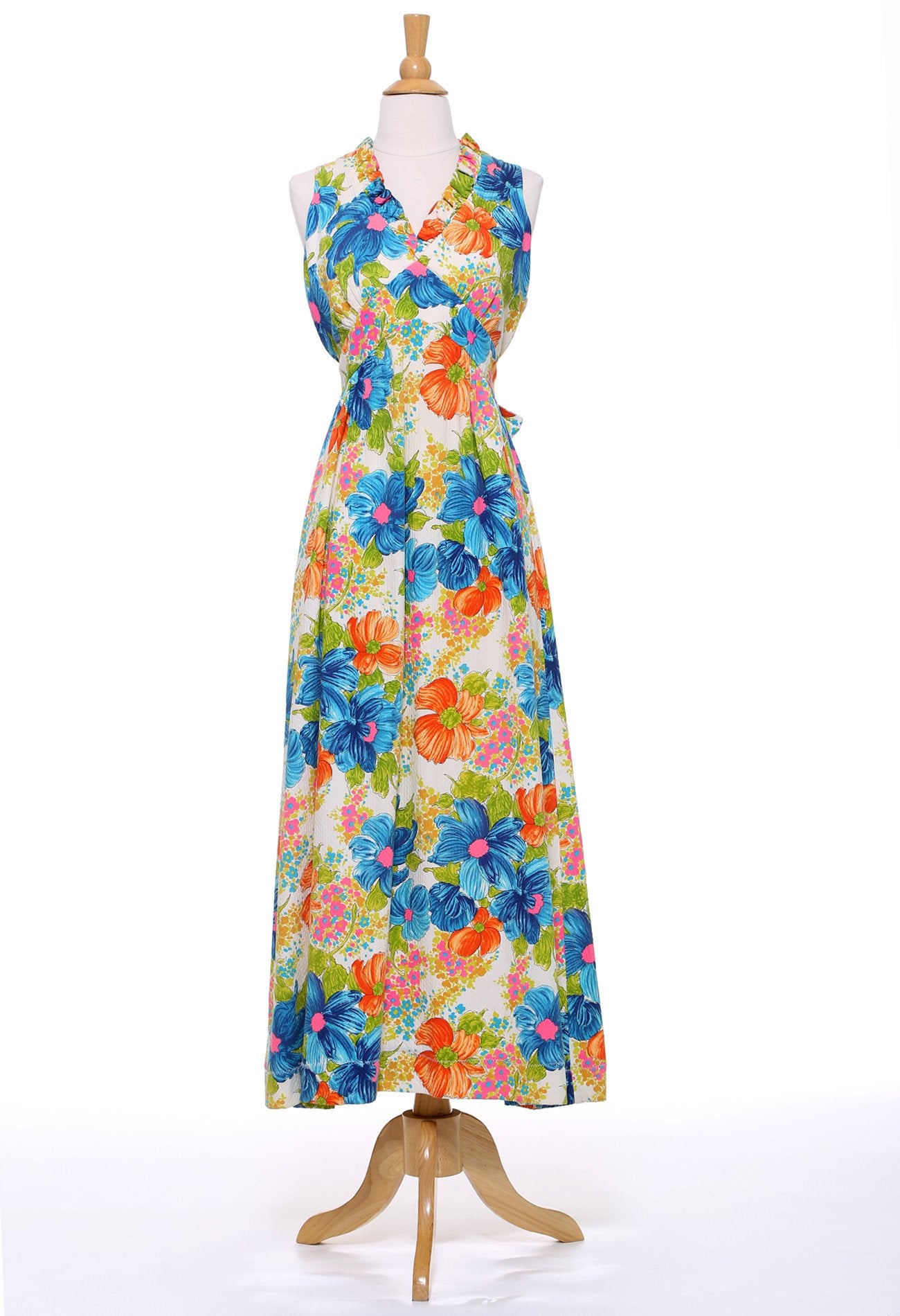 1950s White Turquoise and Orange Floral Maxi Dress with Ruffle V-Neck Collar. Sash can be wrapped to the front or tied at the back. Wear with a great pair of heels, or with a pair of Cowboy or Funky Tie Up Boots. Such a gorgeous happy print and so much fun to wear!