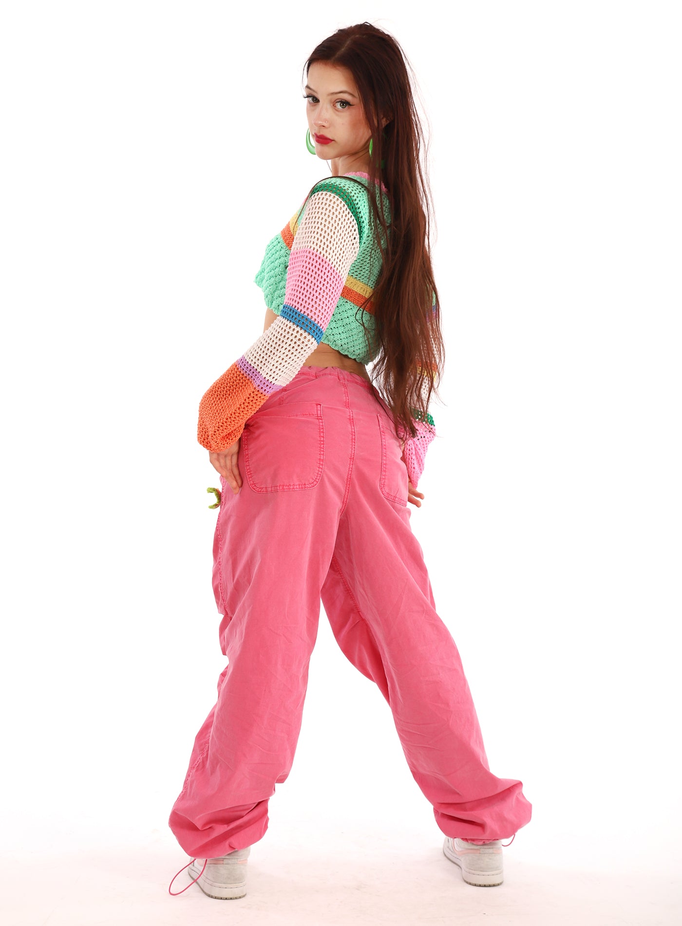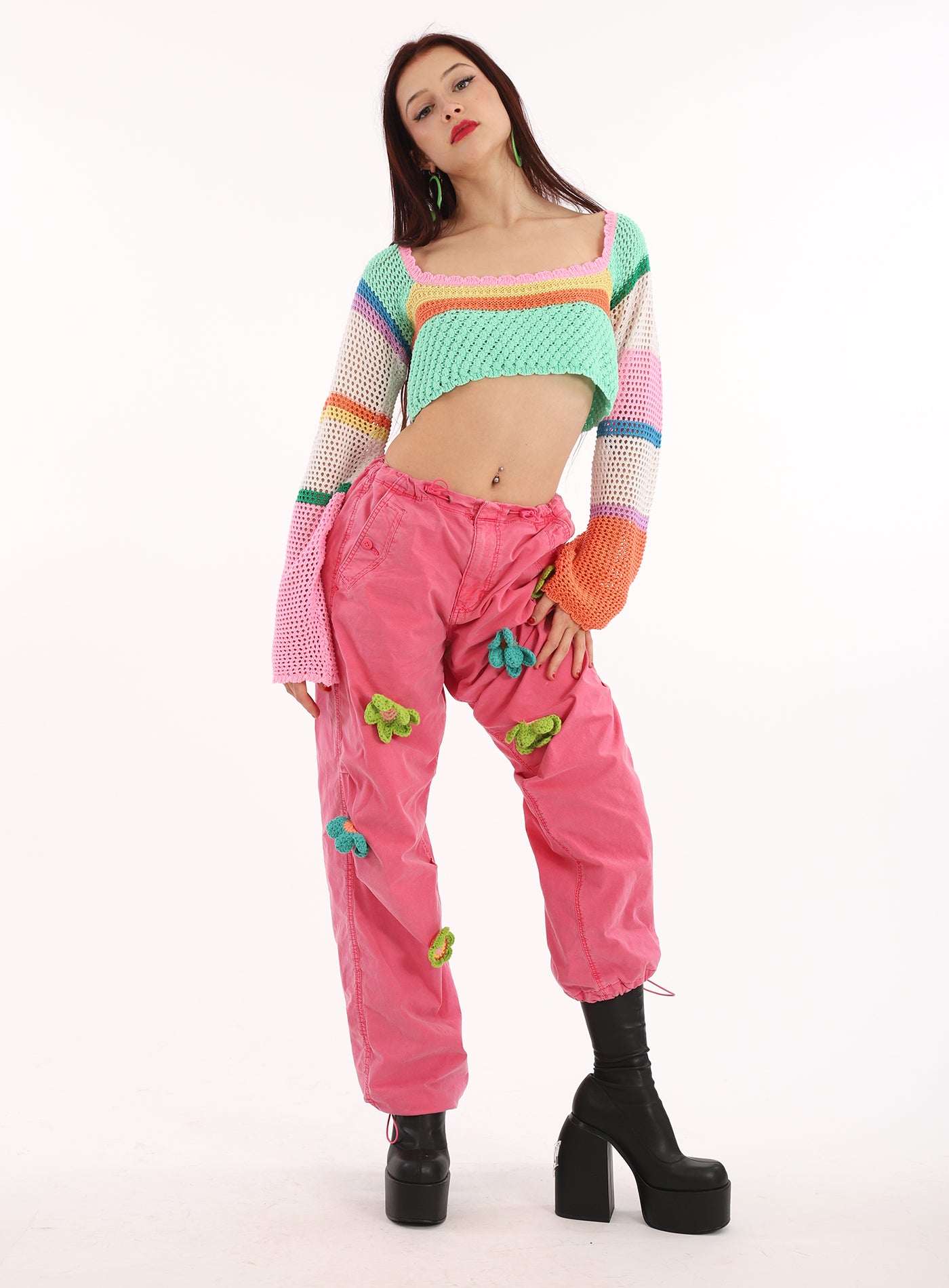 Vintage Dyed Pink Cargo Pants and Crop Top. Hand Dyed Pants with Crocheted Daisies in Shades of Lime Green and Turquoisey Blue. Pants Zip up the front with an elasticized waist and draw string to pull them in, and have draw strings and elastic at the hem of the pants. Pockets too on front and back! I am selling the Top and Pants together as an outfit because I think they are awesome together. It is a crochets Square neck Multi color Bell Sleeve crop top with poet sleeves that are extra long. The crop top has shades of Minty Green, Blue, Melony Orange, lavender and pink. Please check measurements to assure a proper fit on both items as they are not returnable. So many ways to wear both items. The top would look so cute under a pair of vintage Overalls too! The bottoms,. well, you can use your imagination and they are so comfy! The pants have some elastane in them so they do have some stretch.
