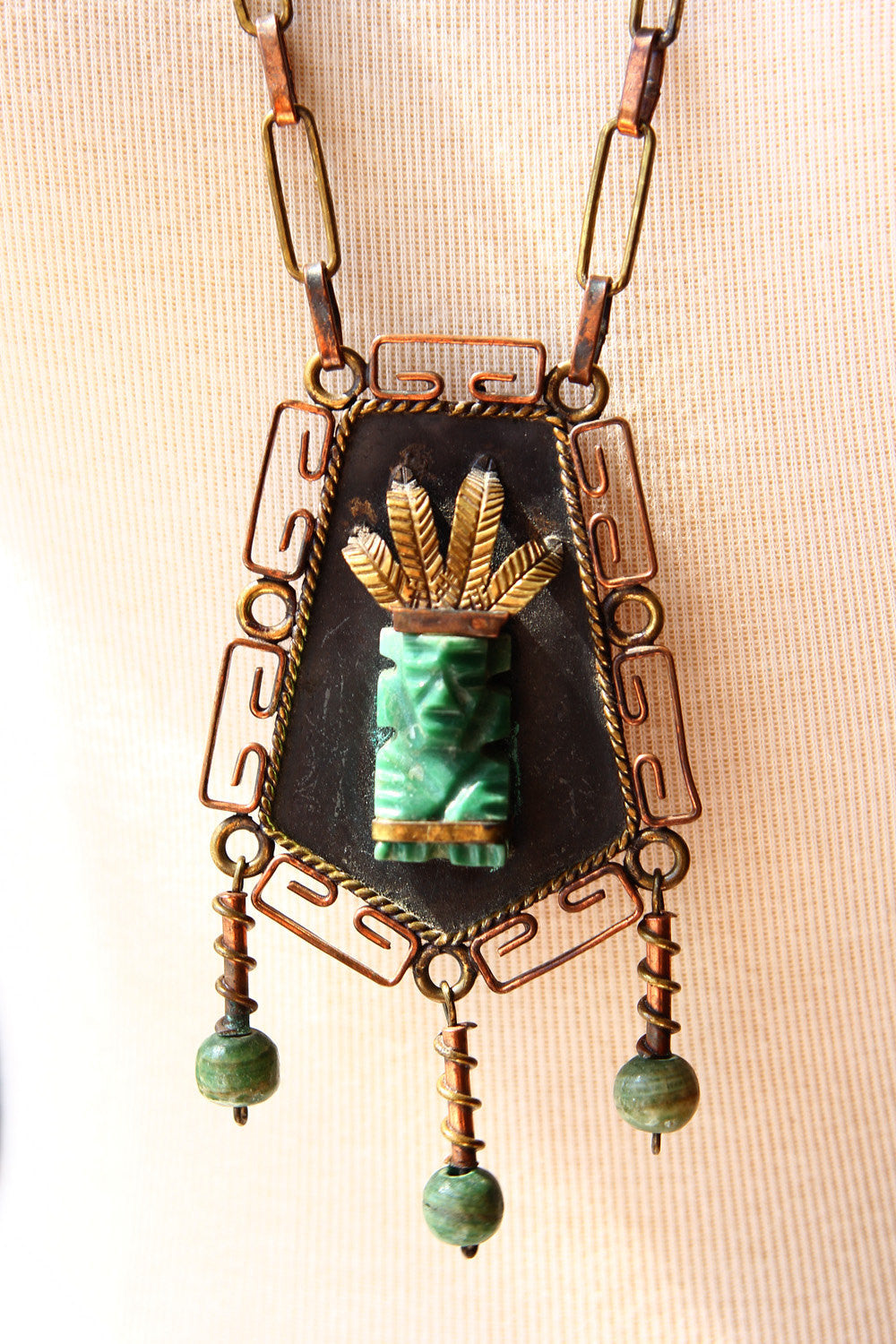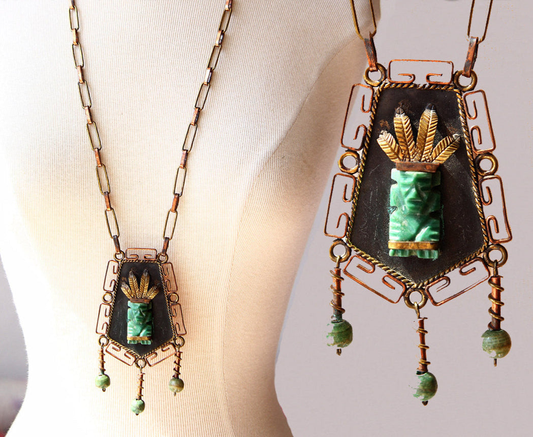 Vintage Marked Mexican Copper and Brass Long Chain Necklace with Jade like Aztec Mayan Man Pendant and Jade Beads from the 30s. Stamped Mexico. Hand Forged One Of A Kind Piece.