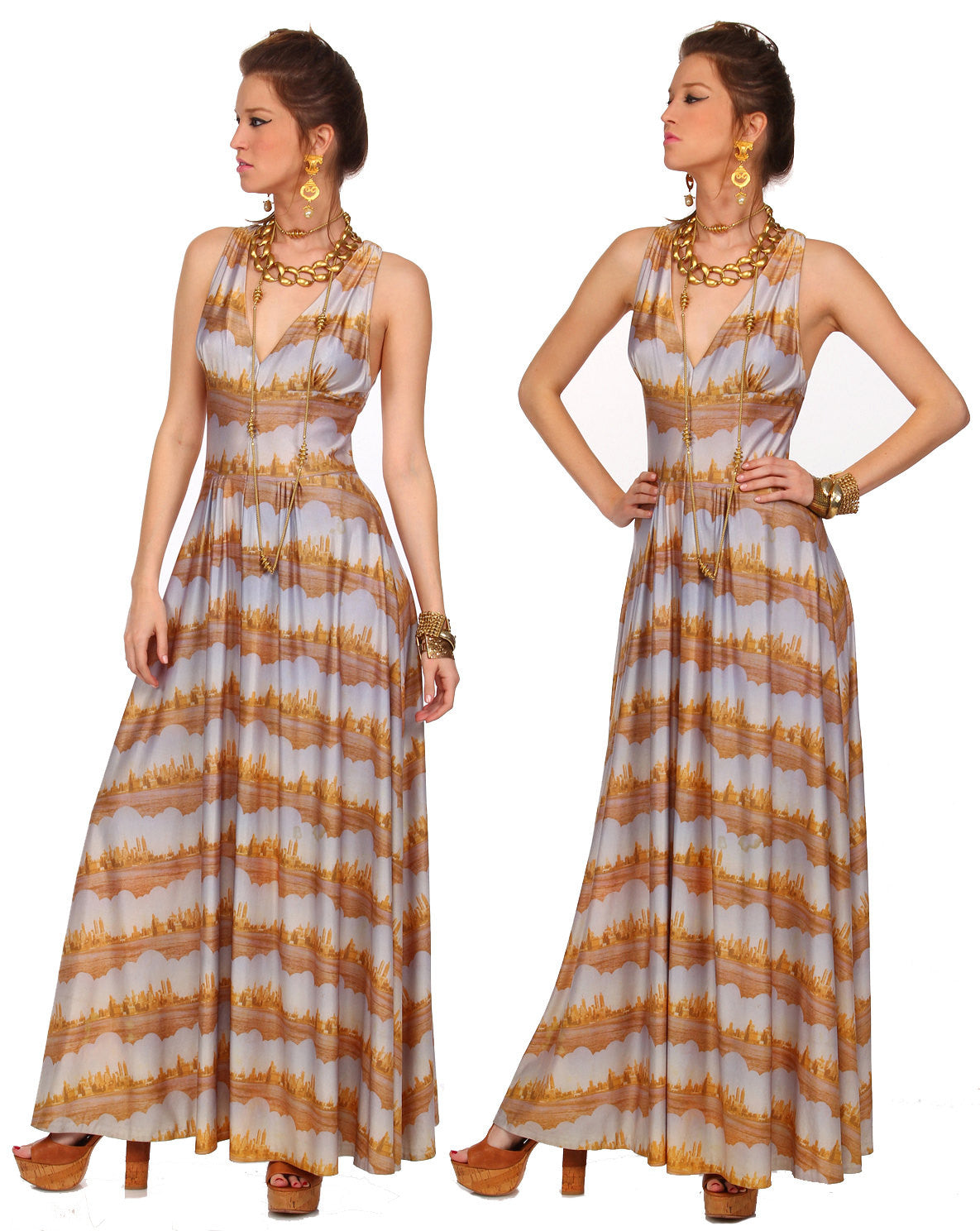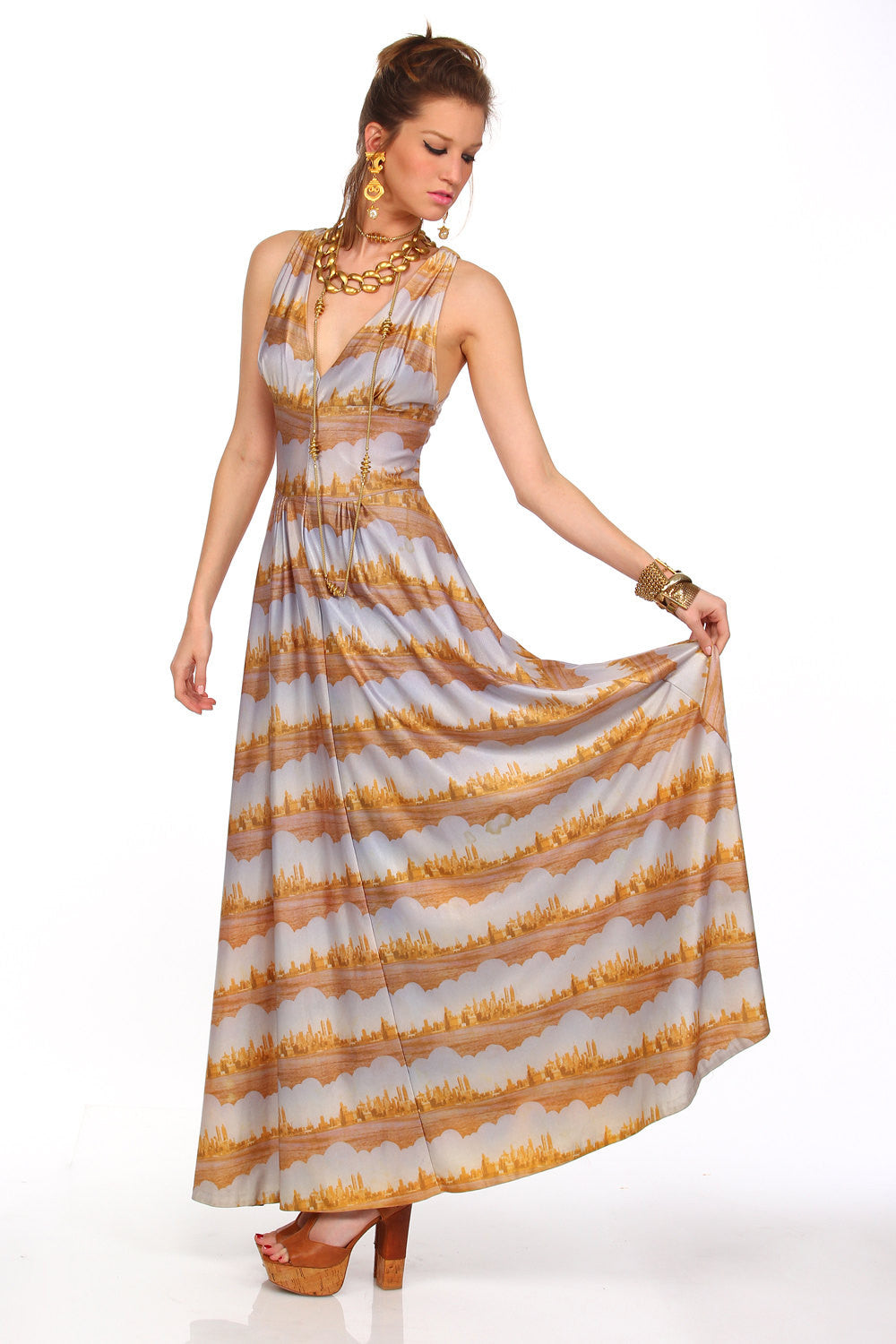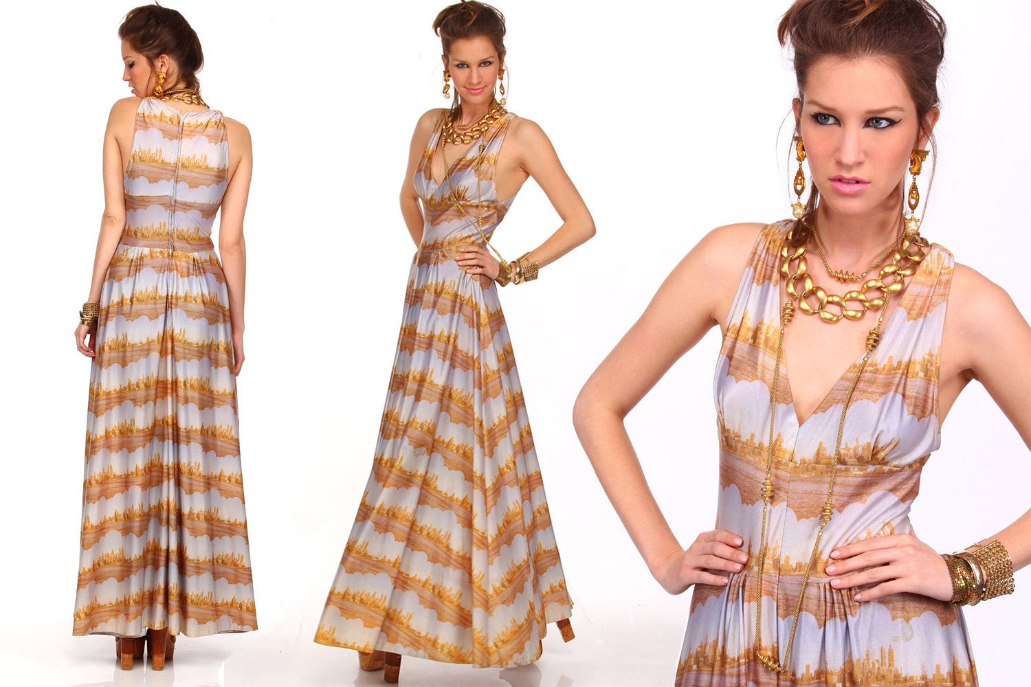 Step Out Into The Outer Stratosphere in Super Glam Style with this One OF A Kind Retro 60s SpaceAge Avant Garde Vintage Dress! The Fantastic Outer planetary Cityscape fabric has a light sheen to it. Dress it up as we did with lots of gilded gold, or dress it down. No matter how you wear it it's a Showstopper! A One Of A Kind Uniquely Fab Vintage piece.