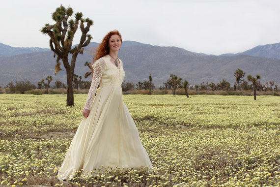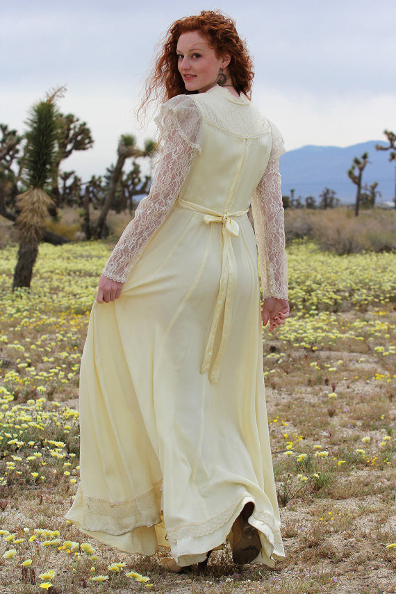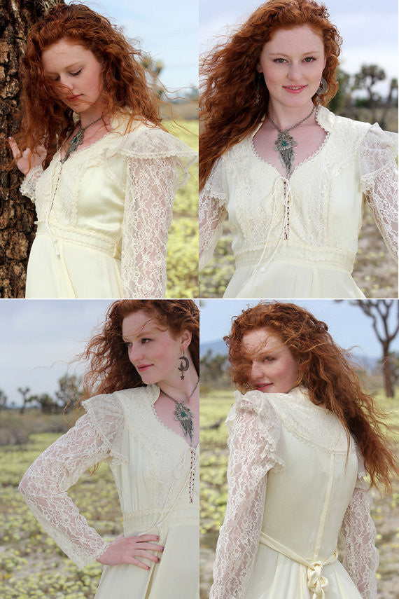 1970s Gorgeous Lace Bohemian Hippie Wedding Dress with Tie Up Lace Bust, Sheer Lace Sleeves with Pearl Buttons, amazing Massive Skirt with Lace and Satin ribbon trim at hemline, back zipper and long tie at the back.The upper back of the dress is satin with lace along the shoulders, the balance of the dress is reversed satin with a lovely crepe like texture. Bohemian Romance all the way! Can you imagine how this incredible dress will whirl and twirl and move with you and your mate along the dance floor??? Ahhh... Bohemian Romance that defies words!