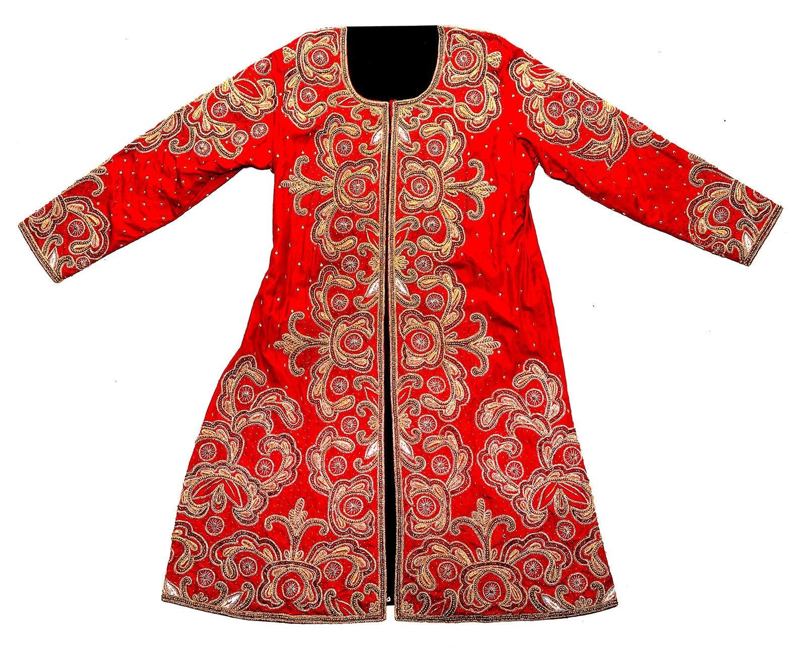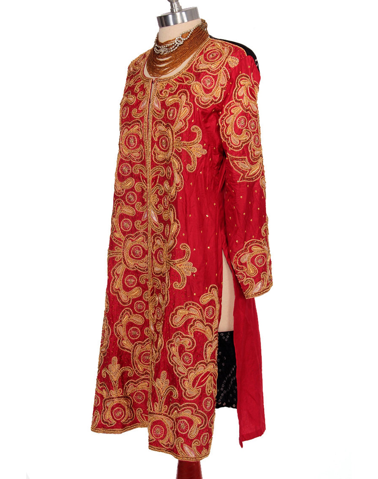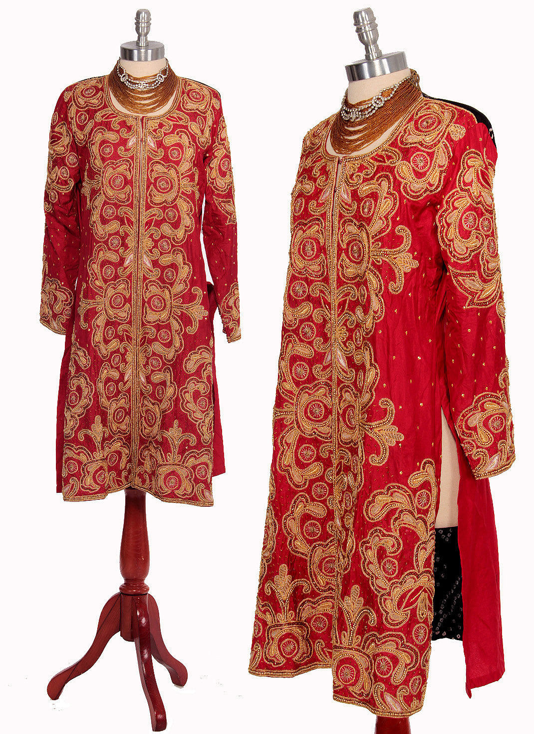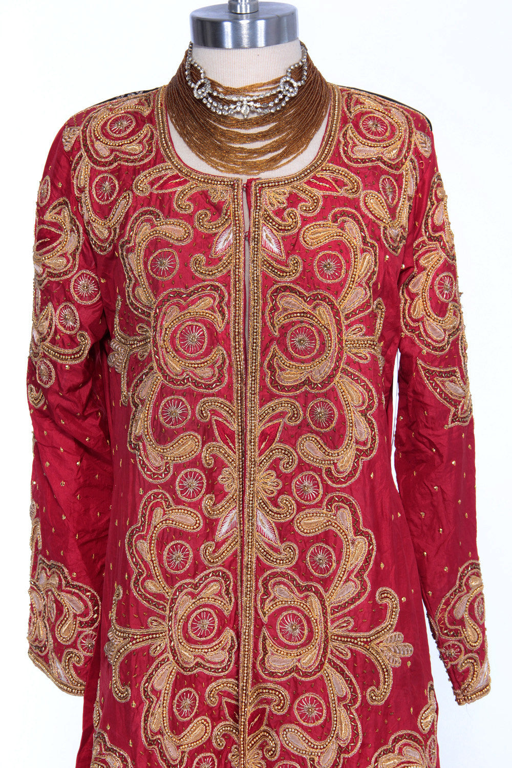 Unique 1970s One of A Kind Red and Gold Heavily Beaded and Embroidered Silk Jacket with Batik inset at back. Swirls and Twirls of intricate beading and hand work. This is truly a work of art. Amazing with a pair of black jeans and boots as with fancy evening wear. Slit up sides, four hook closures at top of garment. One of the most amazing pieces we have come across! Such a Unique find that you will treasure like a piece of fine jewelry!