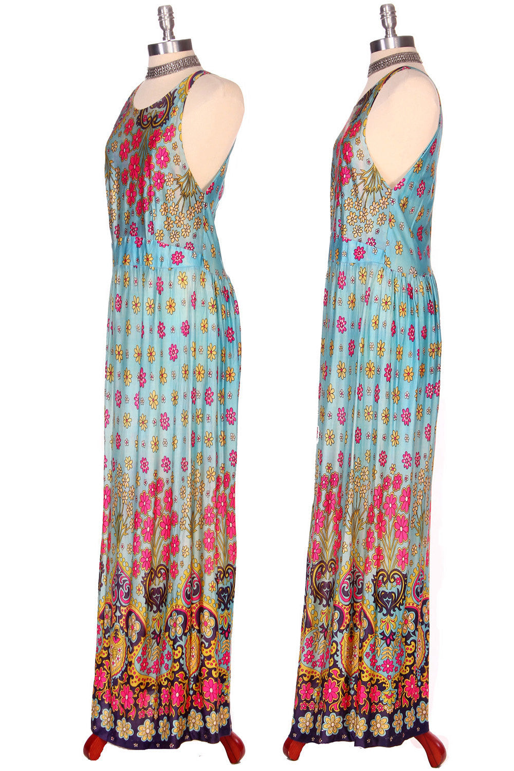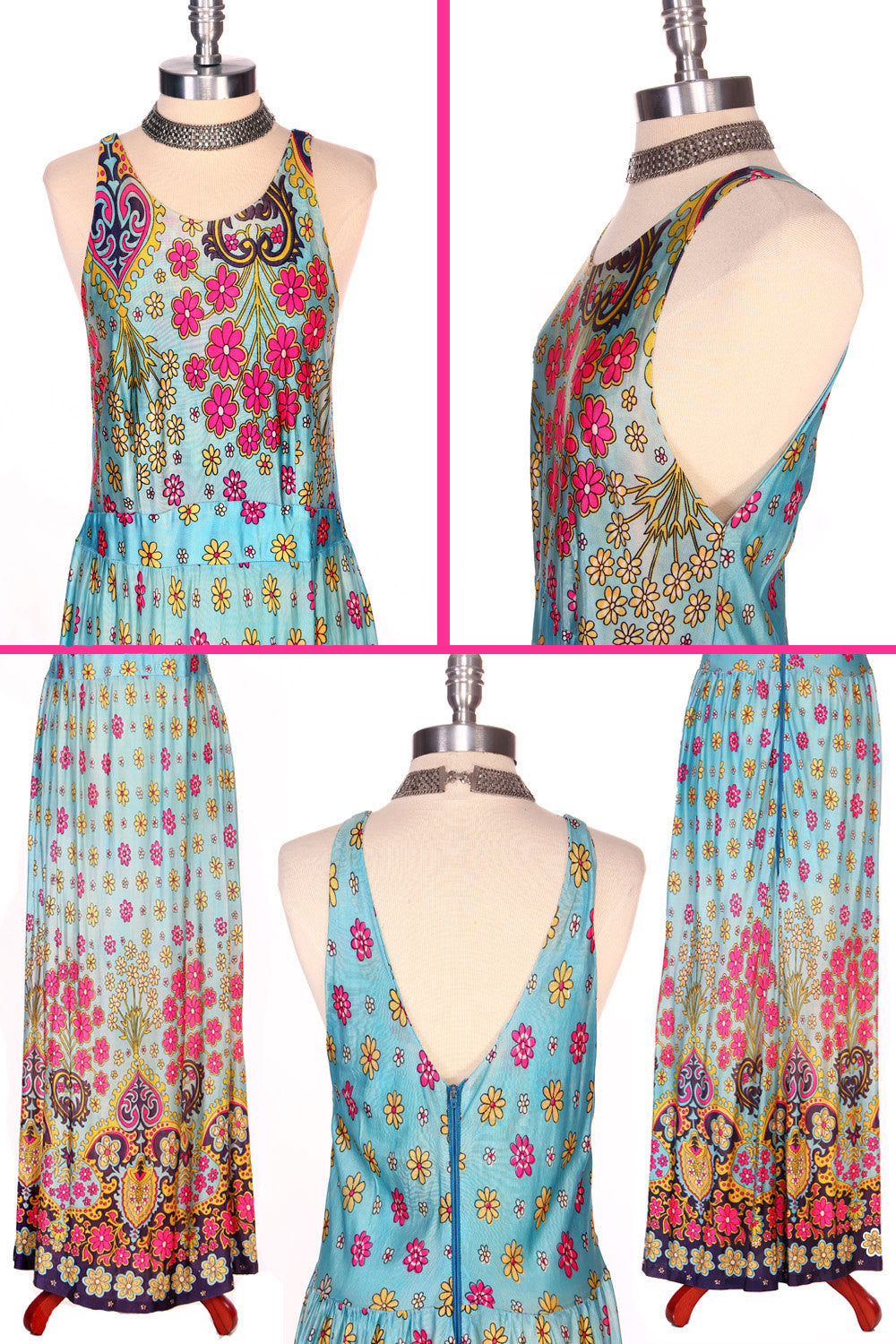 Rock out in this Silky Soft Vintage 1970s Faded Turquoise Slinky Mod Flower Power Maxi Dress! Faded perfectly with age for a great retro look. So cozy you'll want to sleep in it! Great dress to throw into your suitcase for a weekend away. Amazing multitude of floral patterns. Sexy and sleek in all the right places.Lovely low back, Zips up the back, and falls gracefully around you. Such a kool and fabulously kookie find.