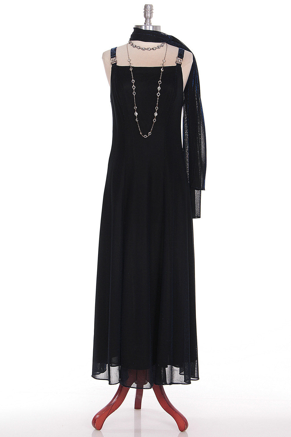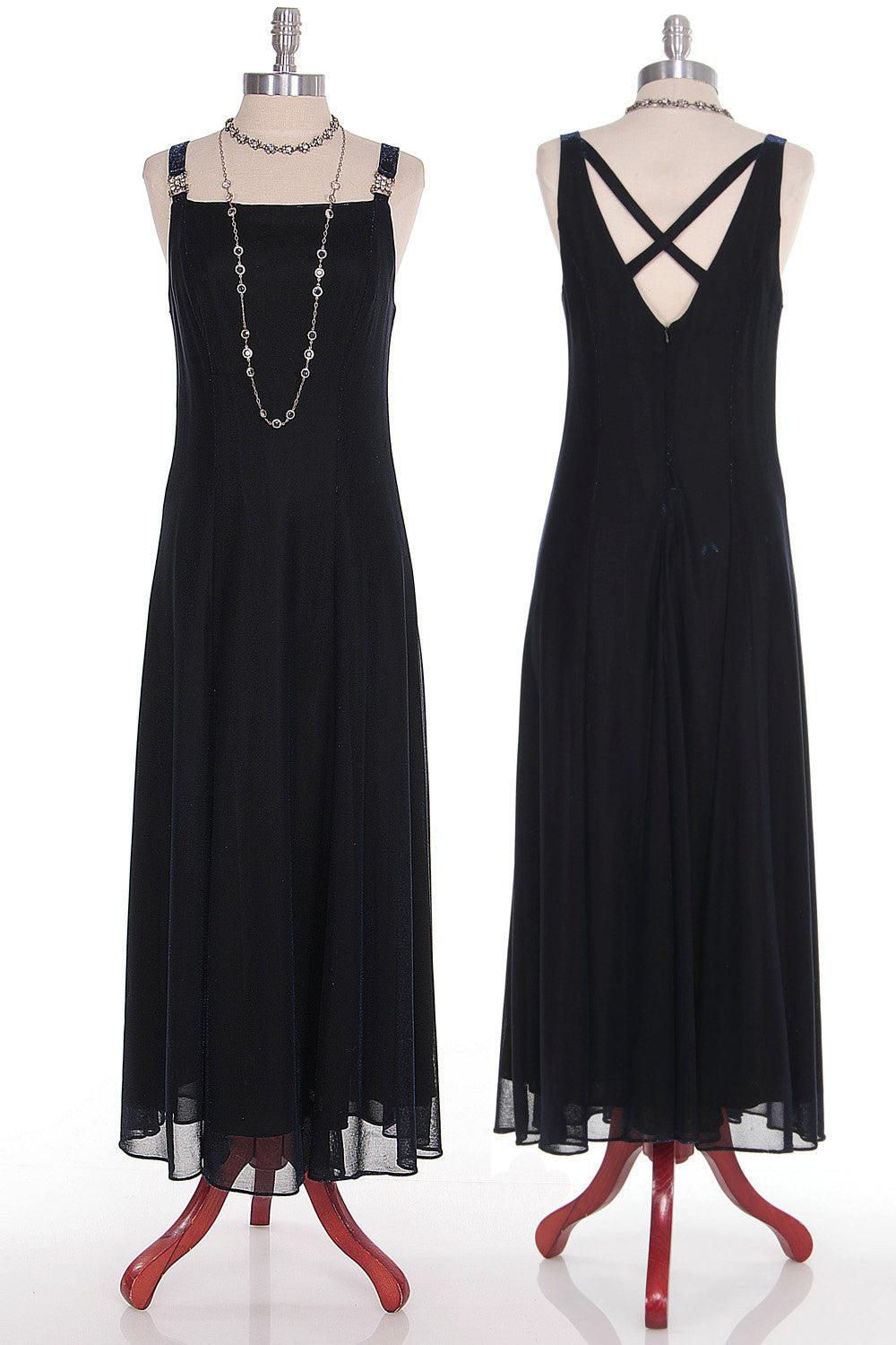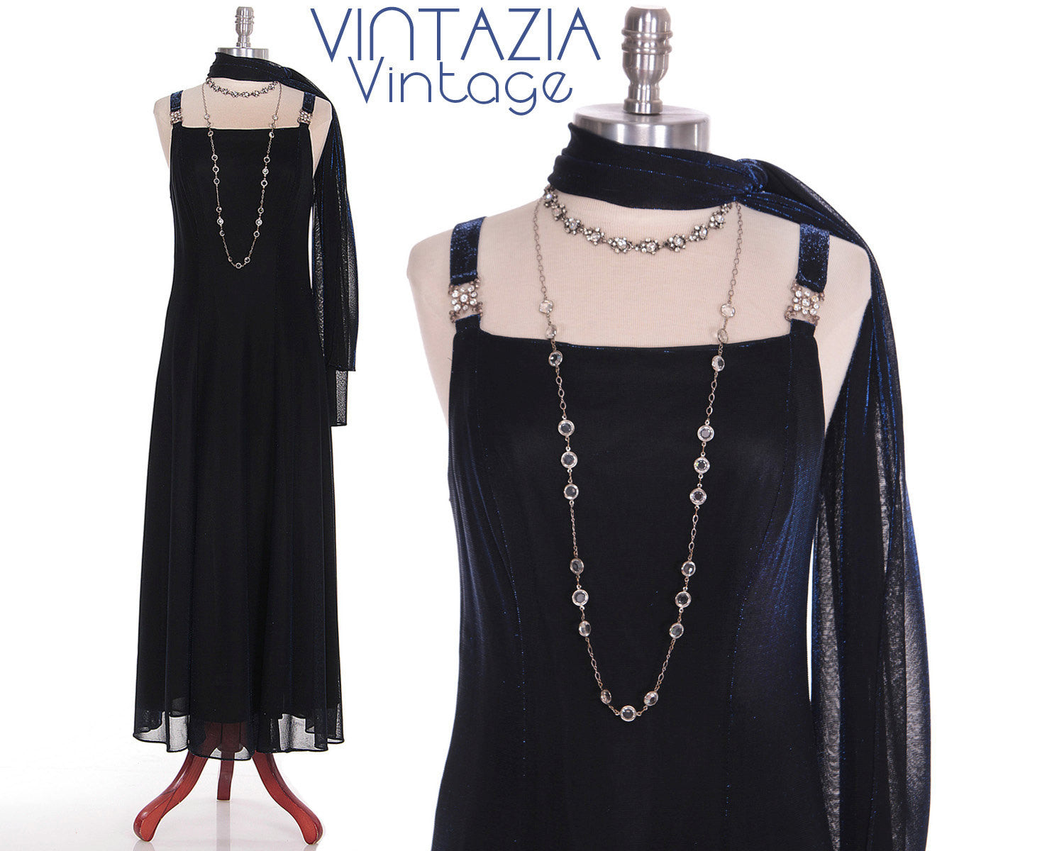 Vintage 1980s Royal Blue with Black Undertones Metallic Maxi Dress with Scarf and Criss Cross Deep V Open Back Suspender Straps connected with Rhinestone Clasps. Shimmering with Super sexy back. Simple, slinky and chic! Wear with scarf on neck or wrap it around your hair!