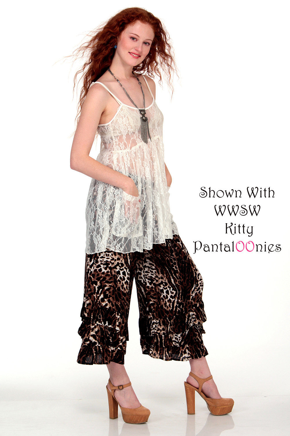Sheer Lacey MICA Dress. Stretch Lace Bohemian Babydoll with Slouchy Pockets and Adjustable Straps. Wear as shown with WWSW Lacey or Kitty PantalOOnies, and with our Rosey Duster. Great over shorts or jeans or on it's own. Great with anything in your closet when you want a bit of lace poking through! Super versatile, feminine and hip. Made of soft stretch nylon lace. Mica Dresses all have adjustable straps on sliders.