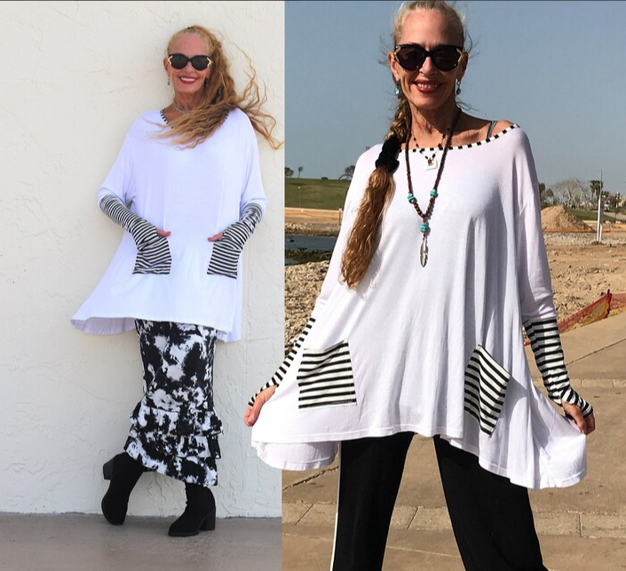 My White and Black "Stripies"" Flare Top with Striped Cuffs, Pockets with matching Striped trim around the neckline, and of course the cuffs have Thumbholes! The Back is solid white. So much fun to wear, in the Softest Rayon Spandex Material, and the fit is classic Frenchie! Just the perfect top to go with all my Black and White goodies, and you will definitely have plenty in your own closet to match with this adorably comfy top. So flattering. Covers you in all the right places, and the wide bottom gives the top beautiful movement and coverage. Comes in One Size that is sure to fit so many women! I show it here with my Susie Stripe PantalOOnie's and my Splotchy Black and White PantalOOnie's, but fab with a pair of white or black jeans, or skirts.