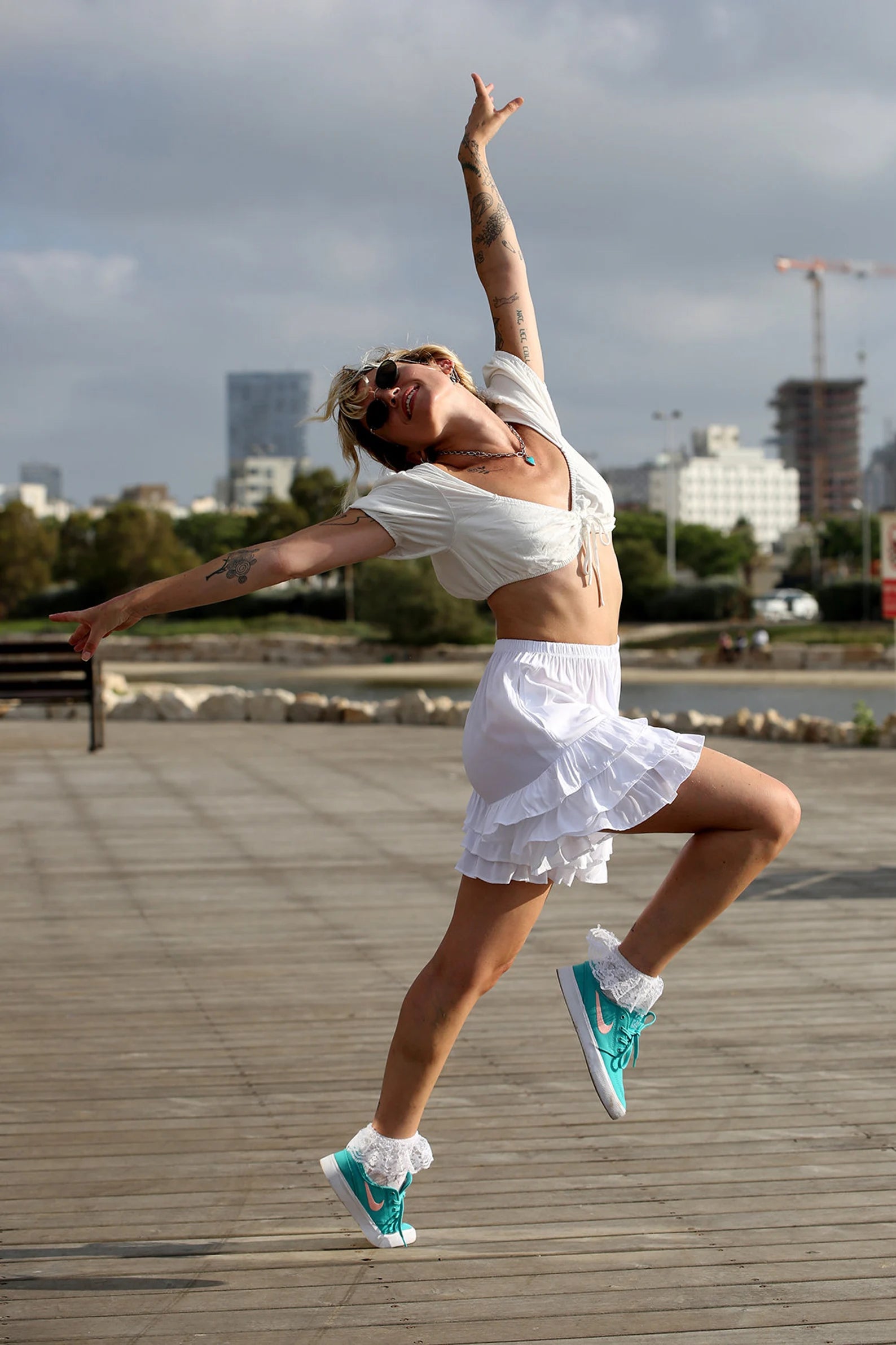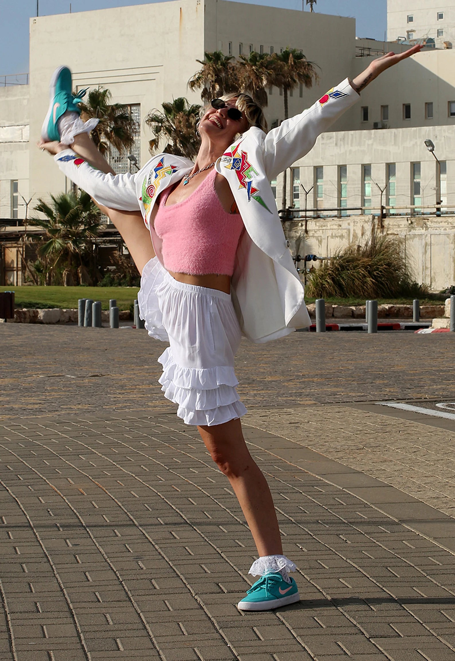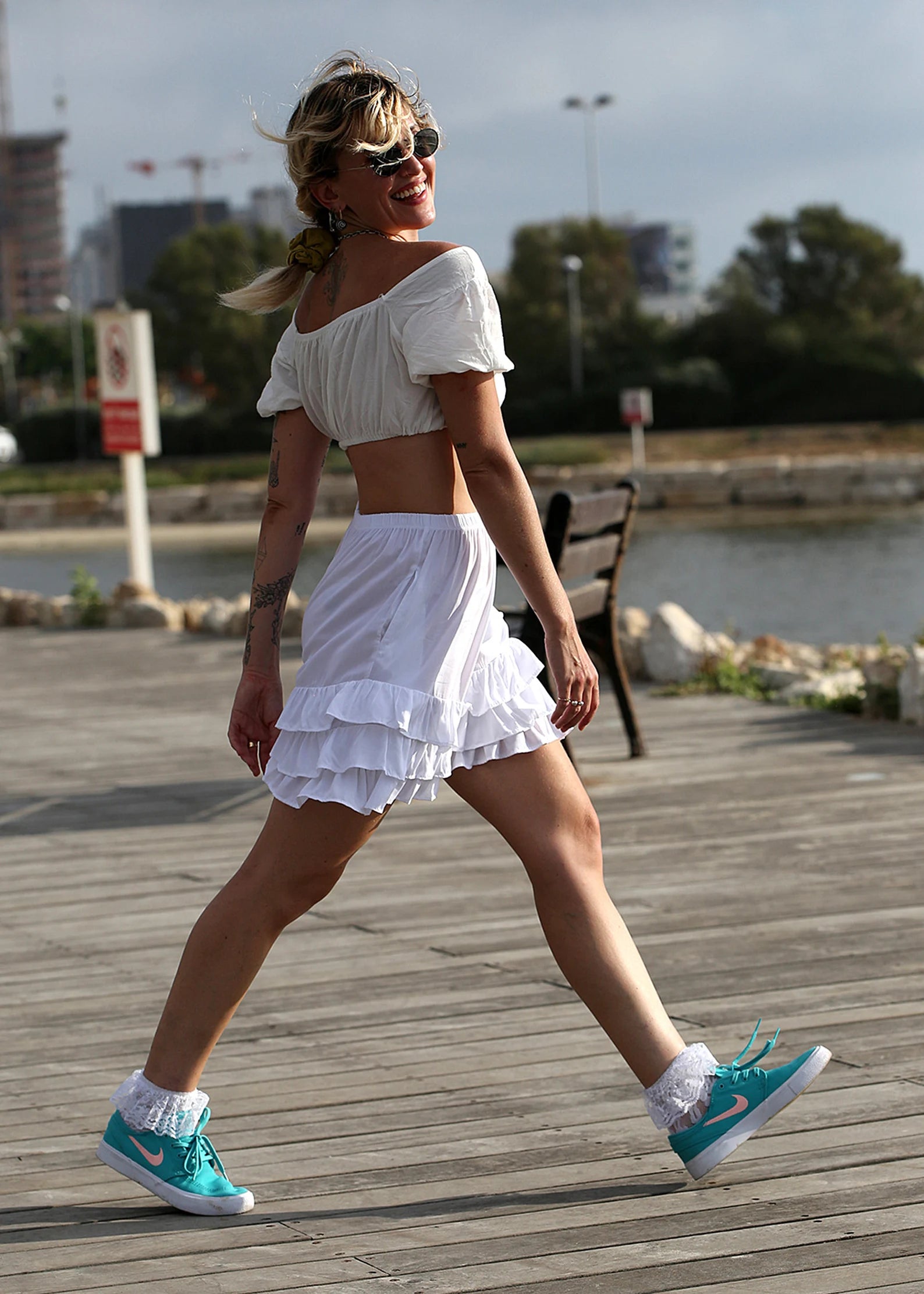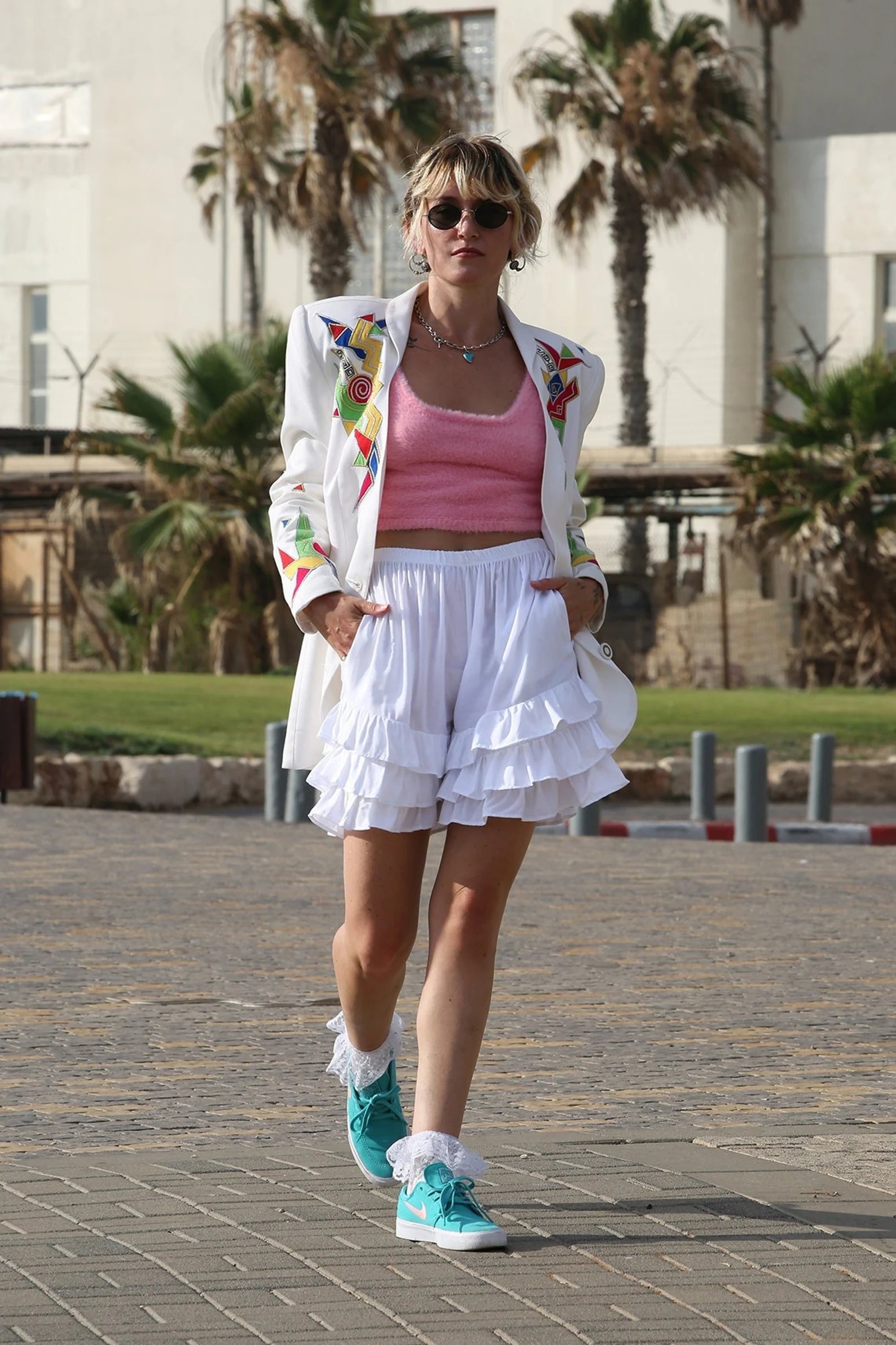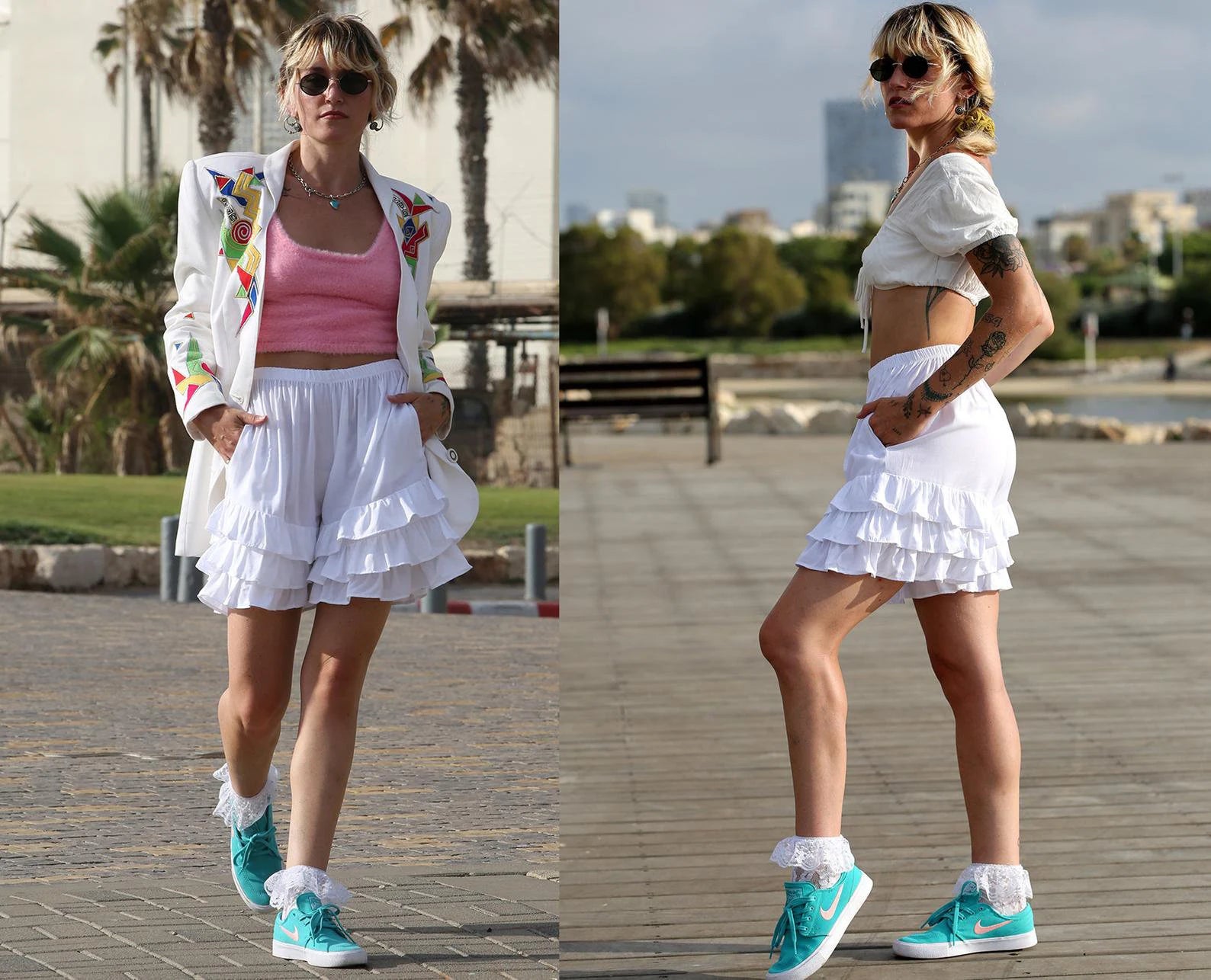 White Ruffled ShortalOOnie Bloomer Shorts! Comes in two sizes. Petite to Medium. Large to Extra Large. The P-M is shorter than the L-XL and honesty even Small to Medium Girls can wear the larger version if you want them a few inches longer. They have an elasticized Waist, and pockets! We love pockets! Great with a crop top, under a short dress or top with the ruffles poking out, perfect to throw over your bathing suit, and then dress them up for a night out with a pair of heels or boots. Super cozy and versatile and FUN! Please check the measurements to assure you get the fit you want. Perfect up on your waist or slung down a bit on the hips. Check them out!