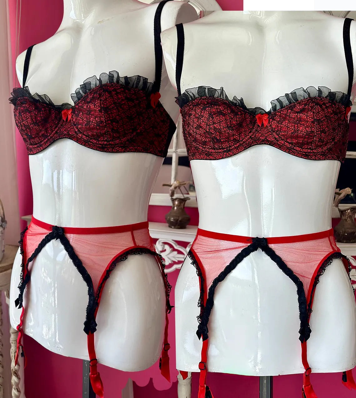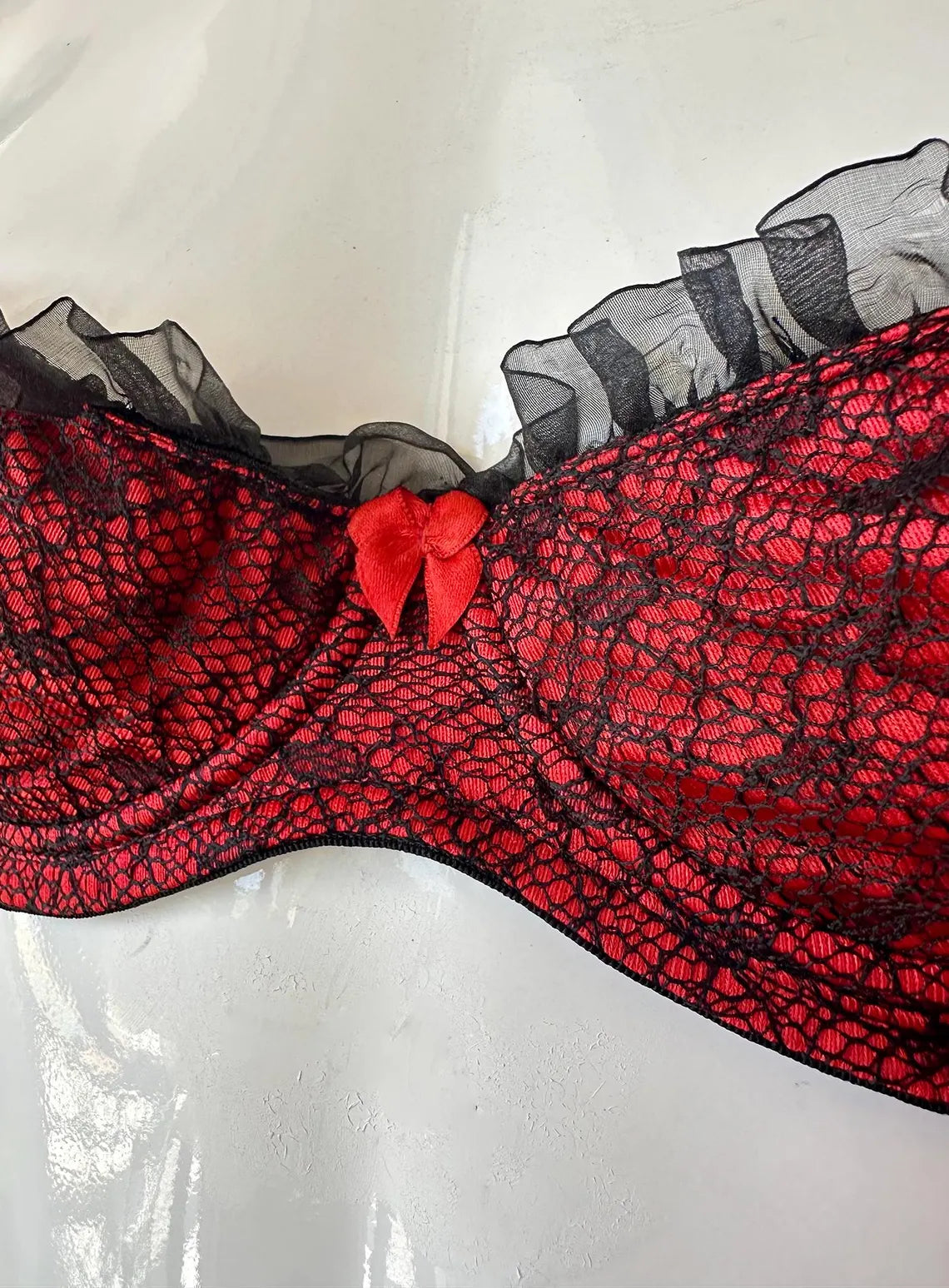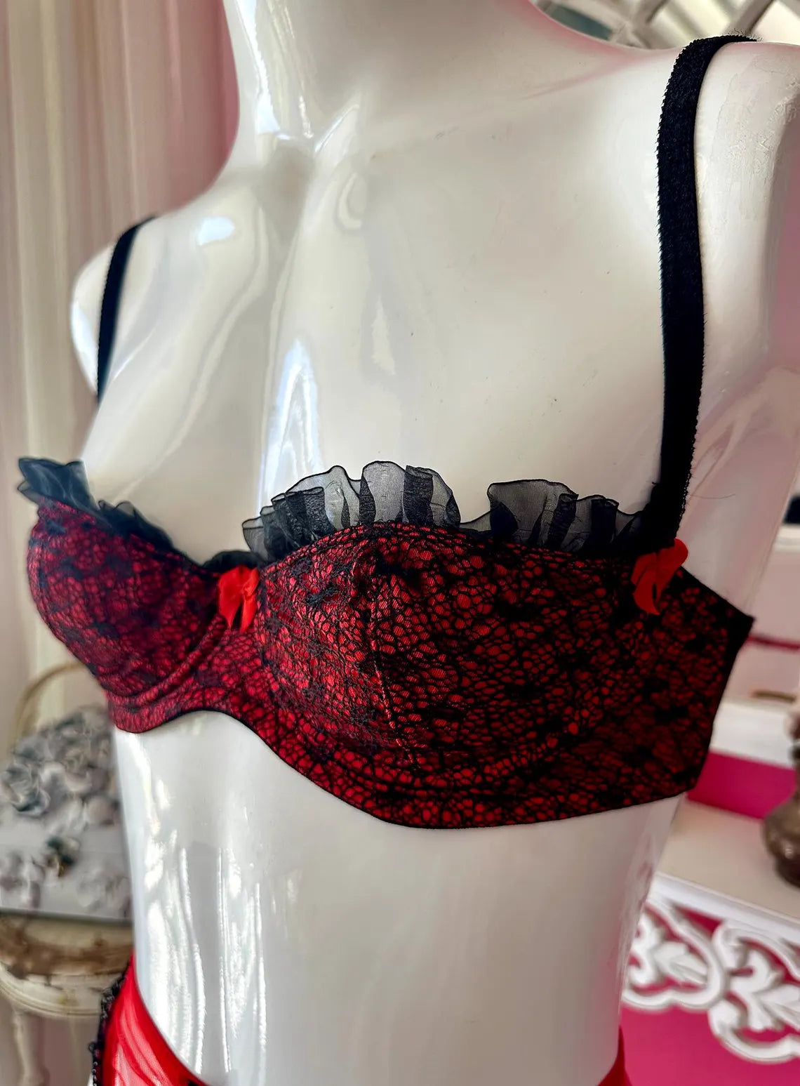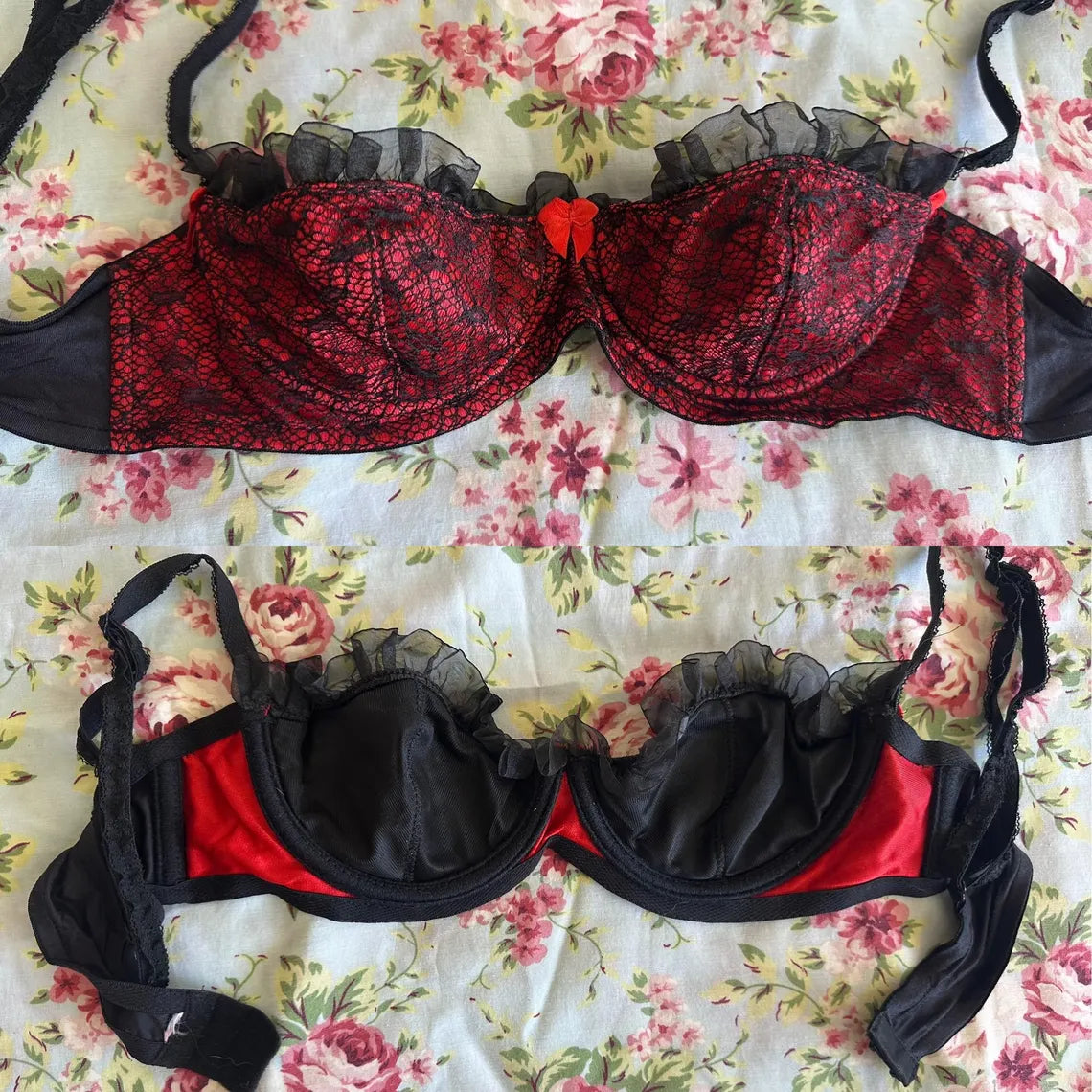 Vintage 1990s Red and Black Lace Agent Provocateur Balconette Bra and Garter Set. Bra is 34B with Red Satiny Fabric with Black Lace Overlay, Chiffony Ruffle at top, and Red Bow at Center Breast, and Lacey Adjustable Straps with three sets of Hook and Eyes. Garter has a non-stretch Netted material with Black Lace Trim, and Bows at Center and at top of garter straps , slip through hook at back of garter on elasticized waistband. There is no label on either piece because I used these items once for a Photo shoot for Agent Provocateur.