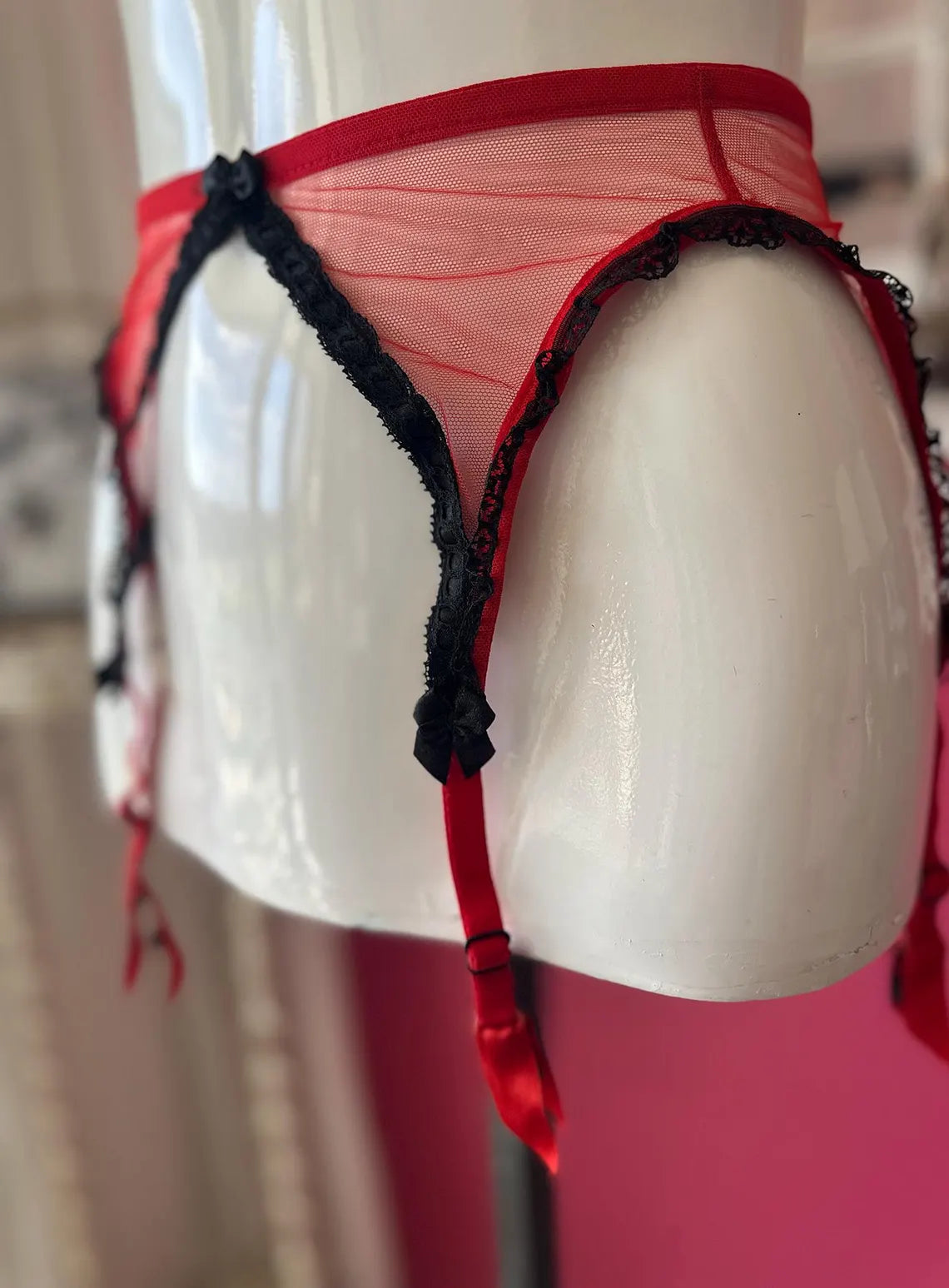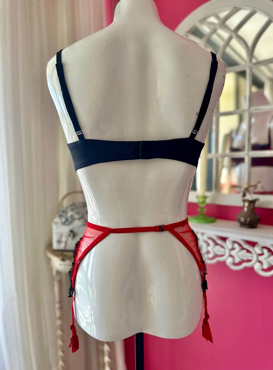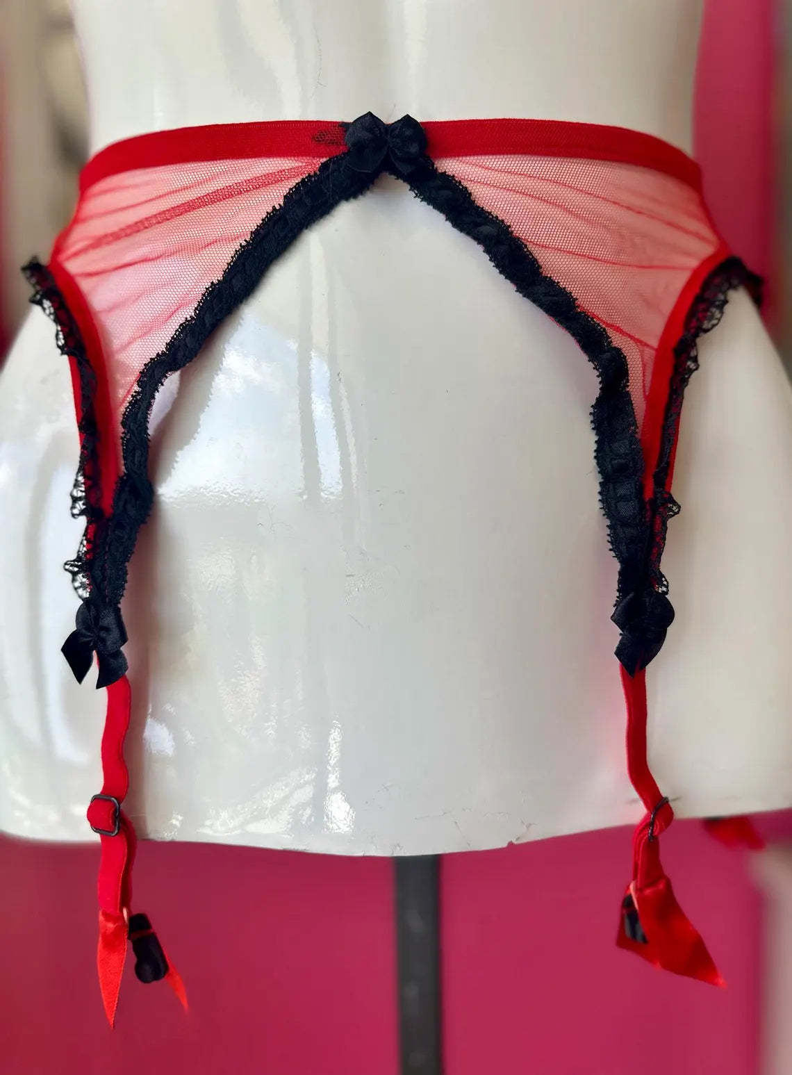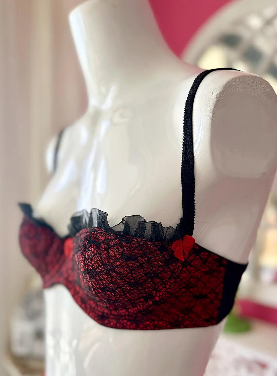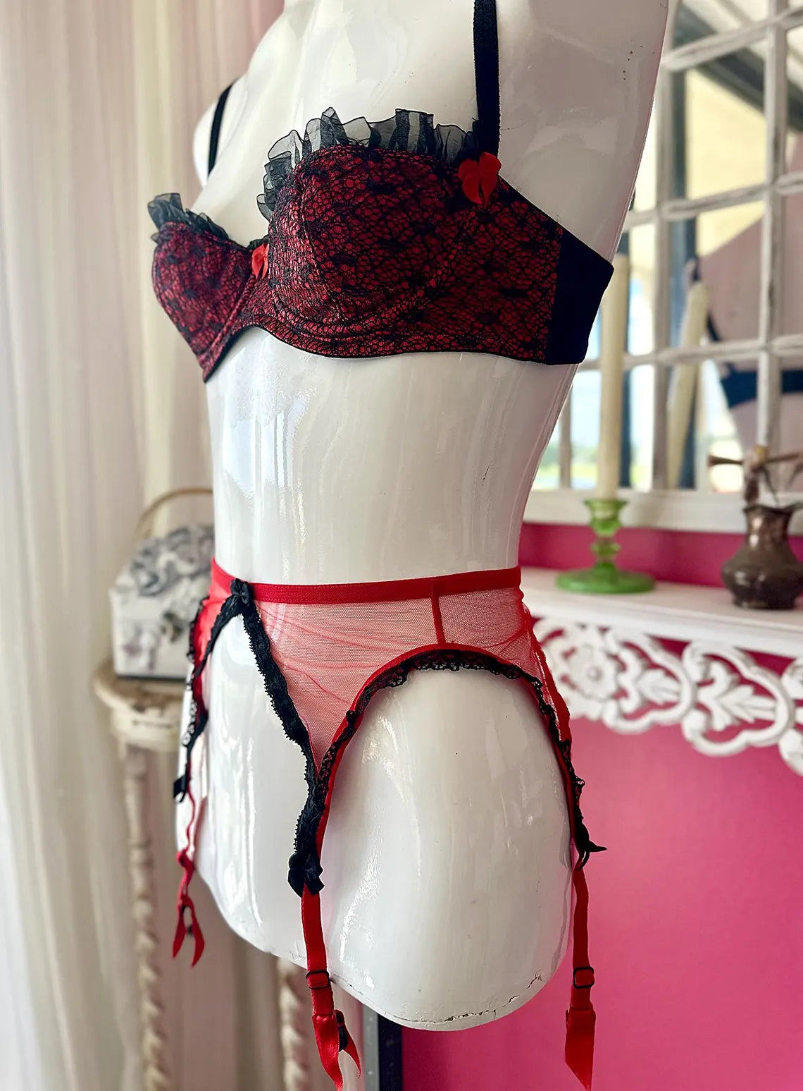 Vintage 1990s Red and Black Lace Agent Provocateur Balconette Bra and Garter Set. Bra is 34B with Red Satiny Fabric with Black Lace Overlay, Chiffony Ruffle at top, and Red Bow at Center Breast, and Lacey Adjustable Straps with three sets of Hook and Eyes. Garter has a non-stretch Netted material with Black Lace Trim, and Bows at Center and at top of garter straps , slip through hook at back of garter on elasticized waistband. There is no label on either piece because I used these items once for a Photo shoot for Agent Provocateur.